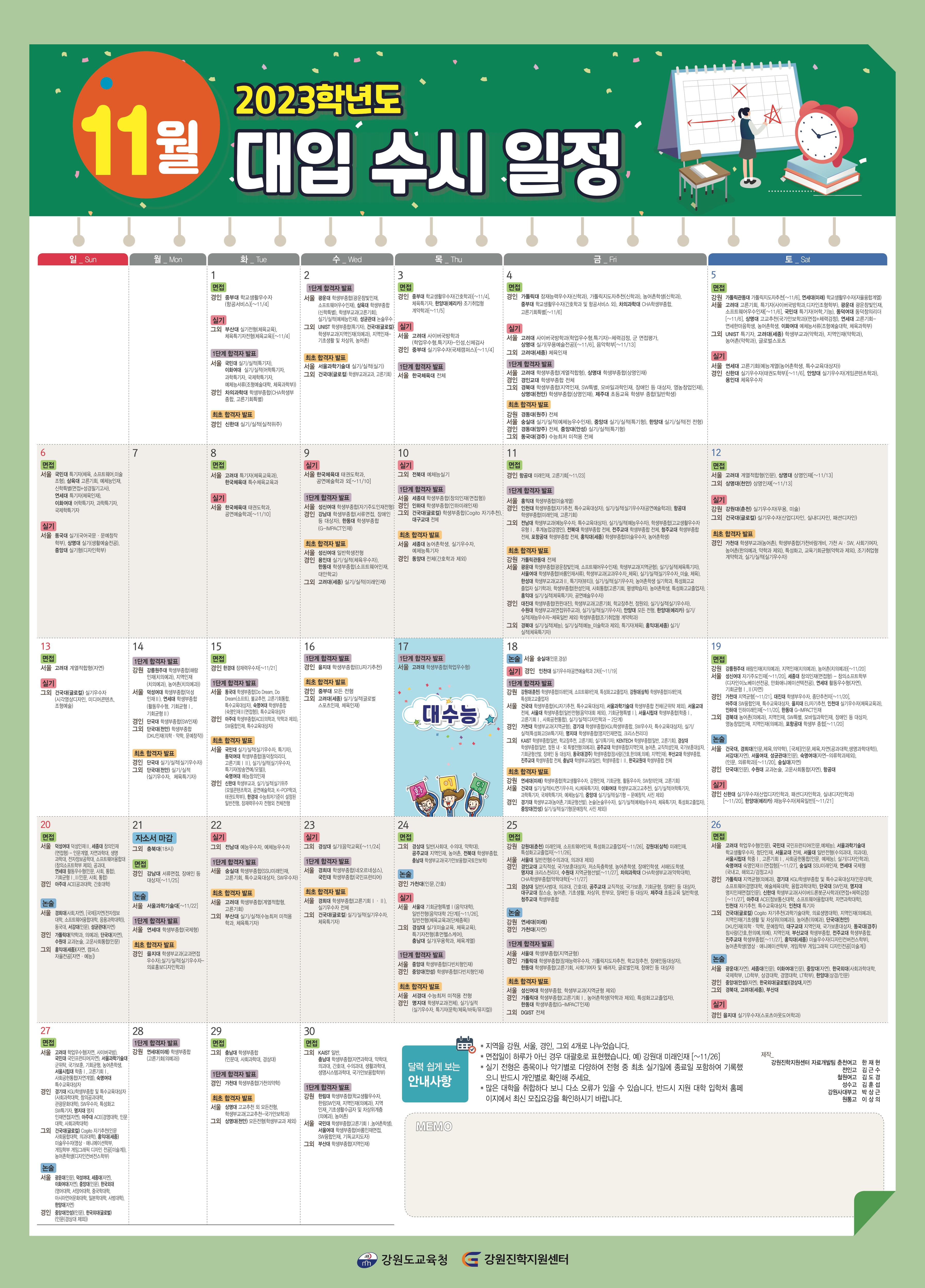 2023학년도 대입 수시 일정 - 11월 횐님들 안녕하세영! 이제 다음 달이면 수학능력시험을 보게 되겠네영. 11월은 수능시험 이외에도 논술이나 면접 등 일정이 매우 빡빡한 달이에영. 미리미리 일정을 체크해서 꼼꼼히 대입 준비를 합시다. 아래 자료는 강원도교육청에서 만든 자료여서 대학들이 서울, 경인, 강원으로 분류돼 있어영. 일정은 수시로 바뀔 수 있으므로 각 대학 홈페이지에서 다시 한 번 확인해 보시기 바라영.💌