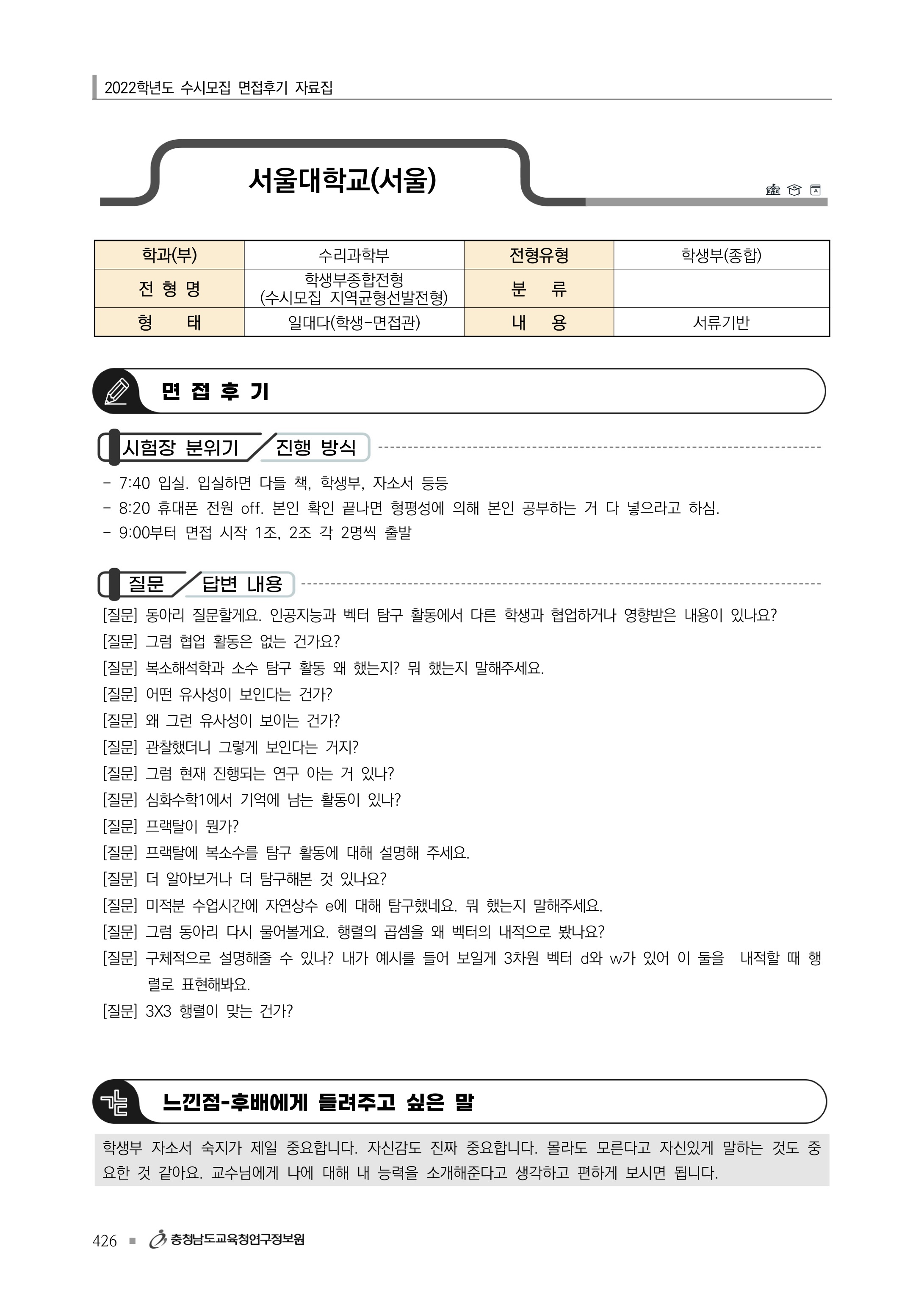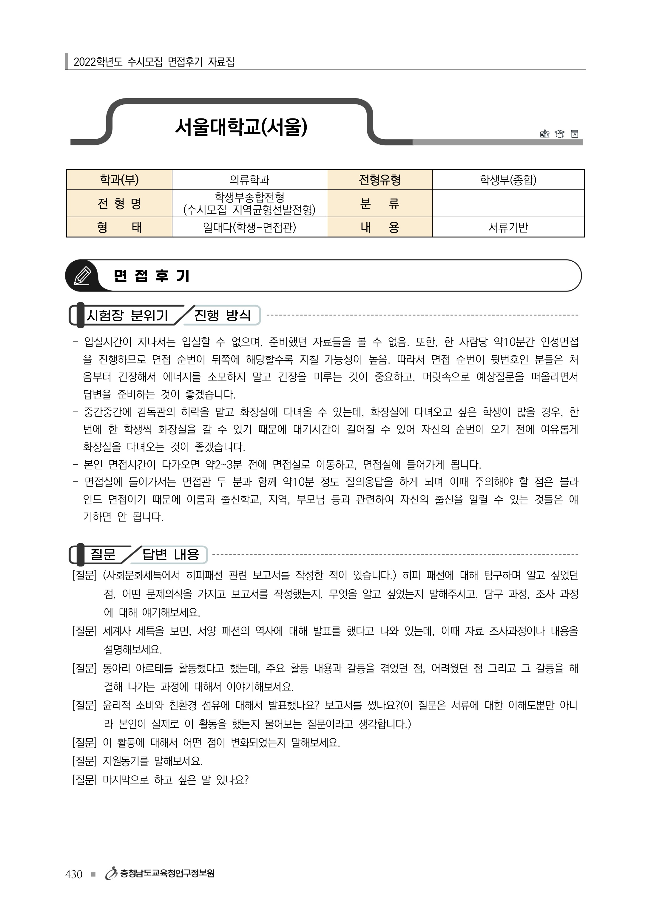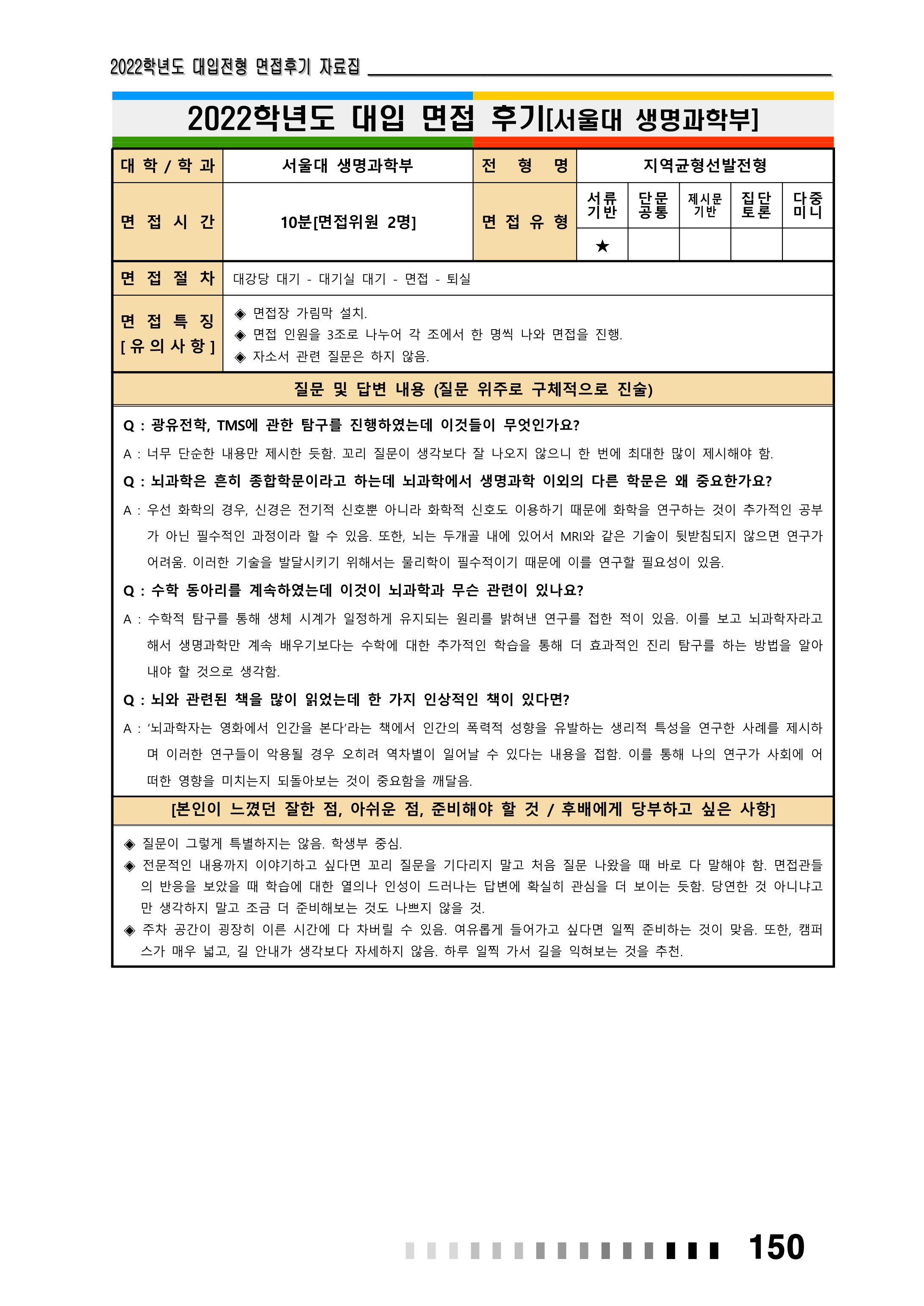 횐님들 안녕하세영! 오늘은 2022학년도에 서울대학교에 합격한 학생들의 면접 후기를 살펴보려고 해영. 서울대학교 면접에는 서류기반 면접과 제시문기반 면접이 있어영. 서류기반 면접은 원서