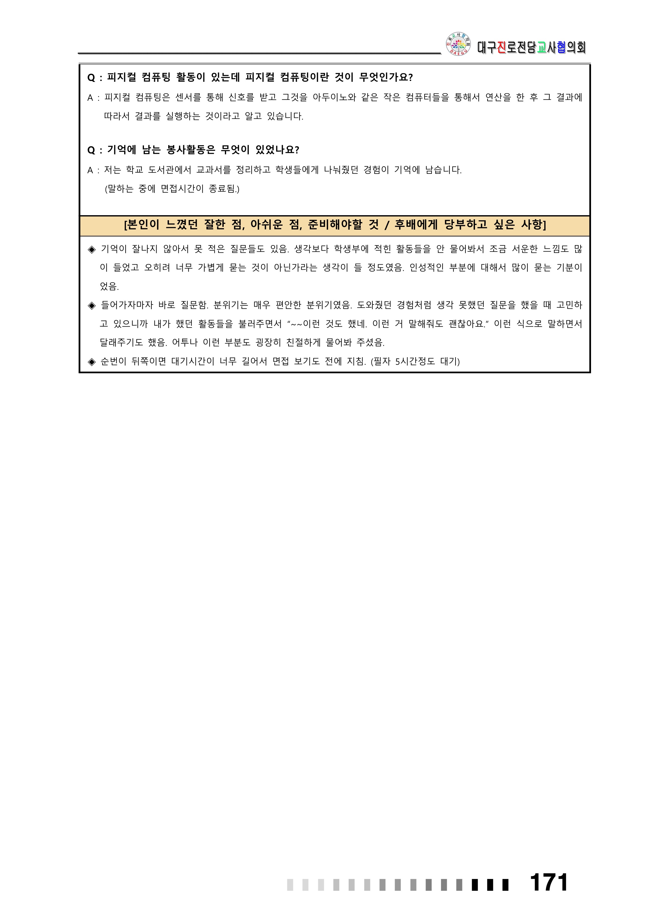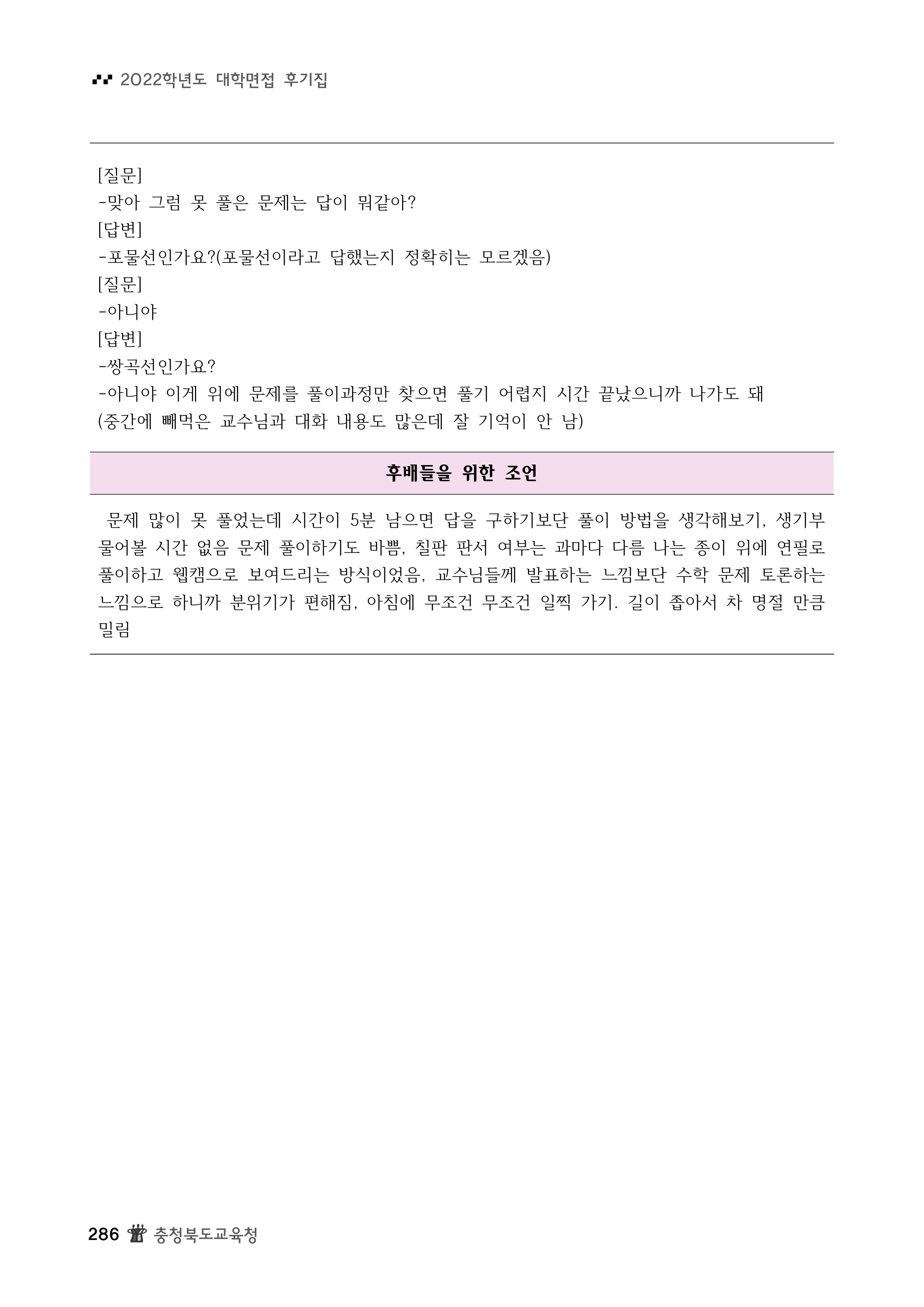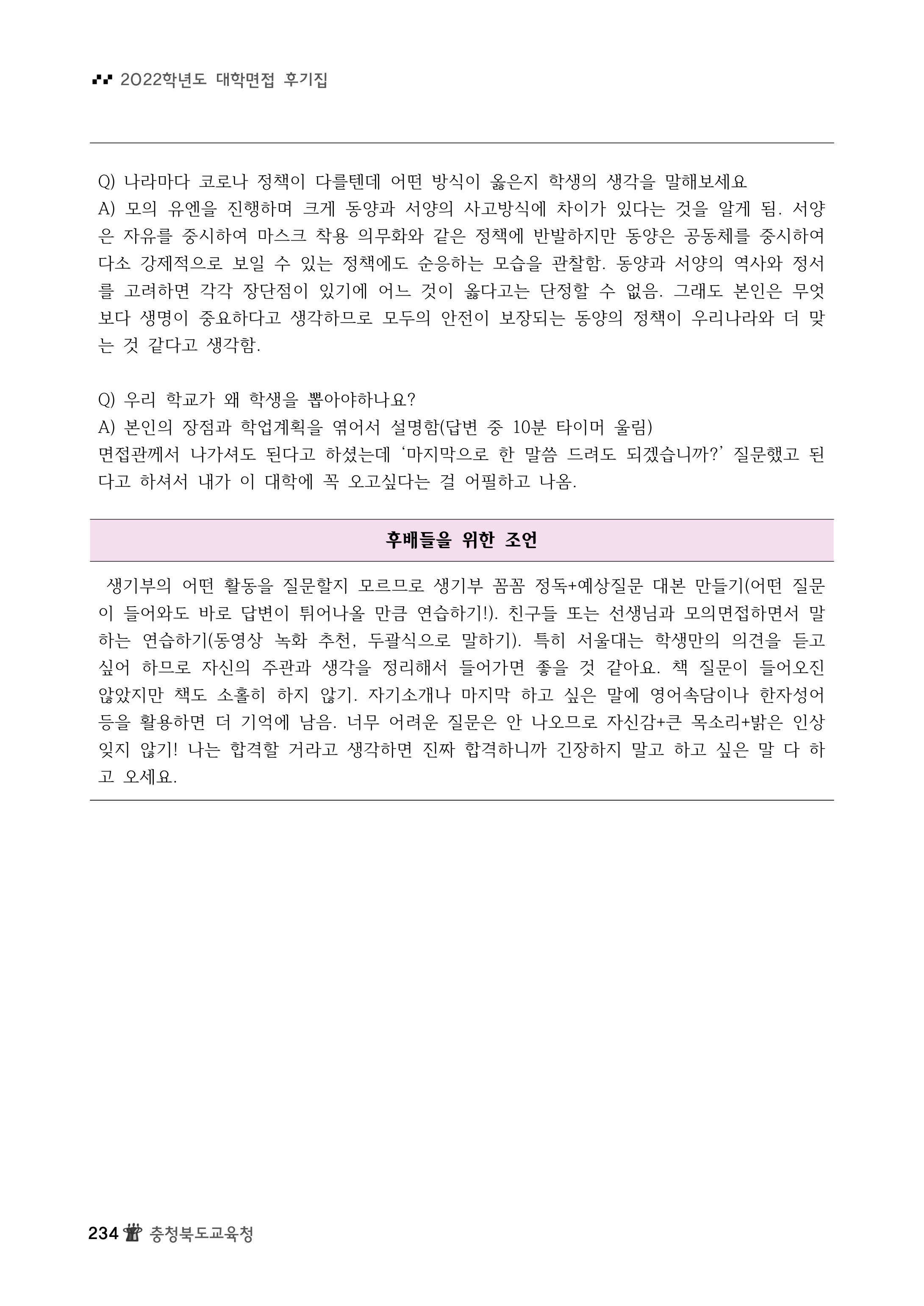 2022학년도 서울대학교 면접 질문3 (사범대학) (0) 2022.10.30 2022학년도 서울대학교 면접 질문2 (농업생명과학대학, 미술대학) (0) 2022.10.27 2022학년도 고려대학교 면접 질문 (0) 2022.10.22 2022학년도 가톨릭대학교 면접 질문 (0) 2022.10.20 2022학년도 성균관대학교 면접 질문 (0) 2022.10.18