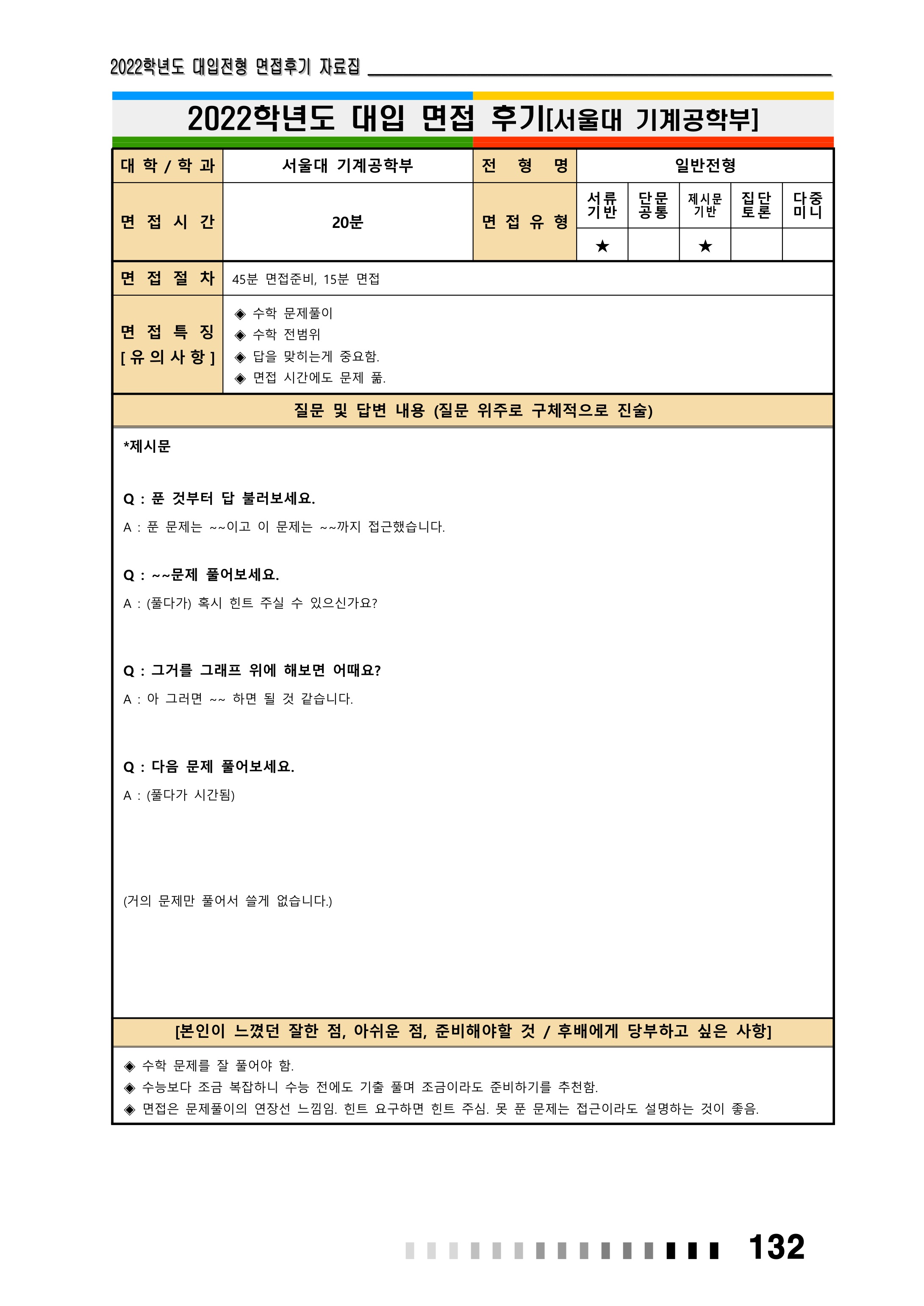 2022학년도 서울대학교 공과대학 면접 후기3 - 기계공학부 2022학년도 서울대학교 공과대학 면접 후기4 - 기계공학부