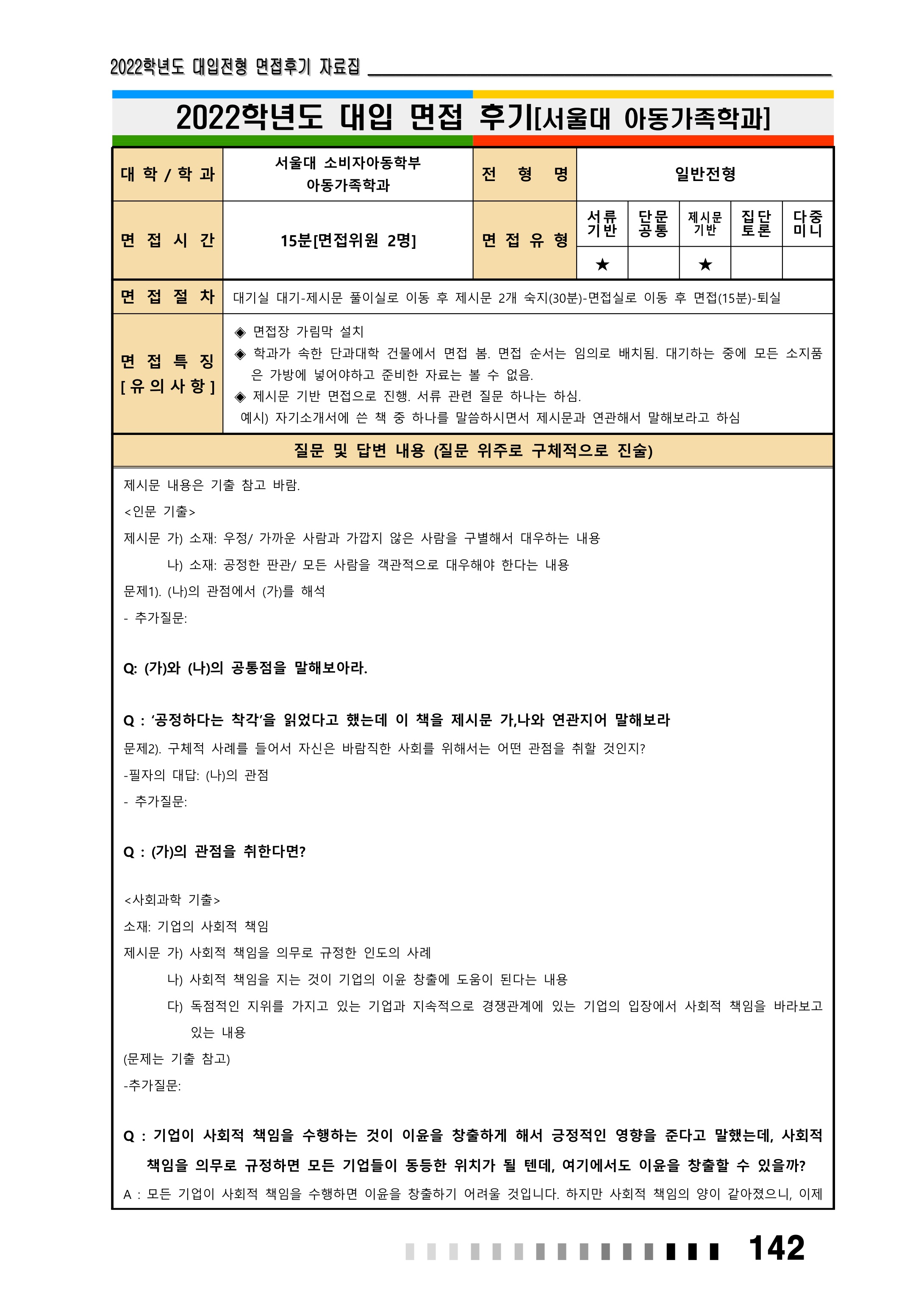 2022학년도 서울대학교 생활과학대학 면접 후기3 - 소비자아동학부