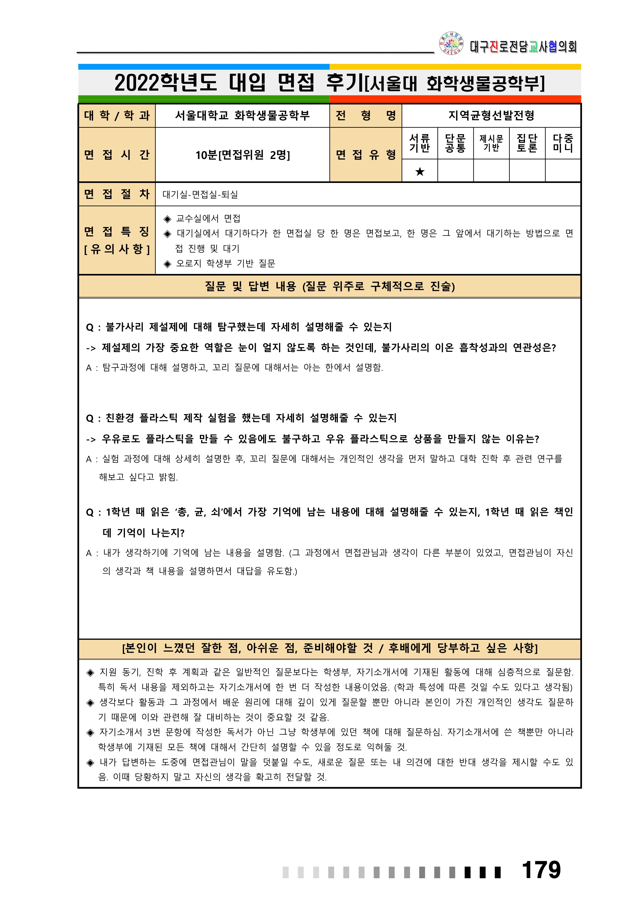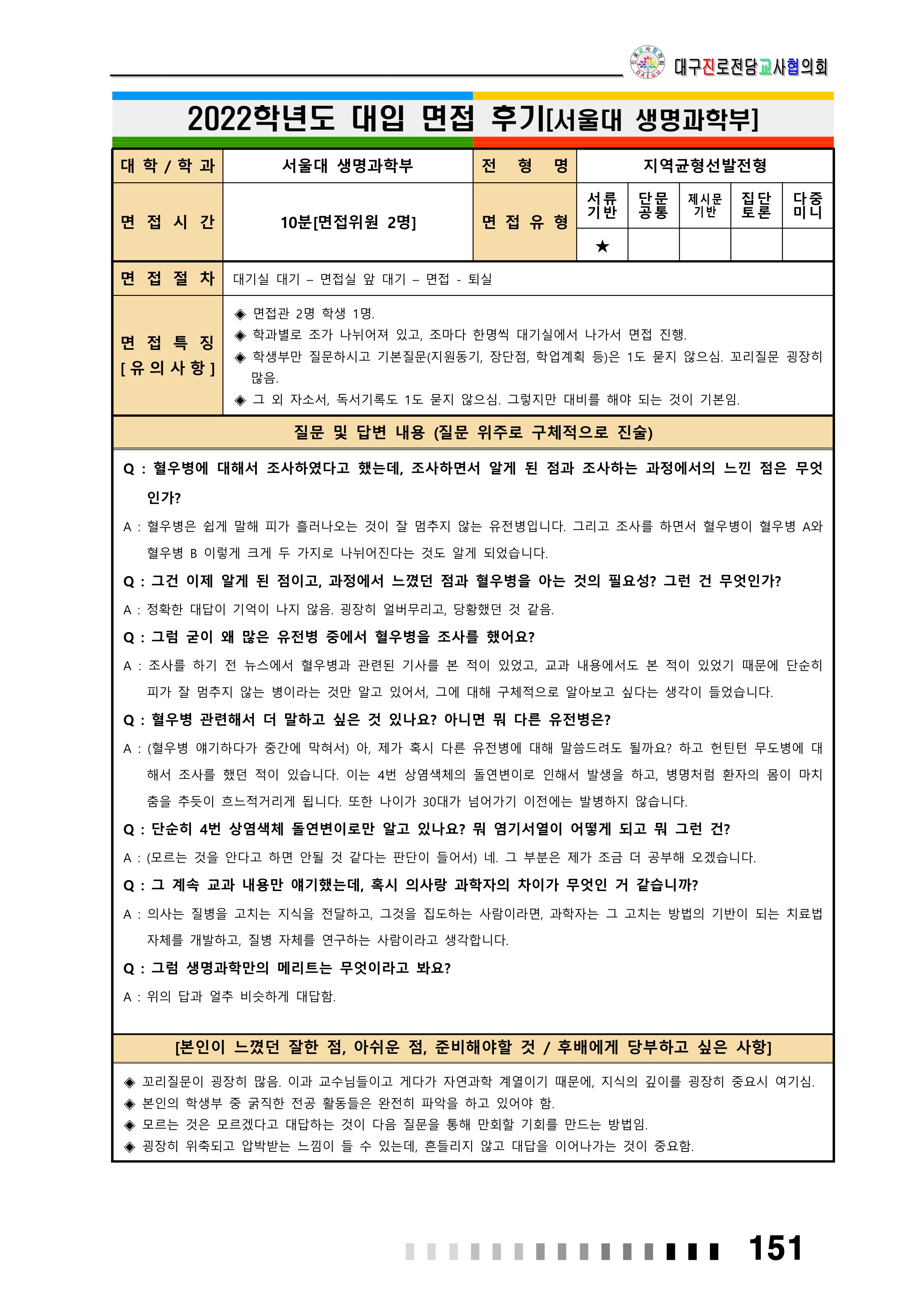 2022학년도 서울대학교 공과대학 면접 후기15 - 화학생물공학부 2022학년도 서울대학교 자연과학대학 면접 후기1 - 생명과학부