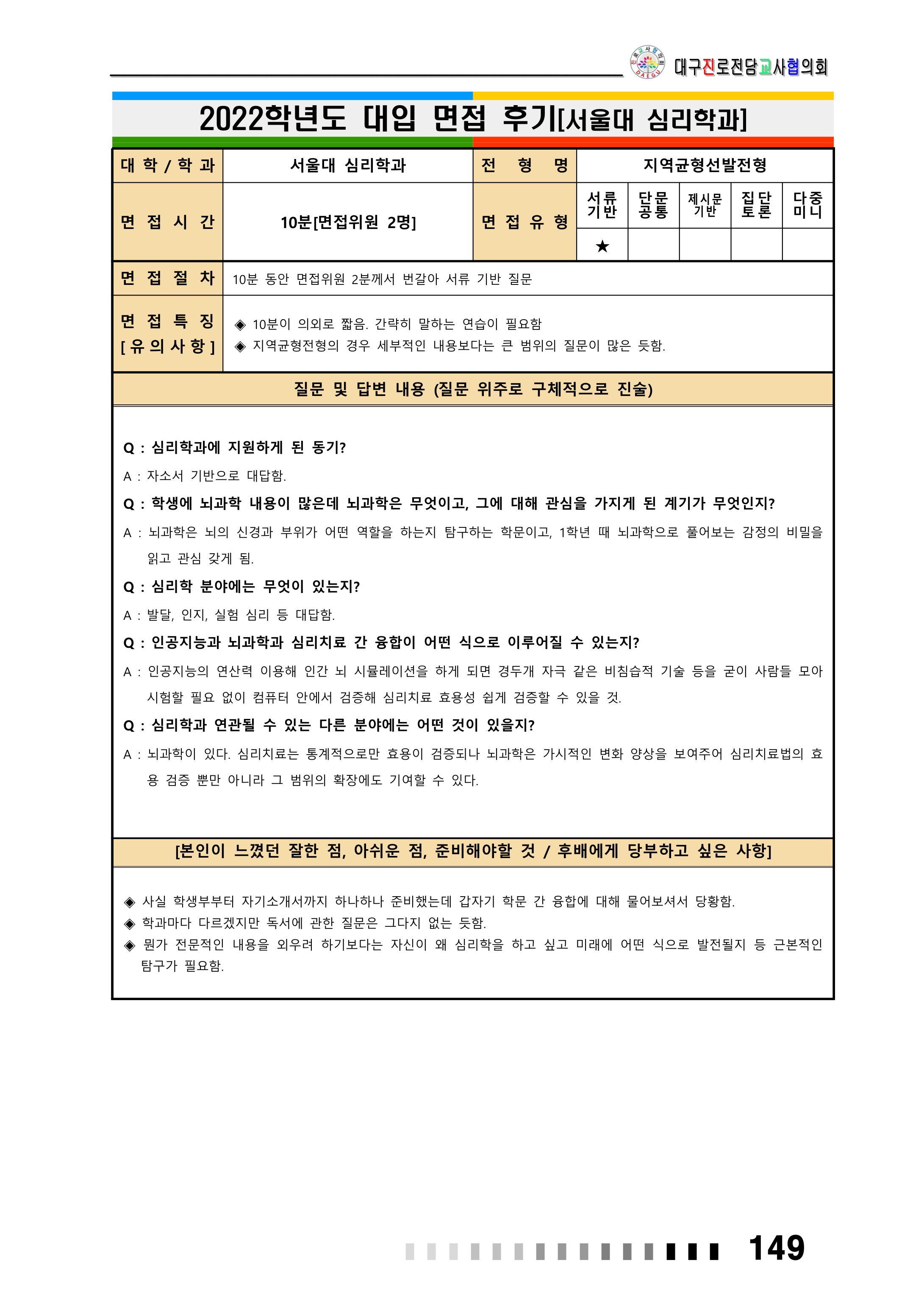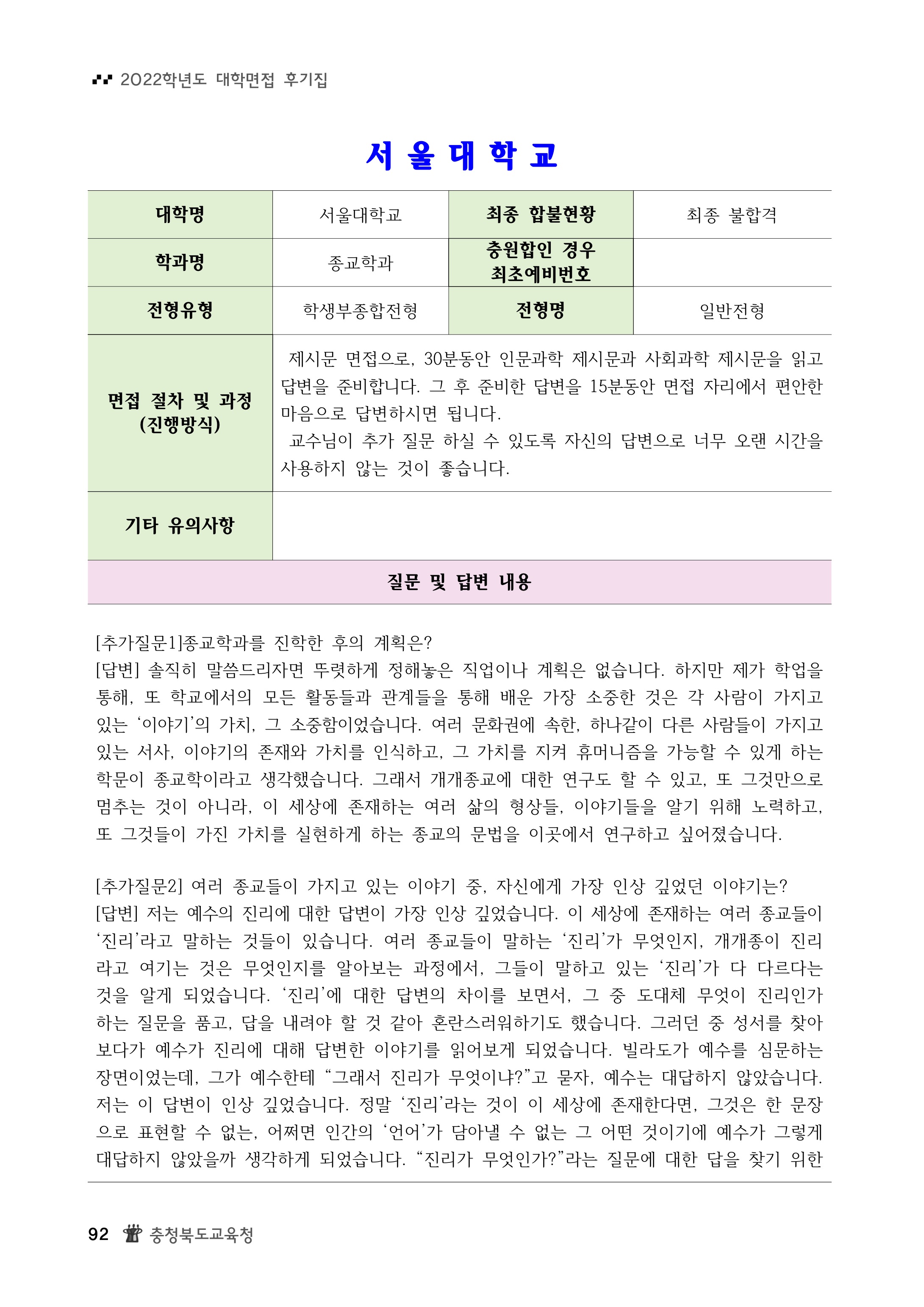 2022학년도 서울대학교 인문대학 면접 후기10 - 종교학과