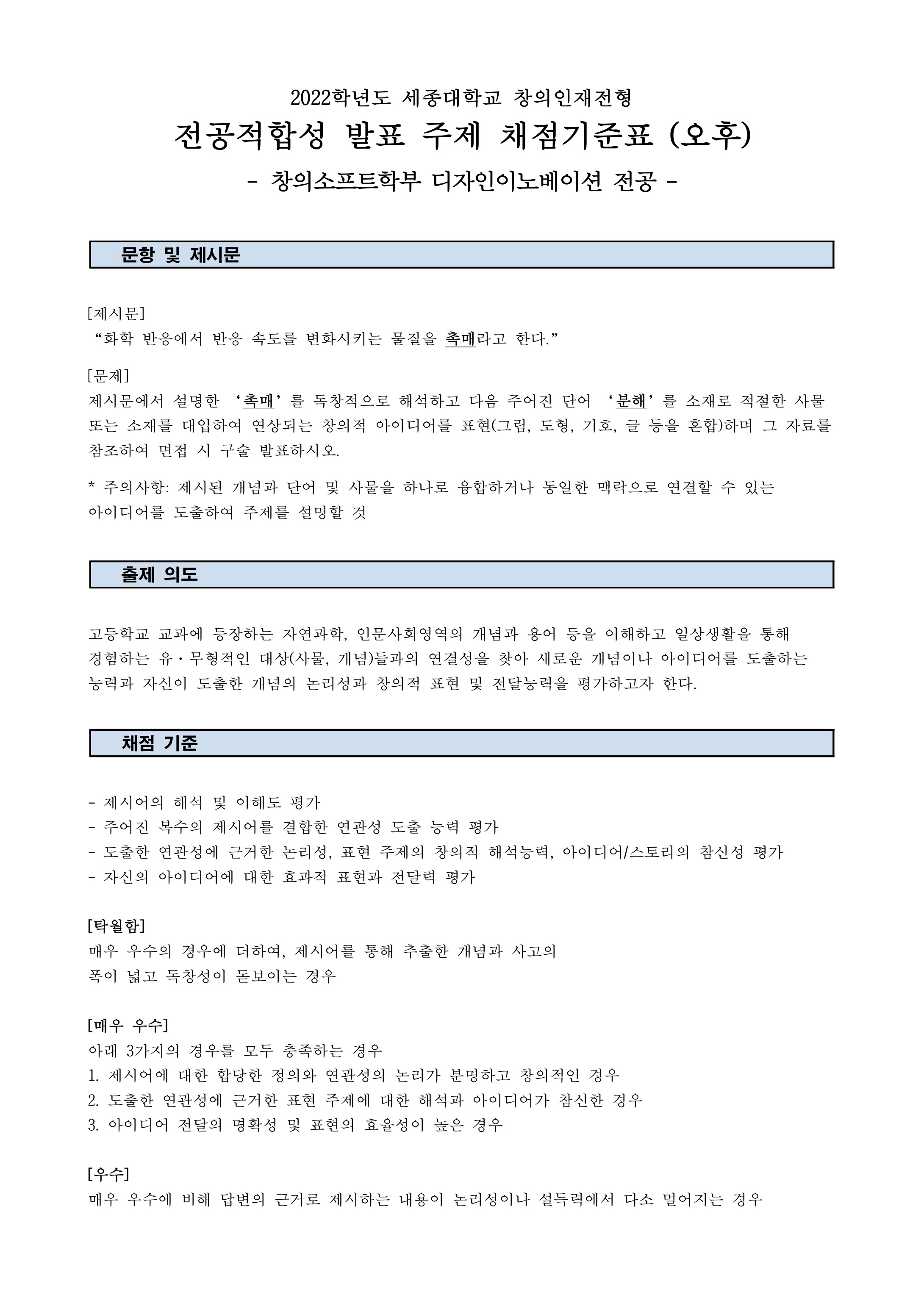 2022학년도 세종대학교 창의인재전형 전공적합성 제시문 및 해설 - 디자인이노베이션 전공 2022학년도 세종대학교 창의인재전형전공 적합성주제 및 해설 디자인이노베이션전공.pdf0.08MB2022학년도 세종대학교 창의인재전형 전공적합성 제시문 및 해설 - 만화애니메이션텍 전공