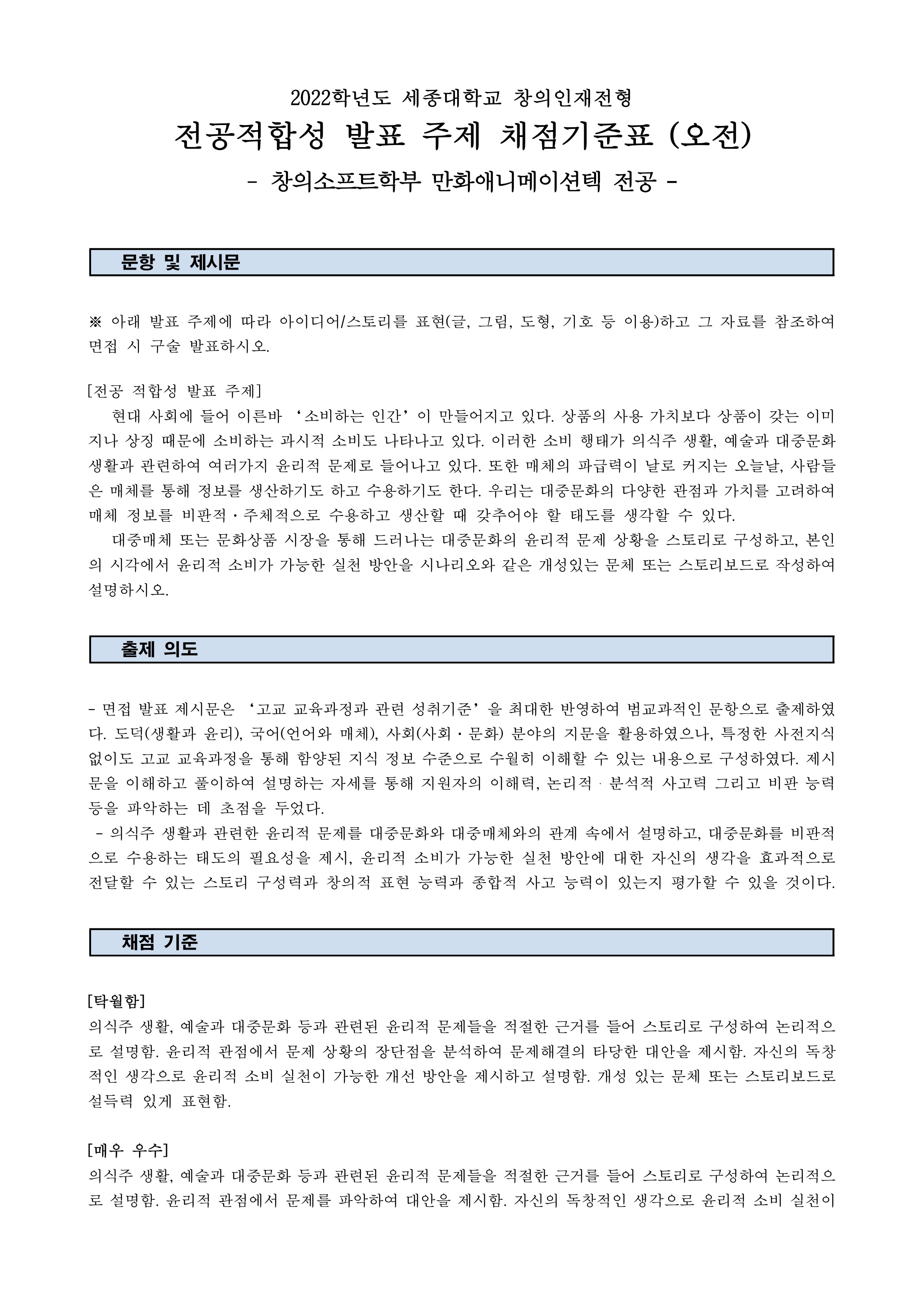 2022학년도 세종대학교 창의인재전형 전공적합성 제시문 및 해설 - 만화애니메이션텍 전공