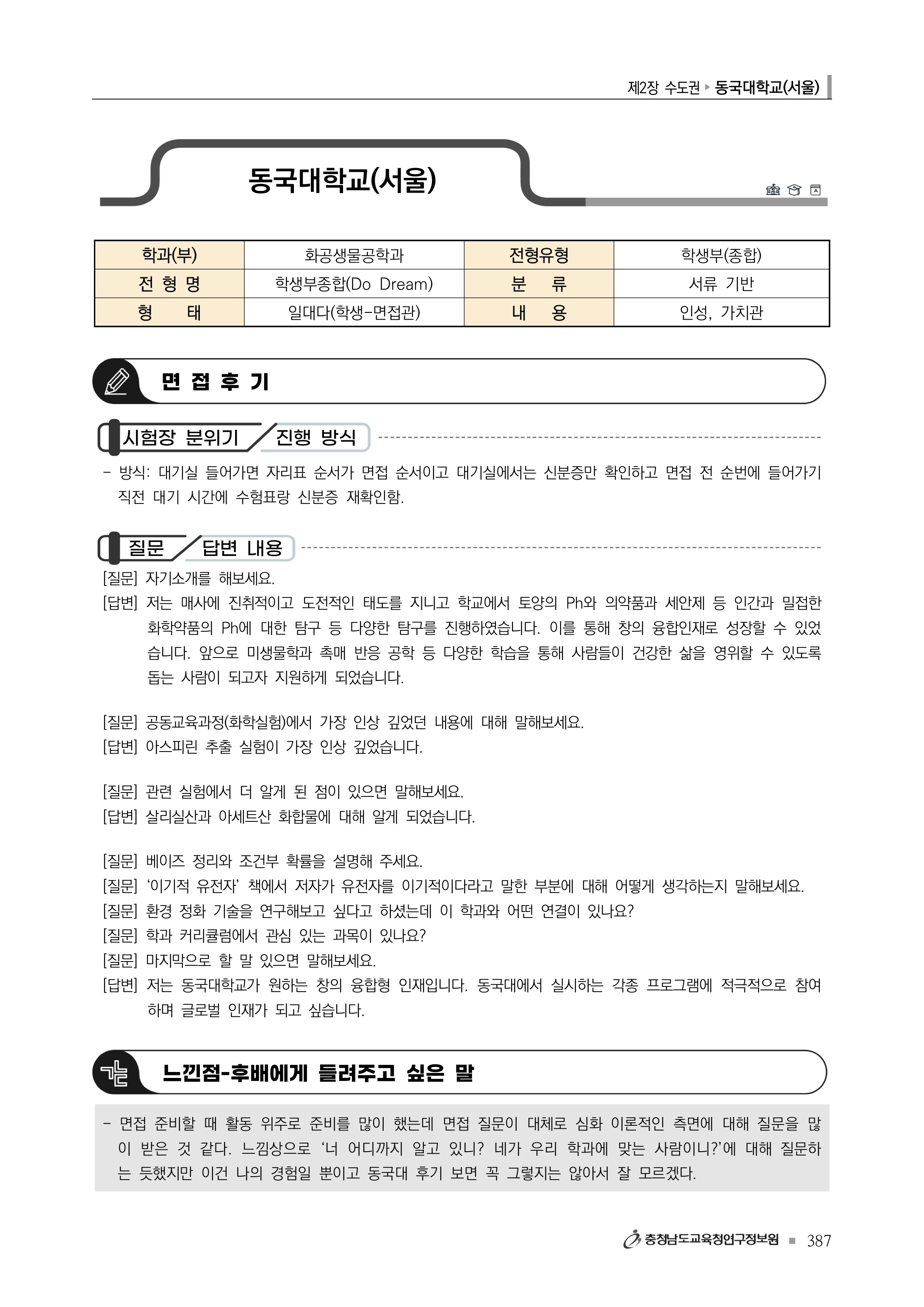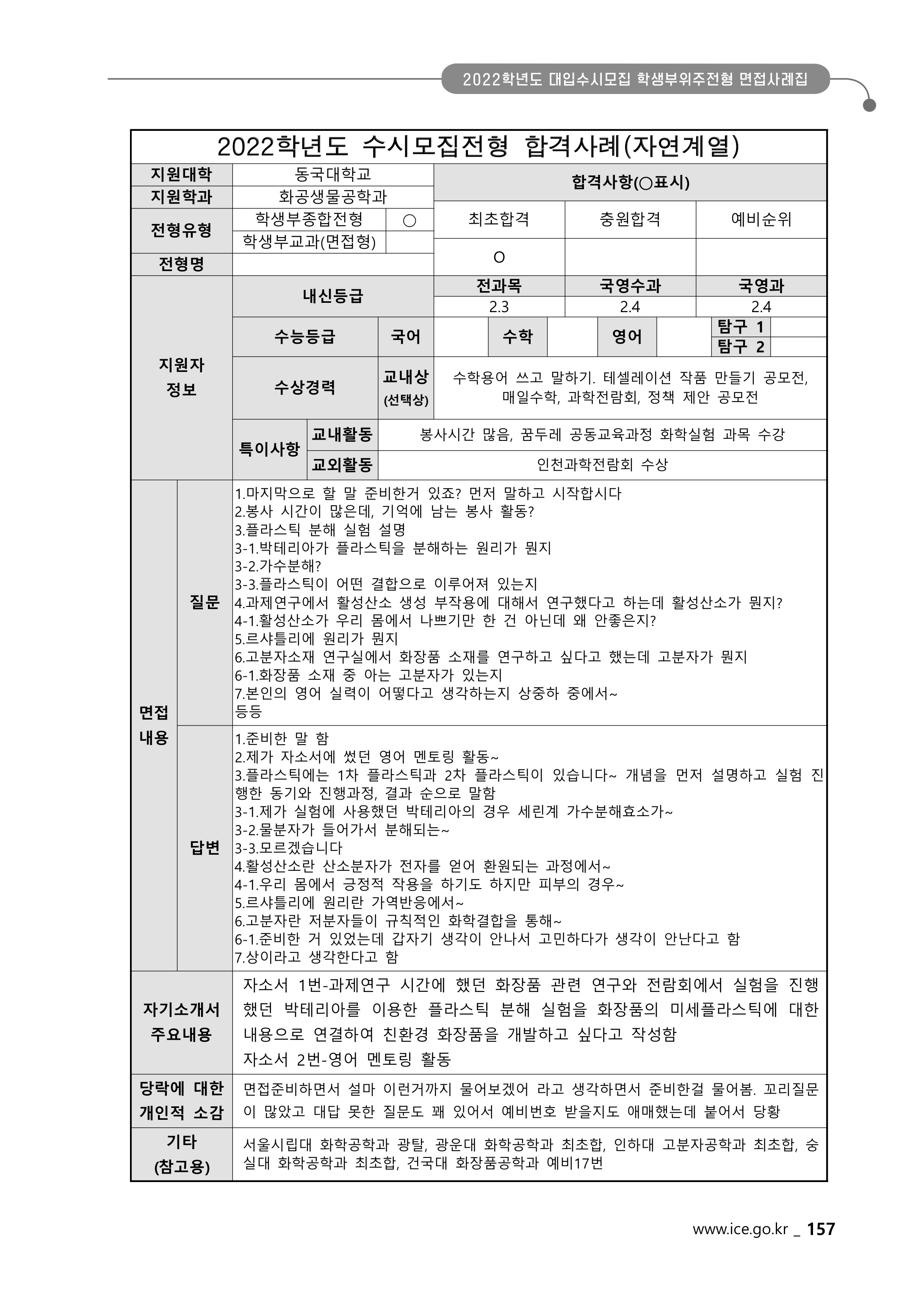 2022학년도 동국대학교 면접 후기34 - 화공생물공학과 2022학년도 동국대학교 면접 후기35 - 화학과