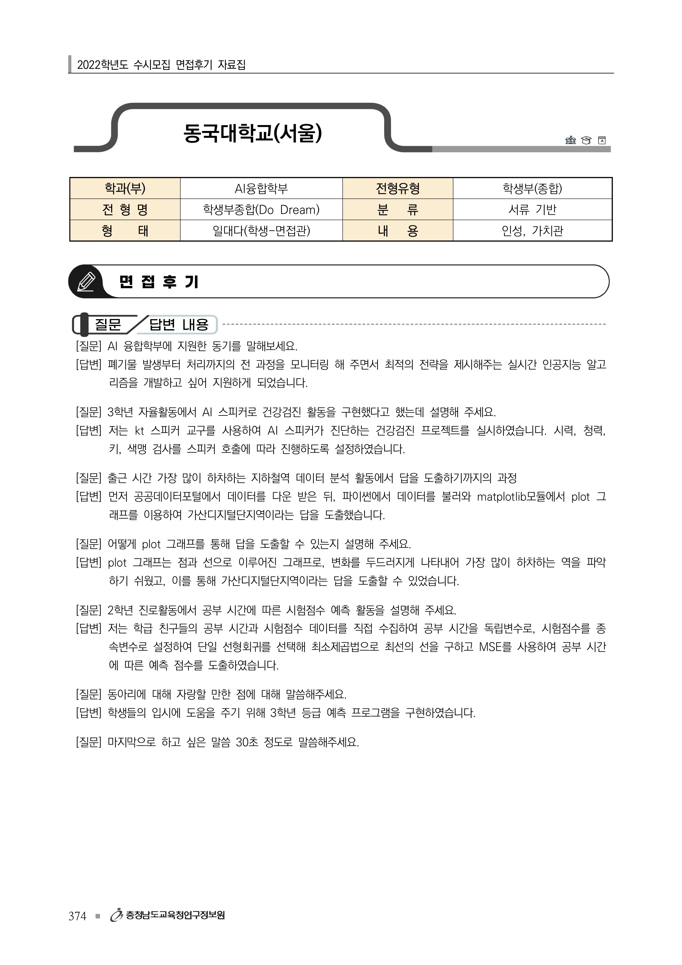 2022학년도 동국대학교 면접 후기37 - AI융합학부 2023학년도와 2021학년도에 출제된 동국대학교 면접 질문도 확인해 보세영.👨🎓