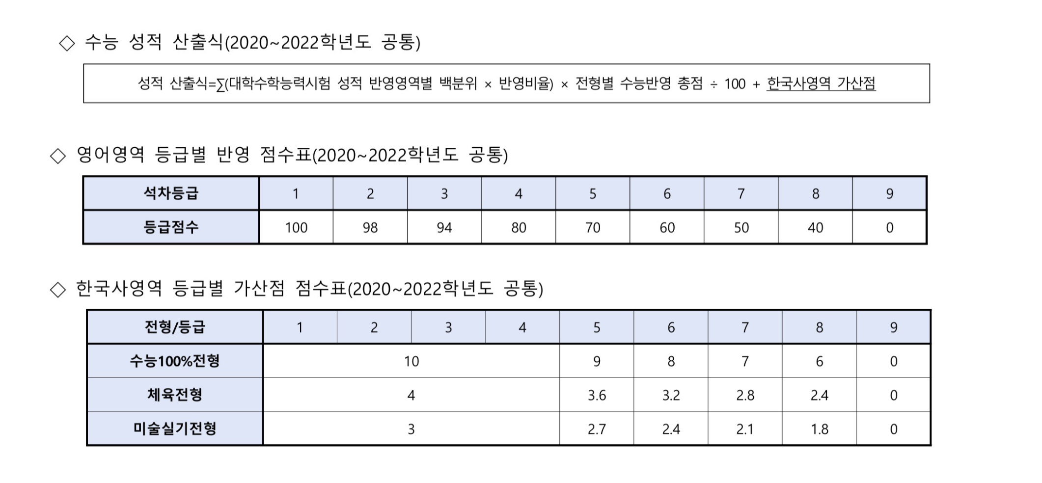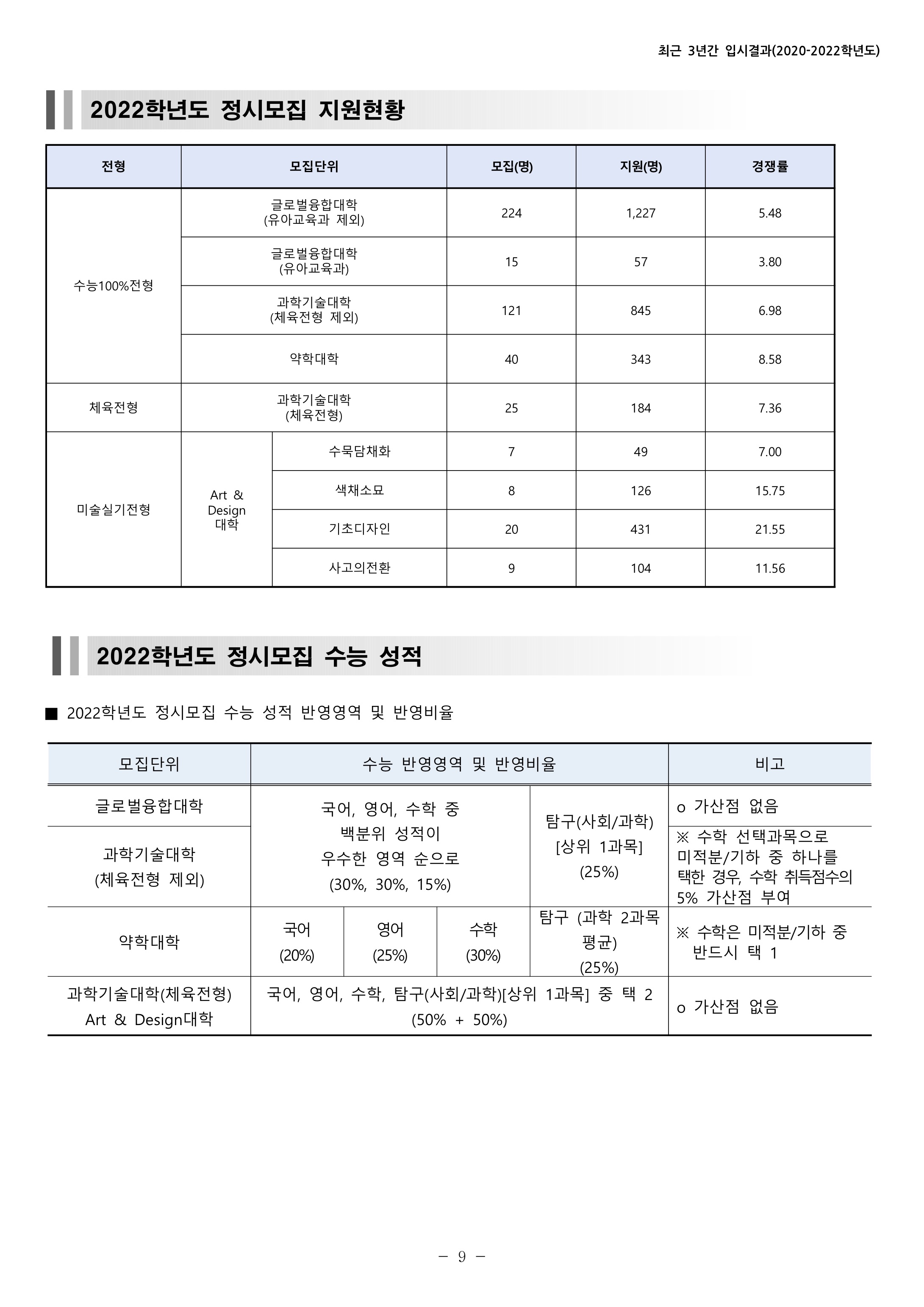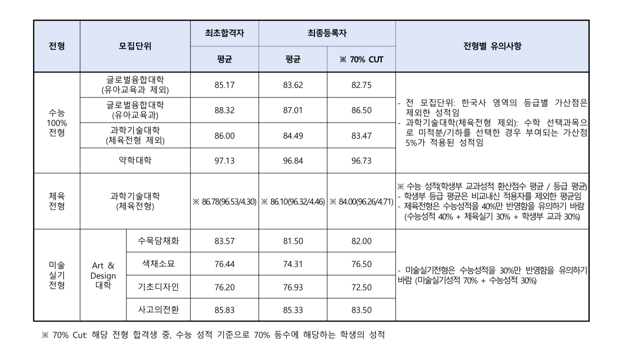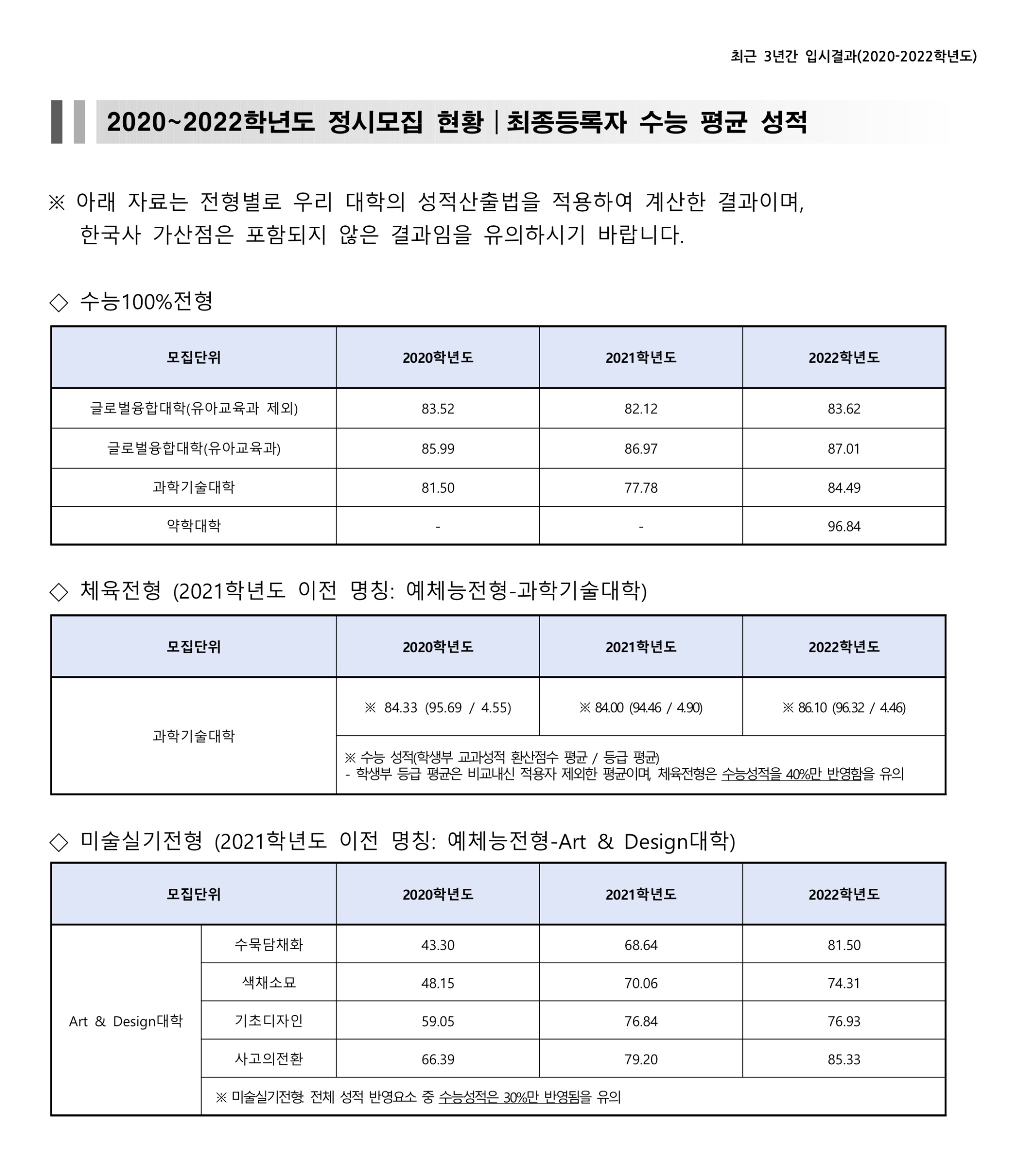 ※ 과학기술대학(체육전형) : 국어, 영어, 수학, 탐구(사회/과학)[상위 1과목] 중 택2 50% + 50%으로 선택 과목이 적용되므로 개인별 반영이 다를 수 있으니 참고