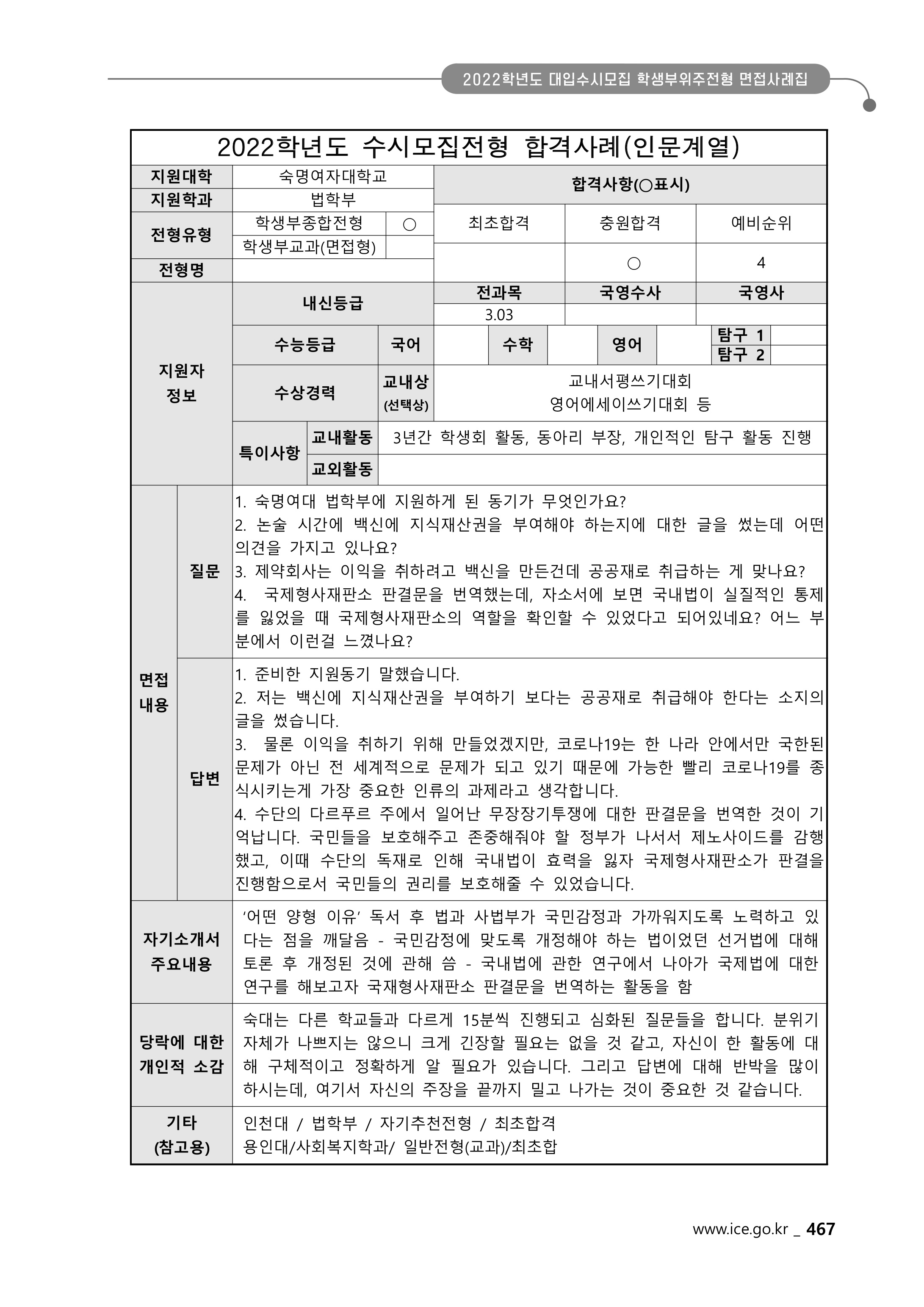 2022학년도 숙명여자대학교 면접 후기2 - 법학부
