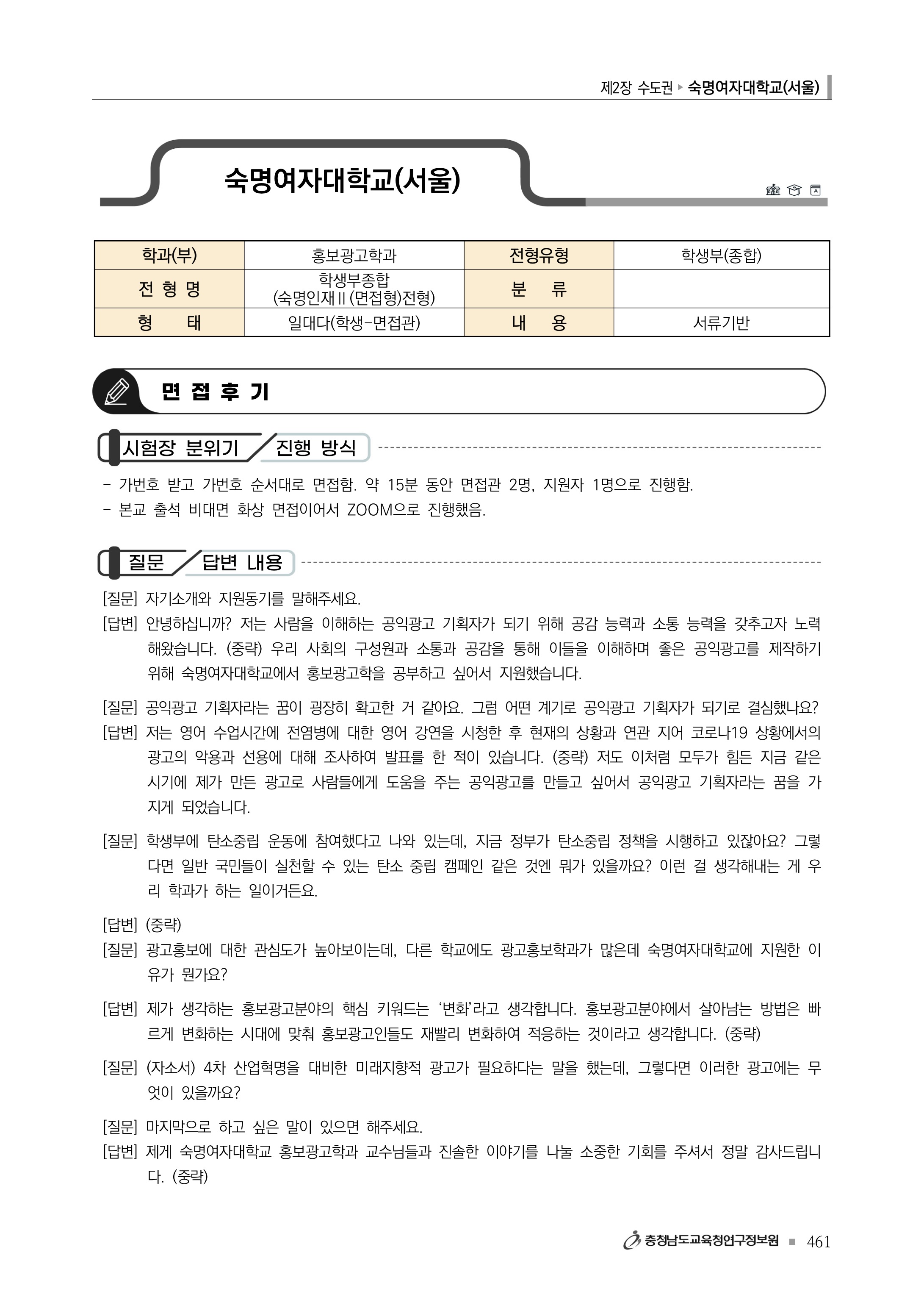 2021학년도 숙명여자대학교 면접 질문
