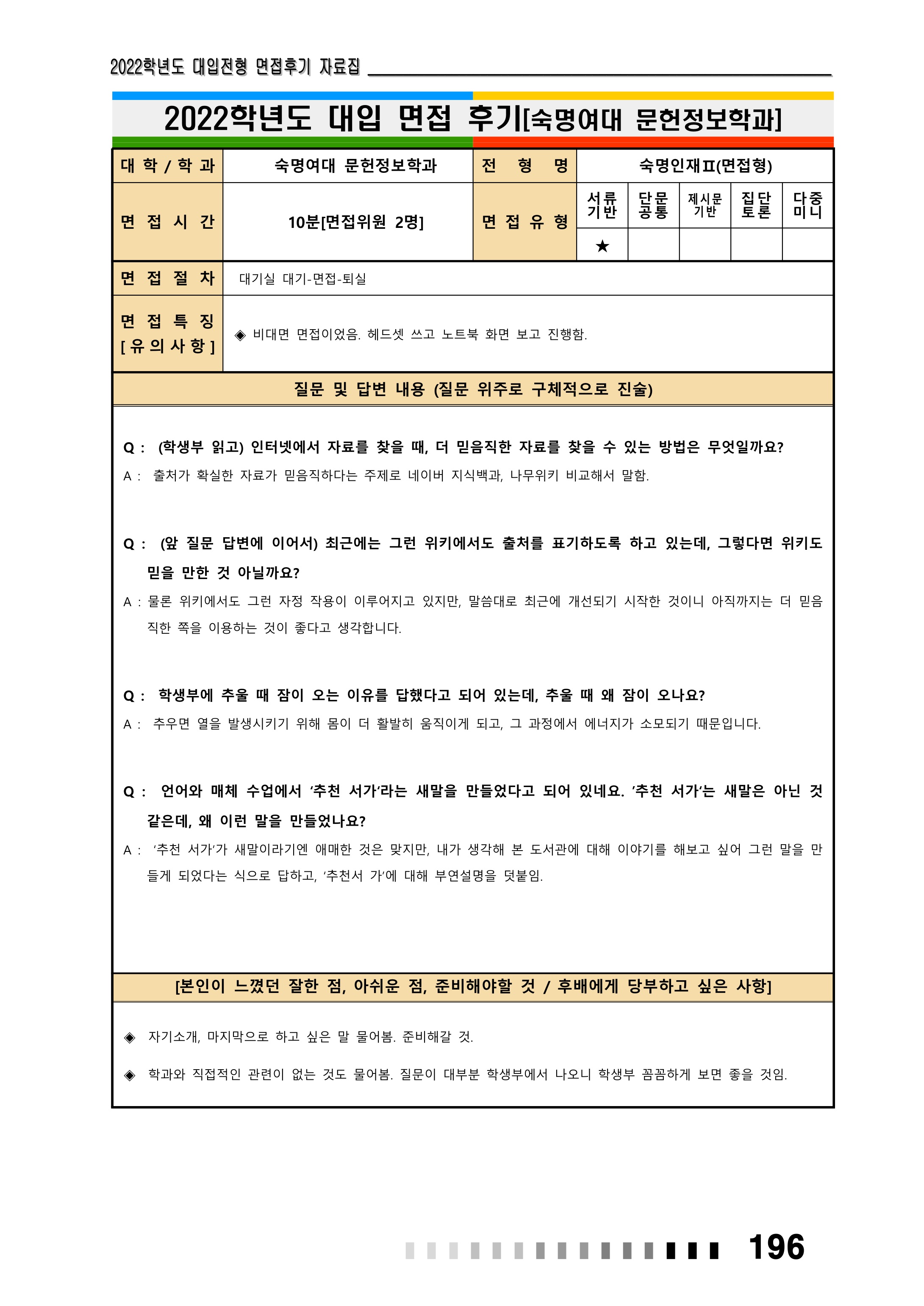 2022학년도 숙명여자대학교 면접 후기1 - 문헌정보학과