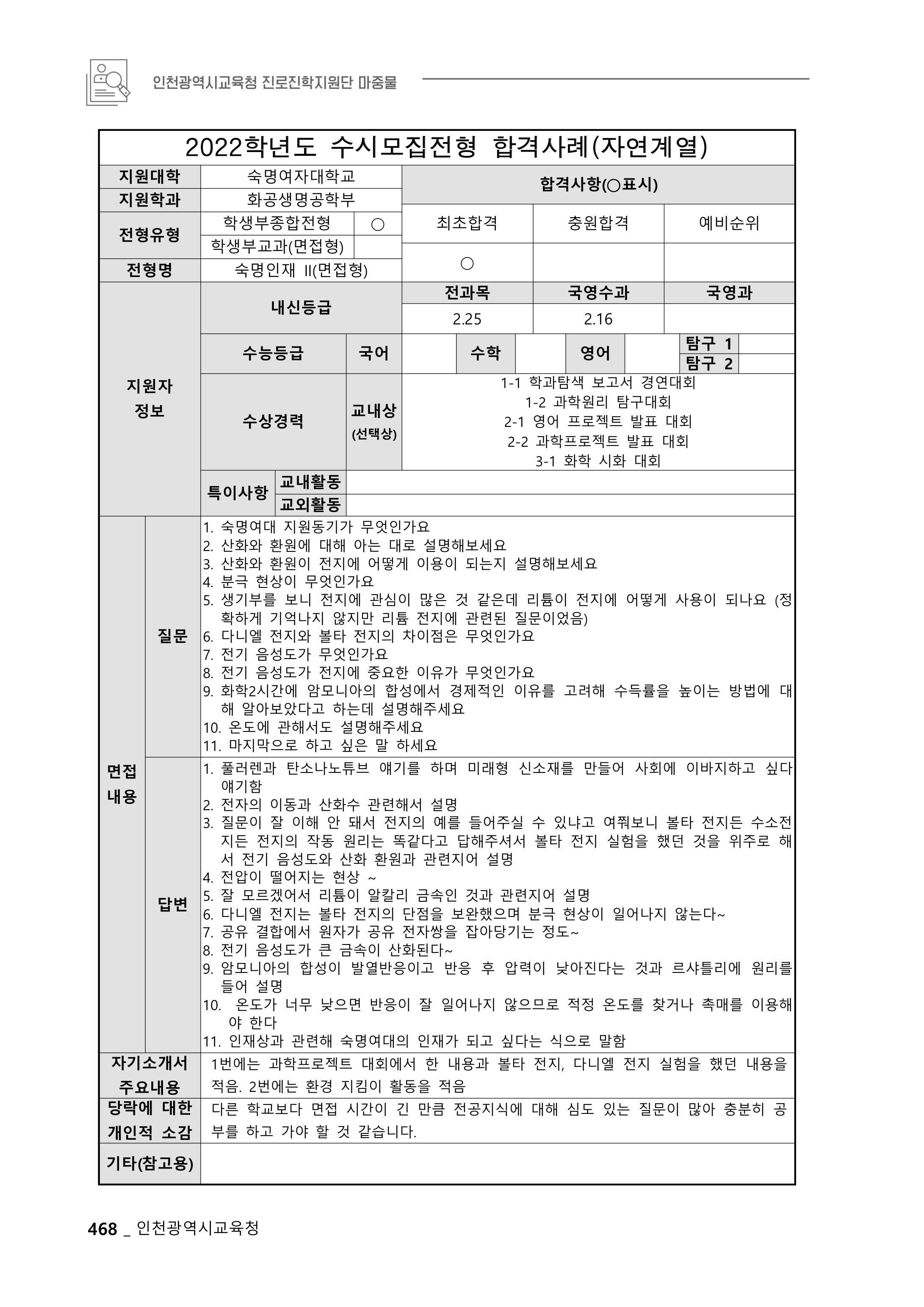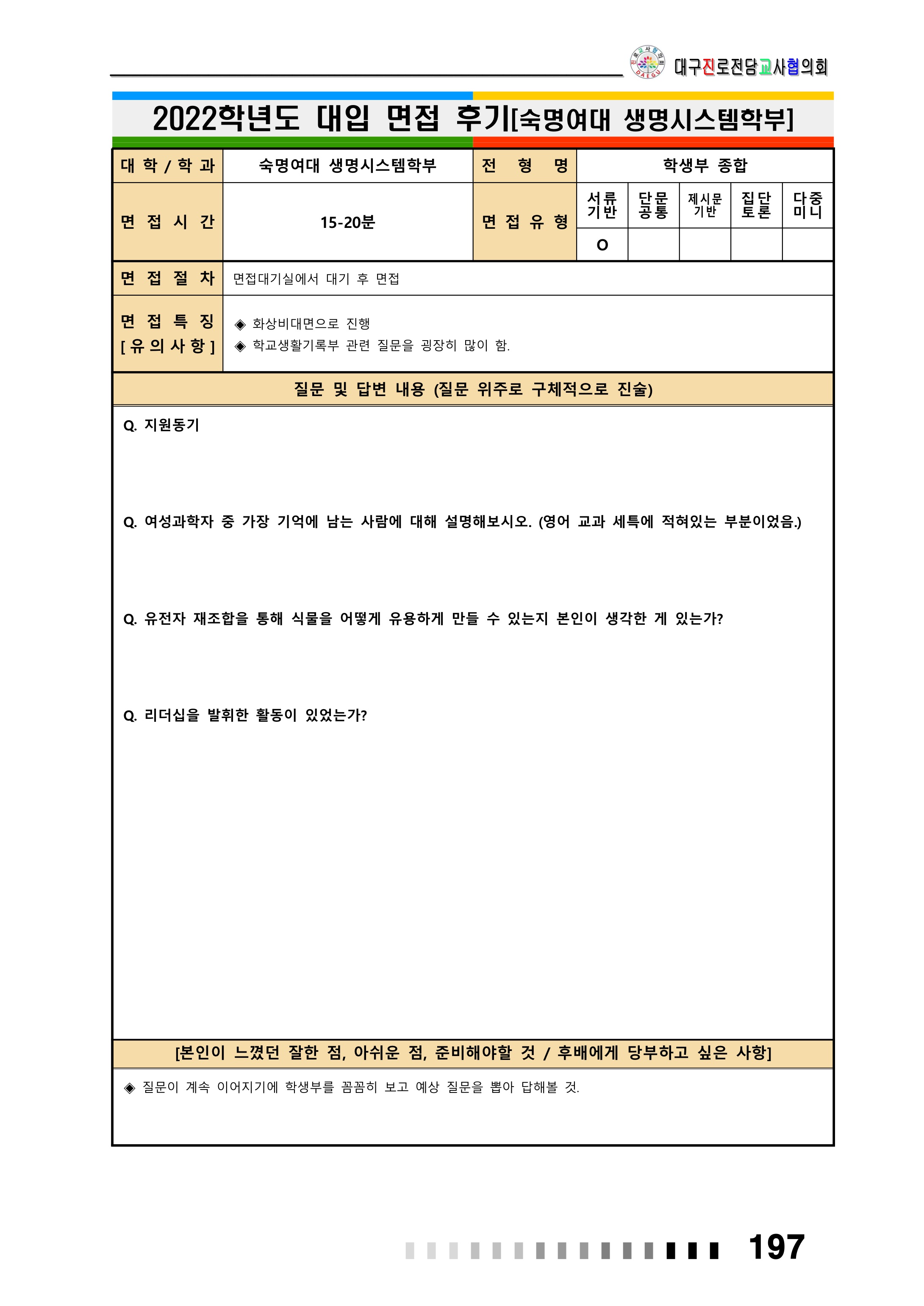 2022학년도 숙명여자대학교 면접 후기7 - 홍보광고학과 2022학년도 숙명여자대학교 면접 후기8 - 화공생명공학부