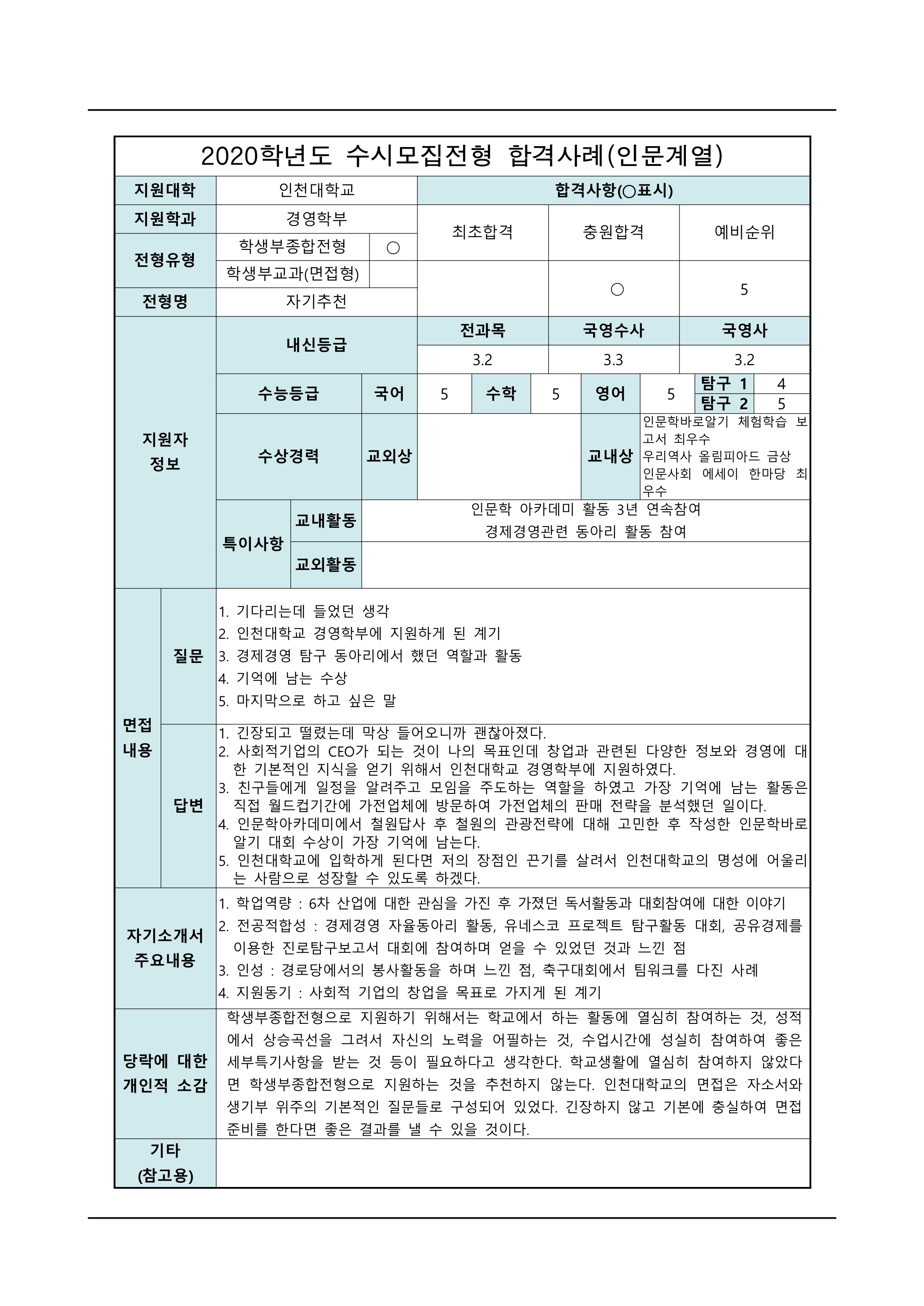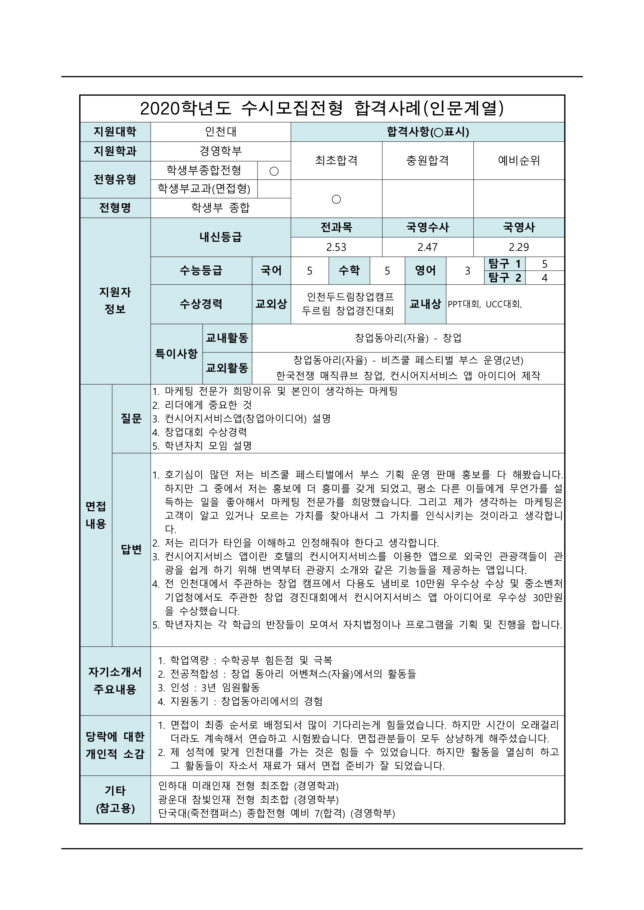 2021학년도 인천대학교 면접 후기1 - 경영학부 2021학년도 인천대학교 면접 후기2 - 경영학부