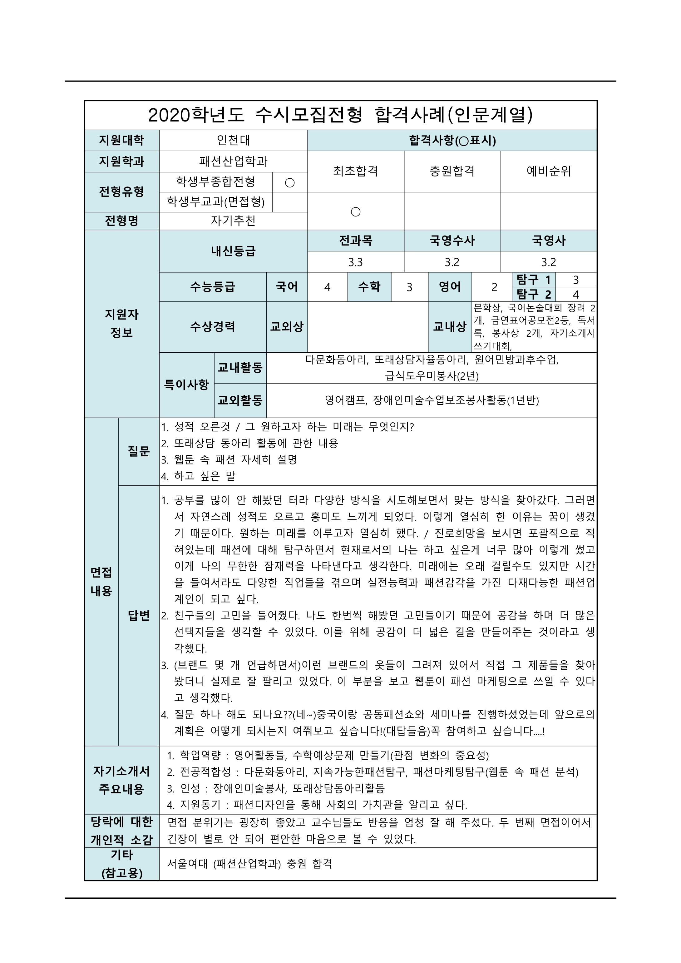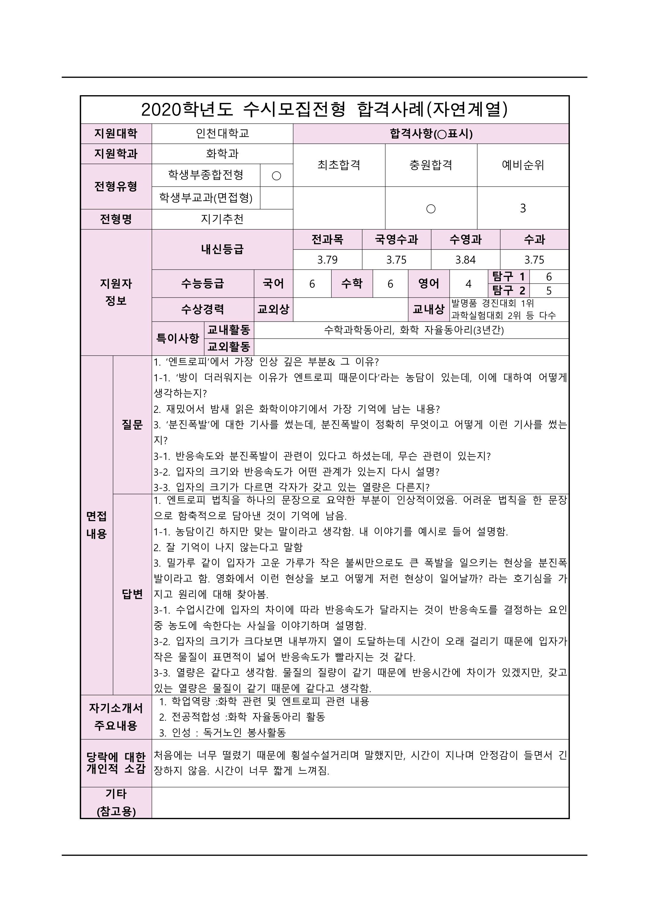 2021학년도 인천대학교 면접 후기35 - 패션산업학과 2021학년도 인천대학교 면접 후기36 - 화학과