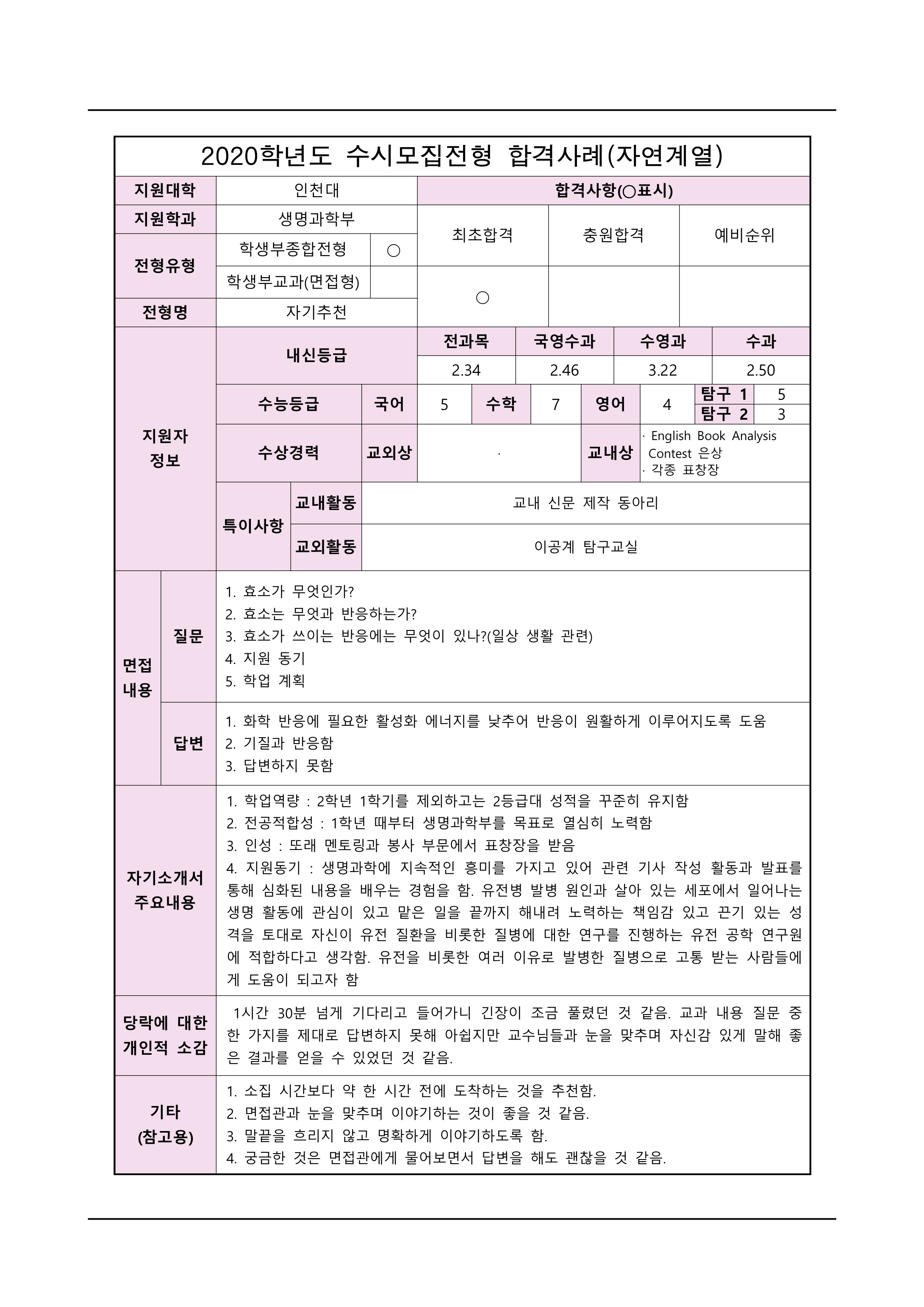2021학년도 인천대학교 면접 후기15 - 생명과학부 2021학년도 인천대학교 면접 후기16 - 생명과학부