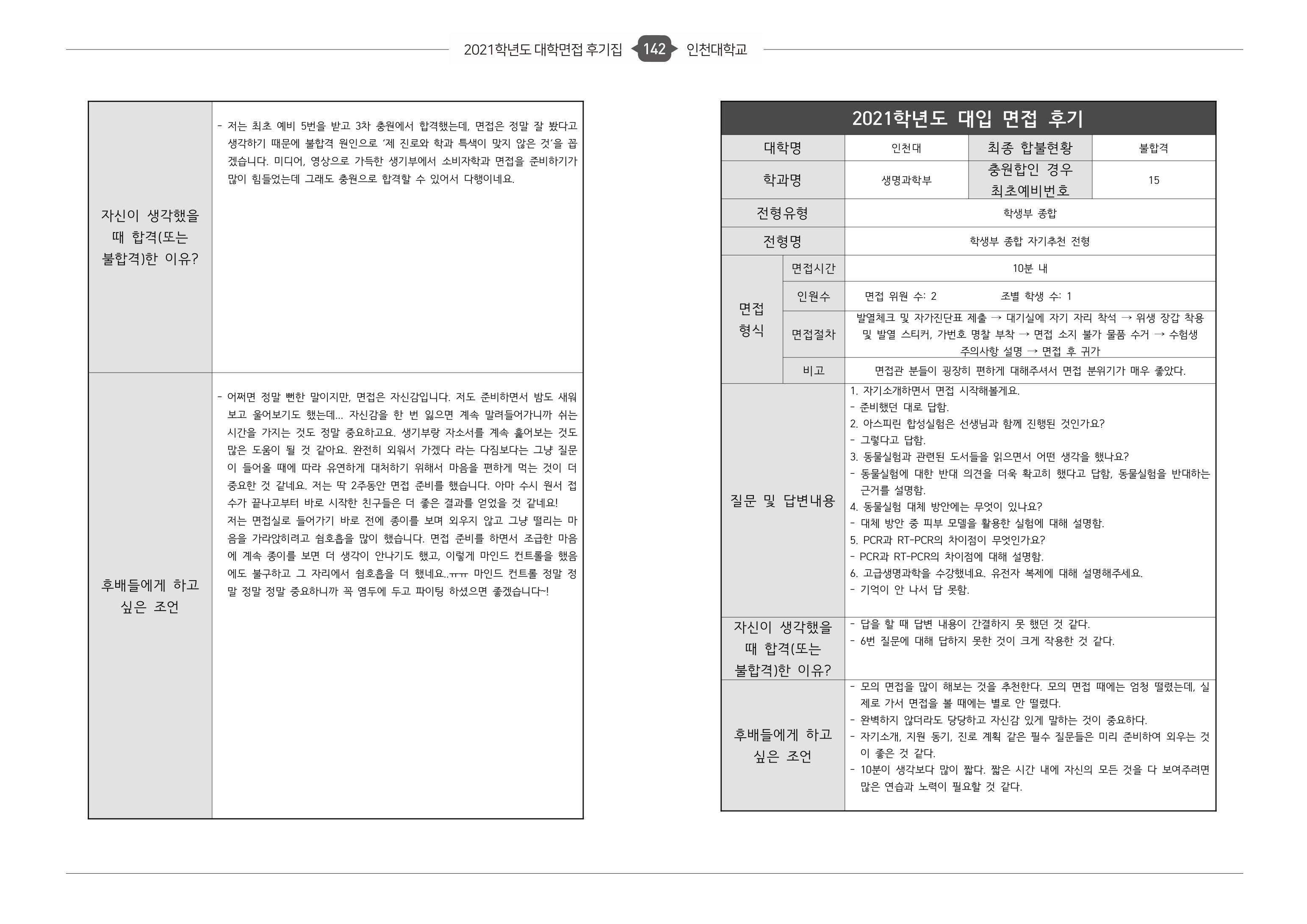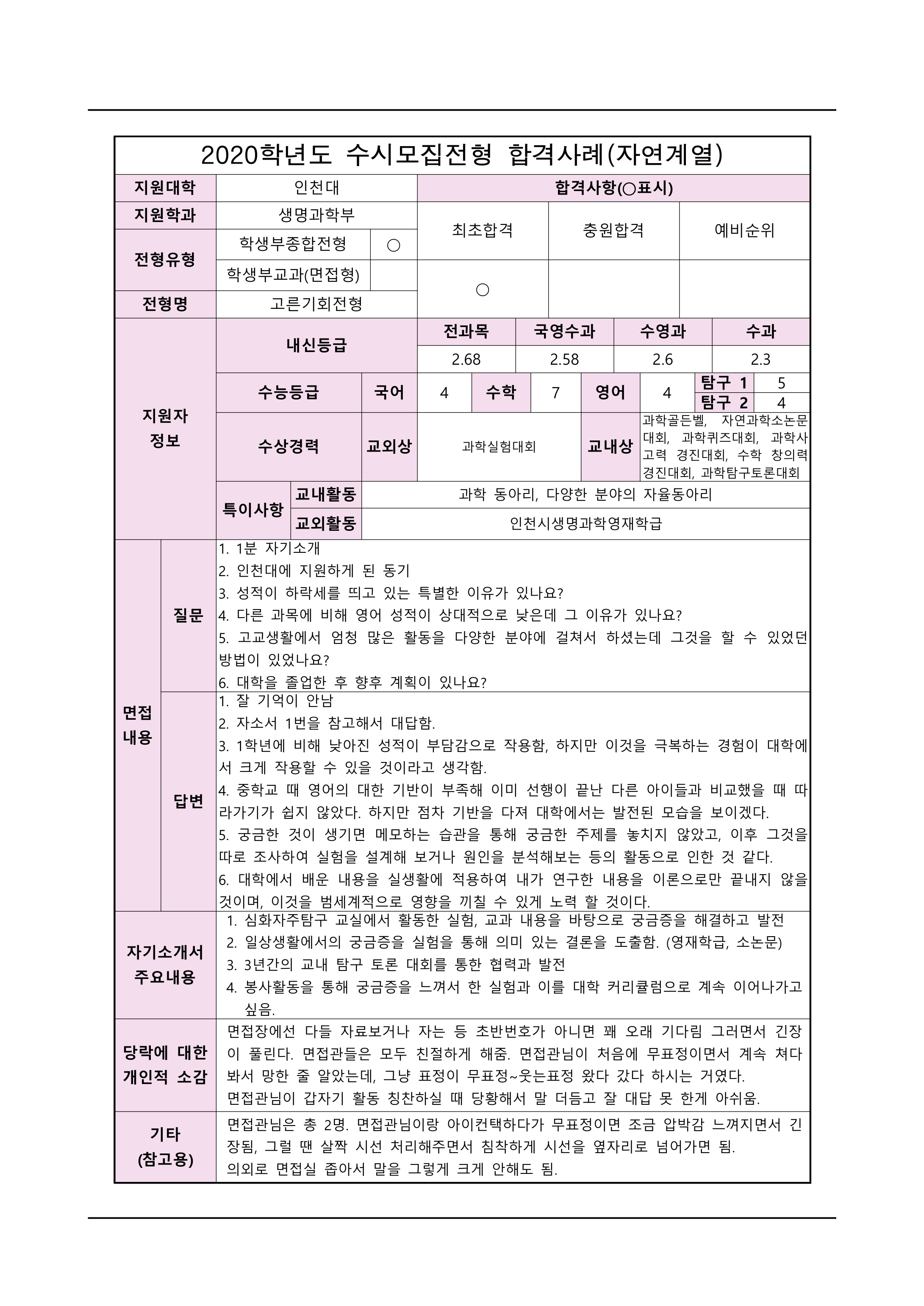 2021학년도 인천대학교 면접 후기16 - 생명과학부 2021학년도 인천대학교 면접 후기17 - 생명과학부