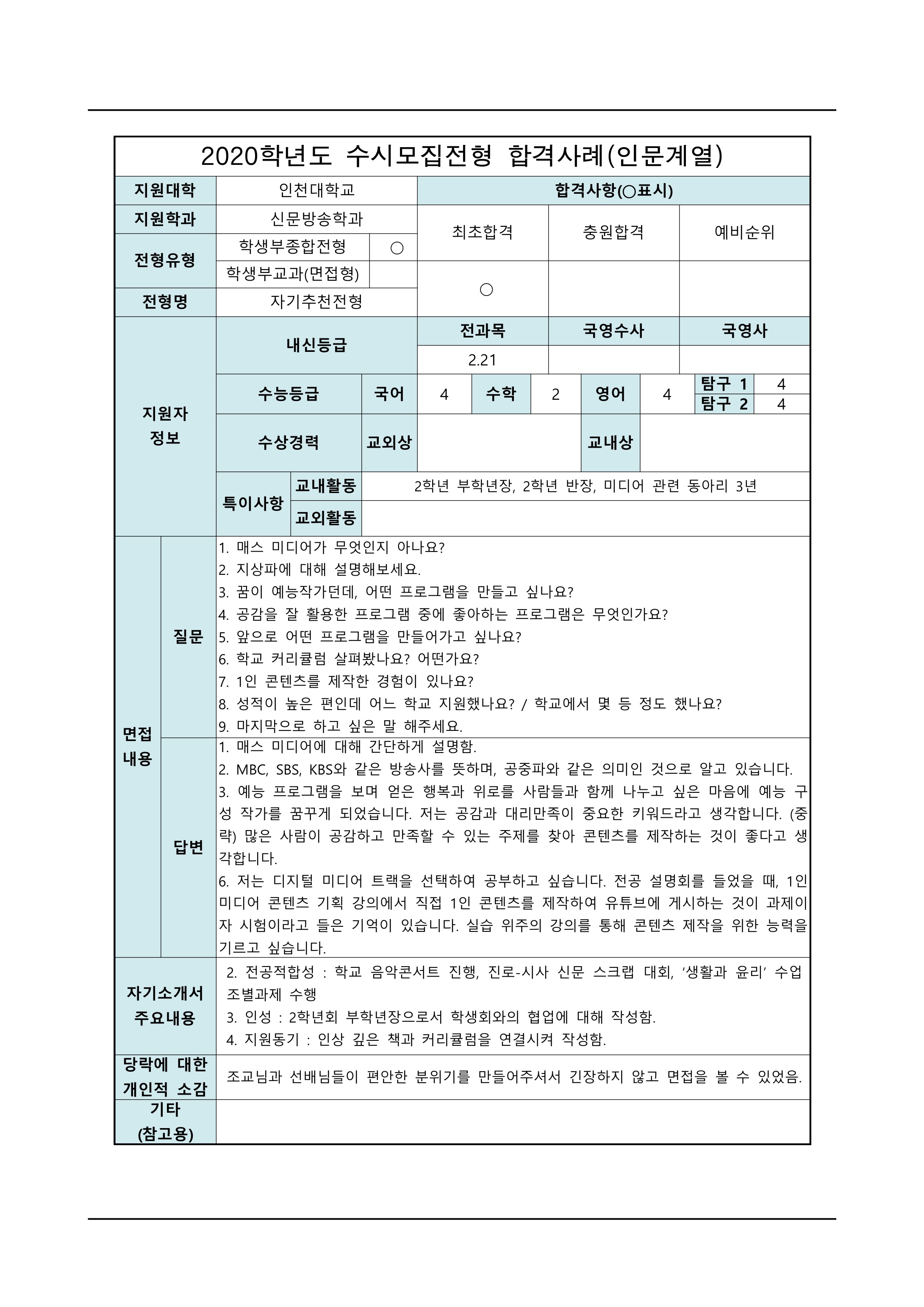2021학년도 인천대학교 면접 후기22 - 신문방송학과 2021학년도 인천대학교 면접 후기23 - 신소재공학과