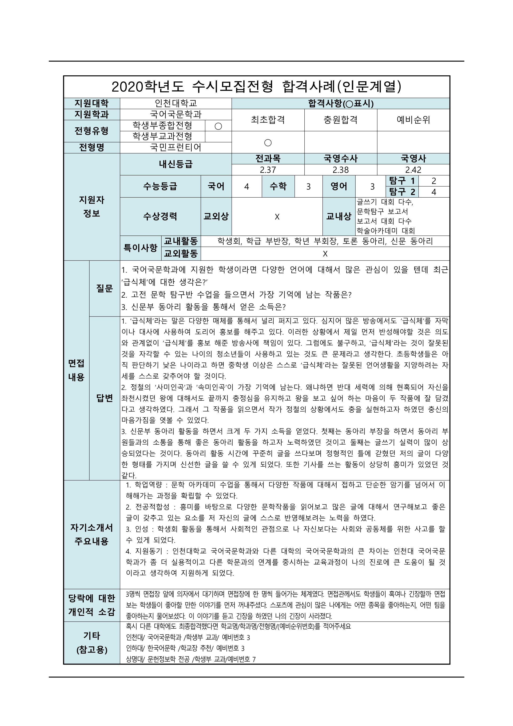 2021학년도 인천대학교 면접 후기4 - 경영학부 2021학년도 인천대학교 면접 후기5 - 국어국문학과