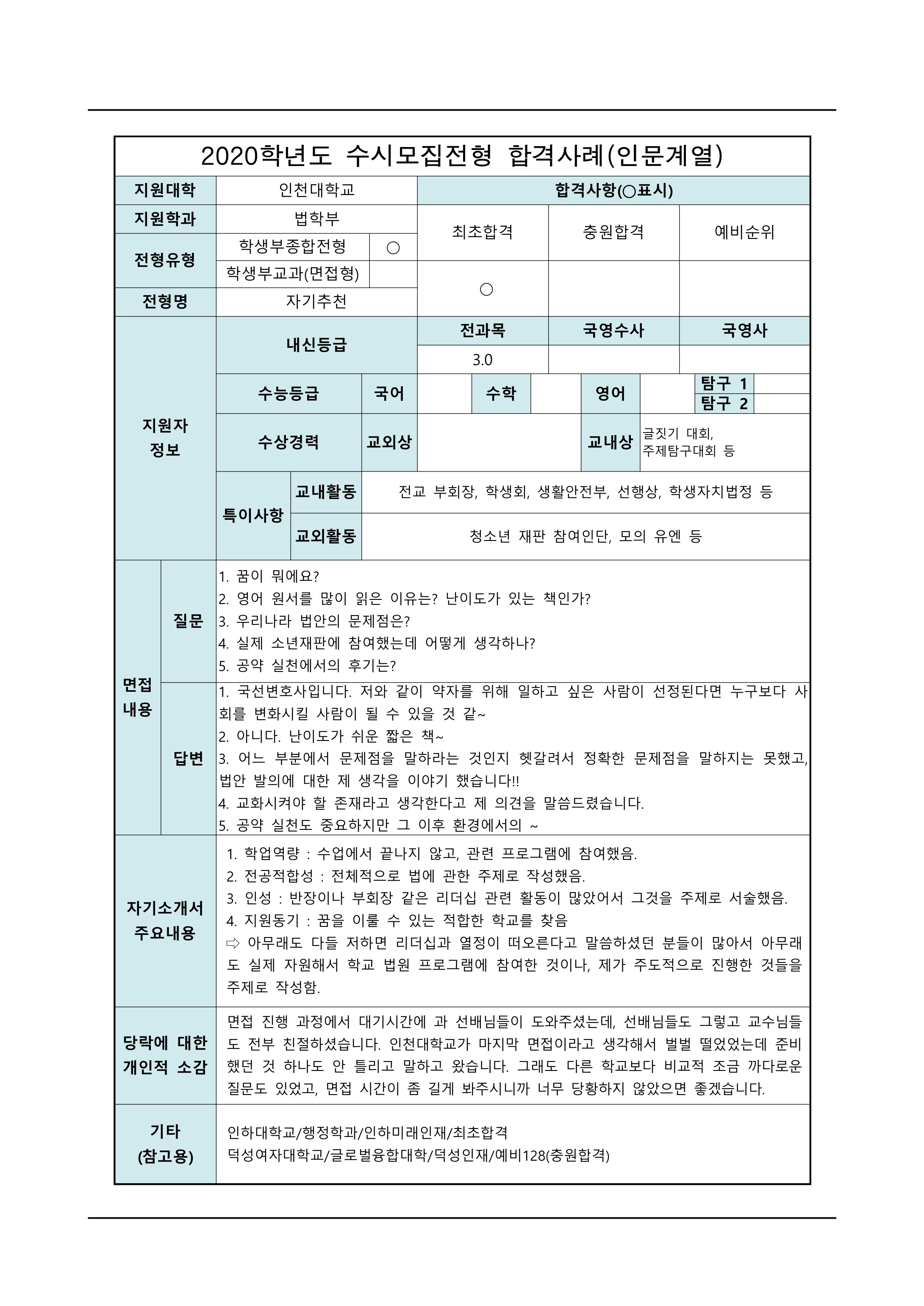 2021학년도 인천대학교 면접 후기10 - 동북아국제통상학부 2021학년도 인천대학교 면접 후기11 - 법학부