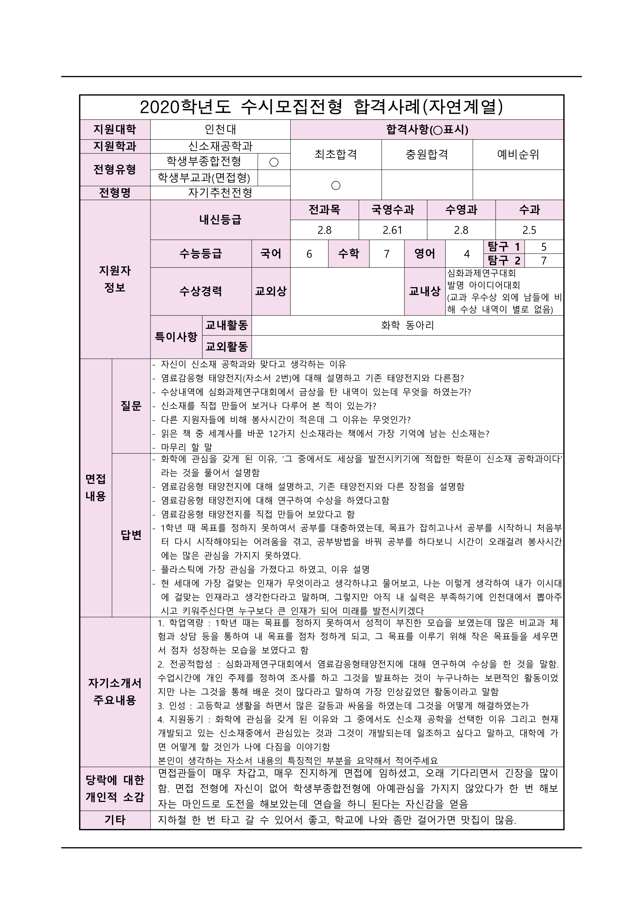2021학년도 인천대학교 면접 후기23 - 신소재공학과 2021학년도 인천대학교 면접 후기24 - 신소재공학과