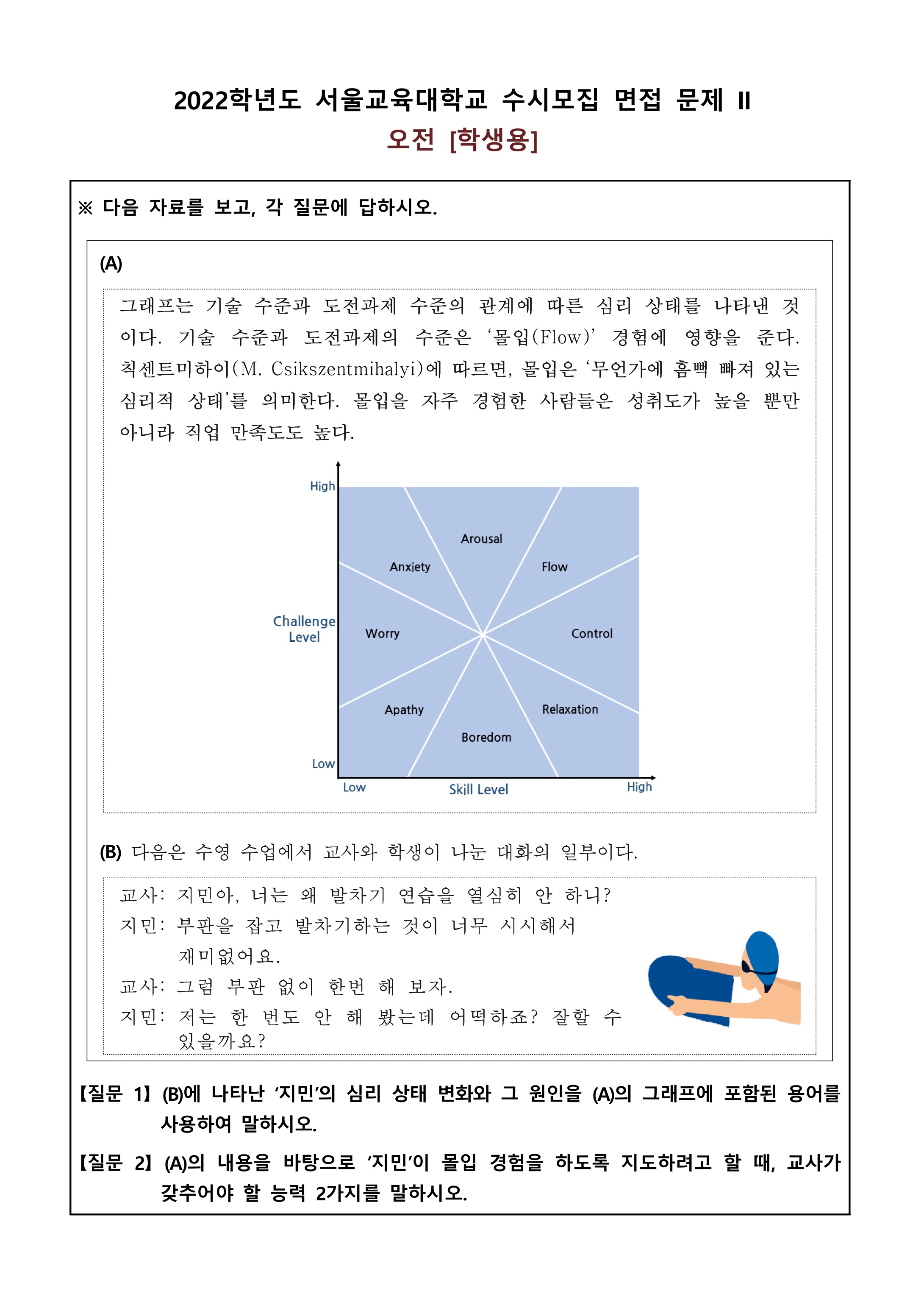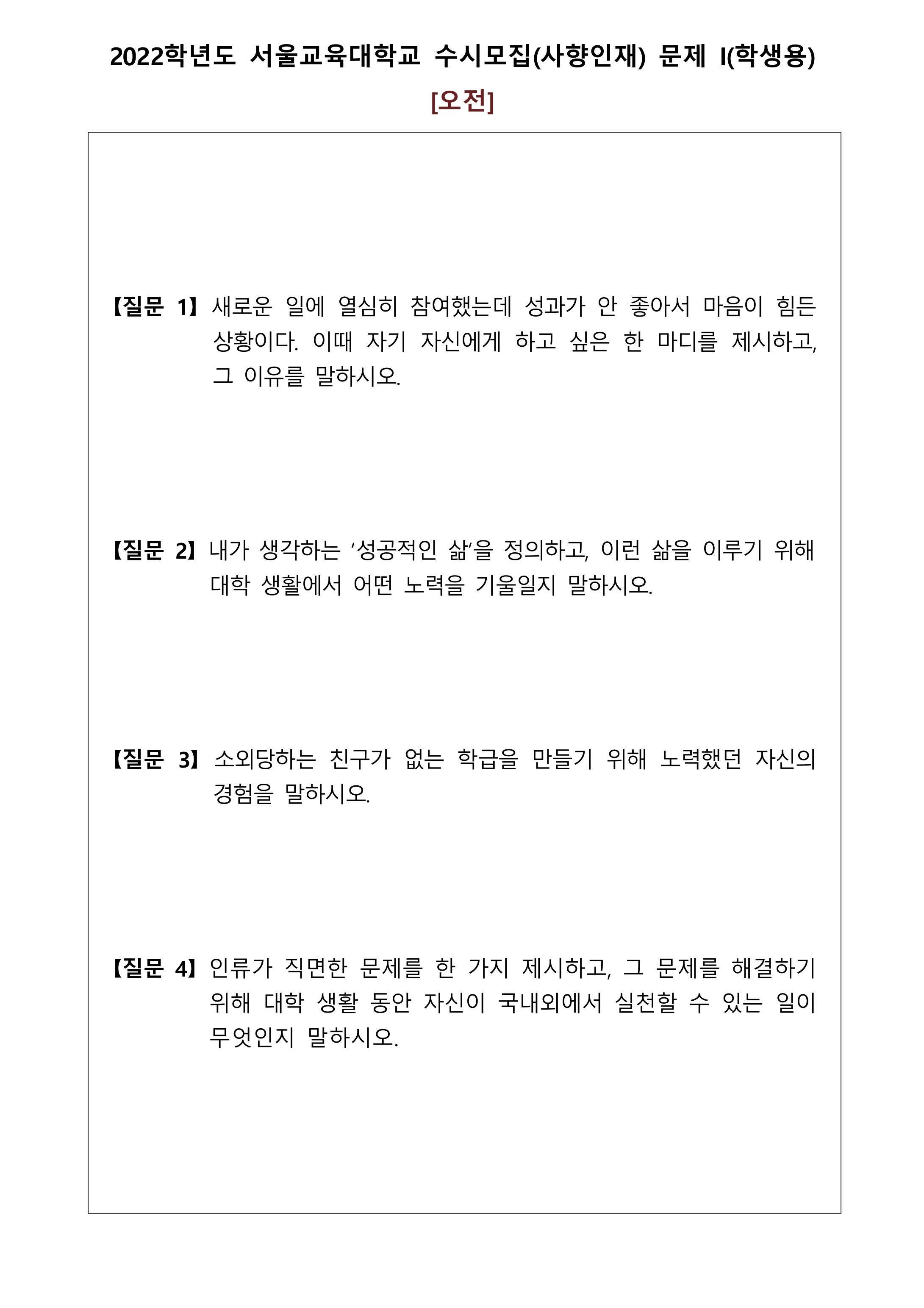 2022학년도 서울교육대학교 수시모집 면접 문제 - 교직적성 오후 2022학년도 서울교육대학교 수시 교직적성 오후.pdf0.45MB2022학년도 서울교육대학교 수시모집 면접 문제 - 사향인재 오전