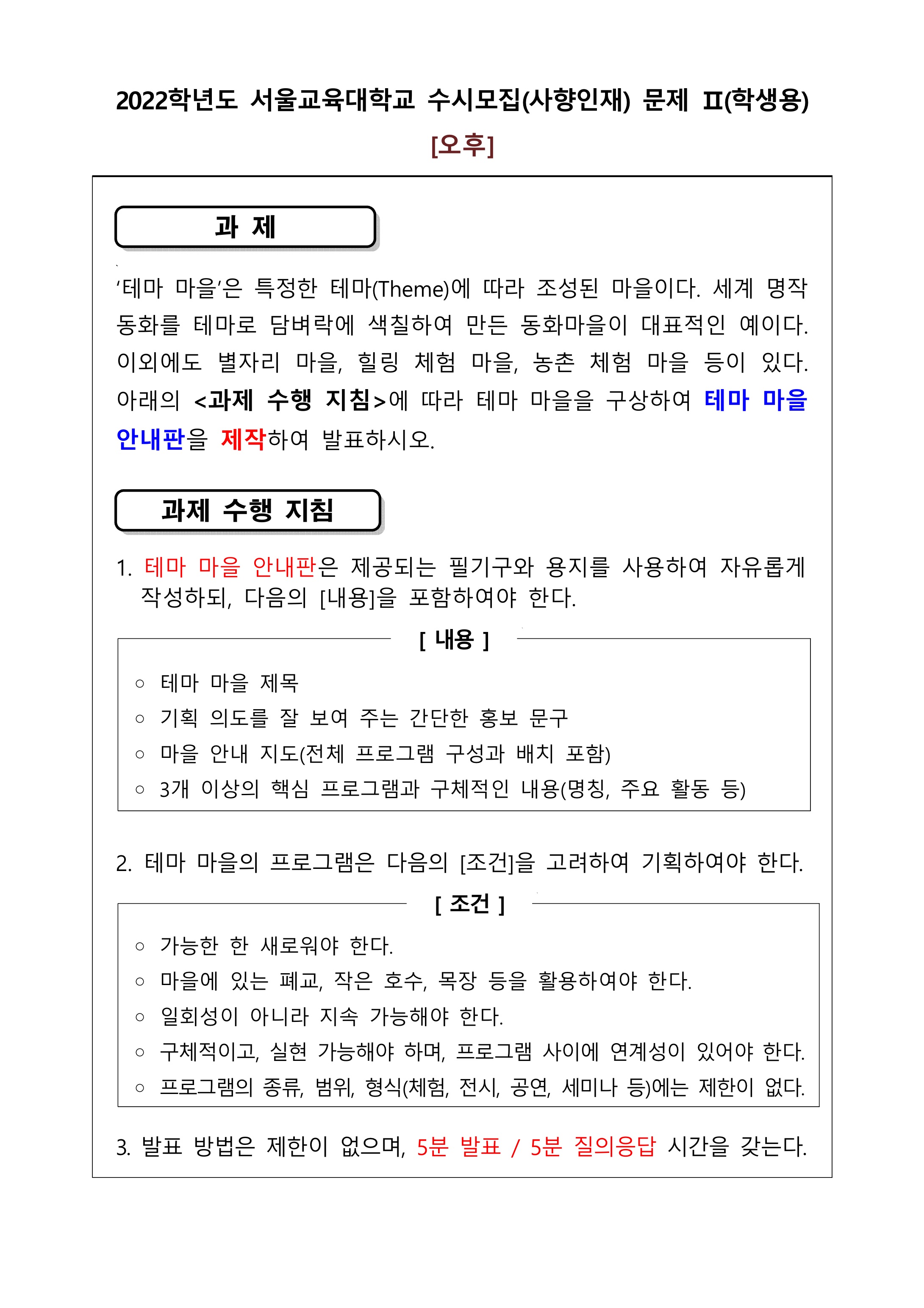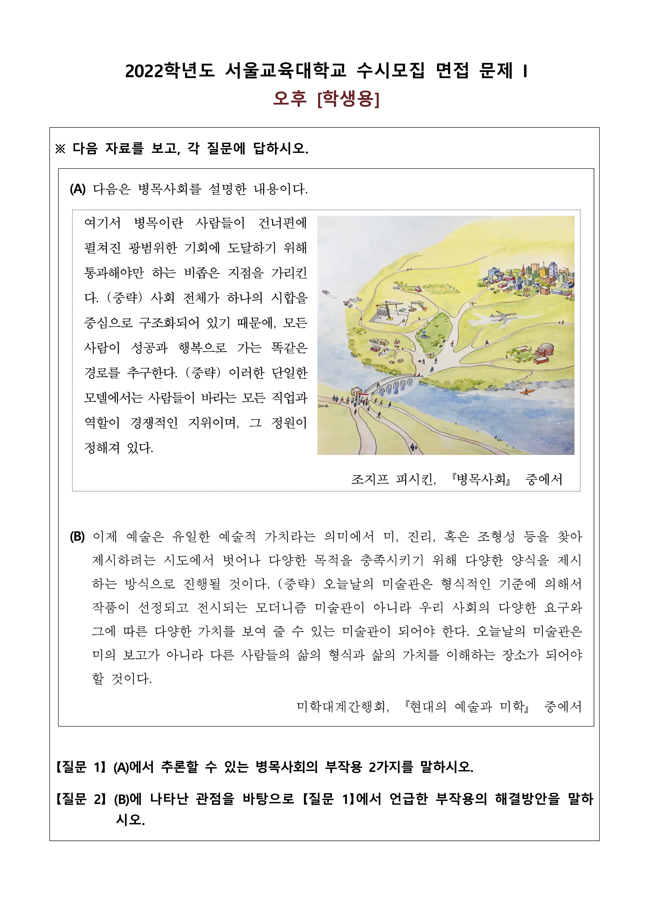 2022학년도 서울교육대학교 수시모집 면접 문제 - 사향인재 오전 2022학년도 서울교육대학교 수시 사향인재 오전.pdf0.04MB2022학년도 서울교육대학교 수시모집 면접 문제 - 사향인재 오후