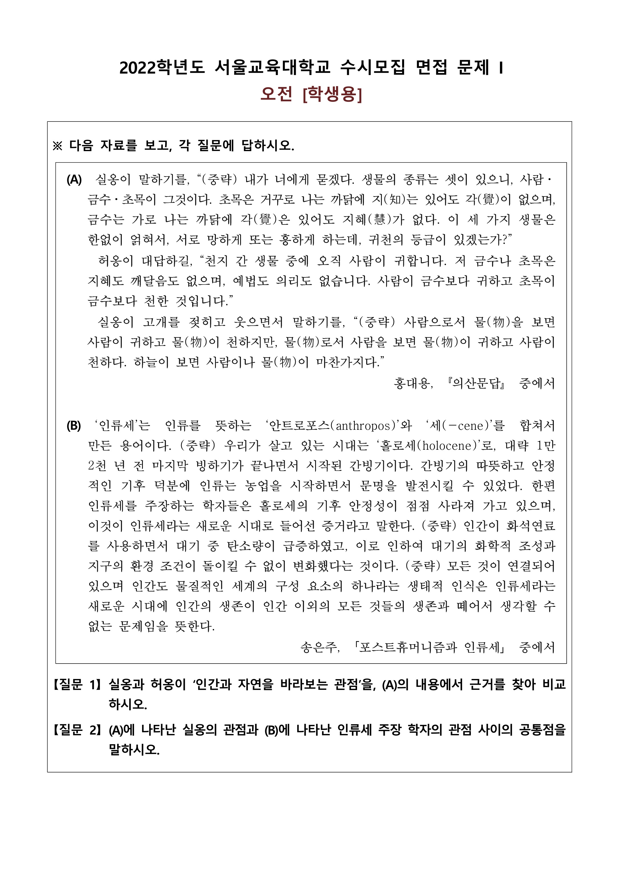 2022학년도 서울교육대학교 수시 면접구술시험 문제입시 정보/면접 2022. 11. 22. 14:35
