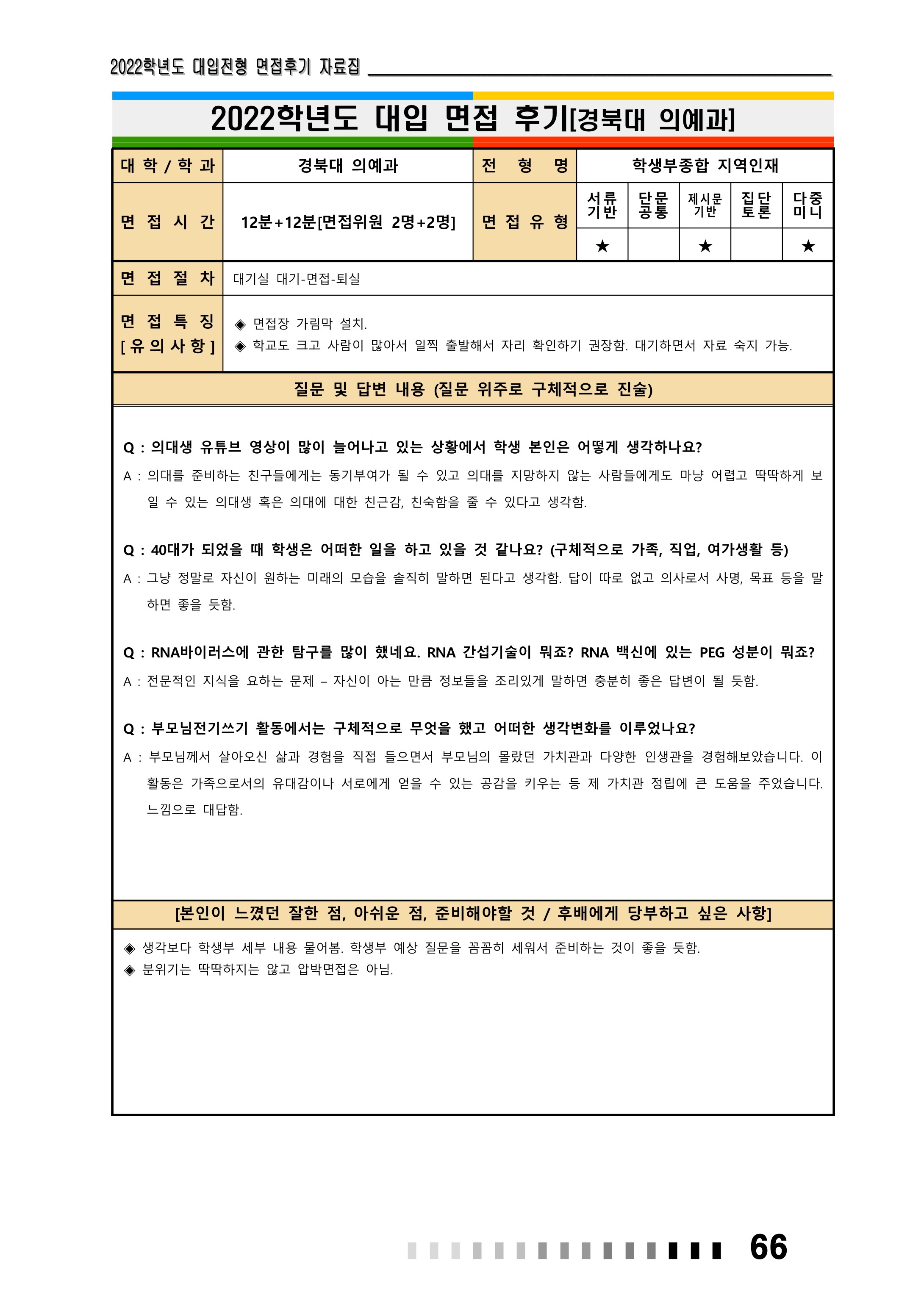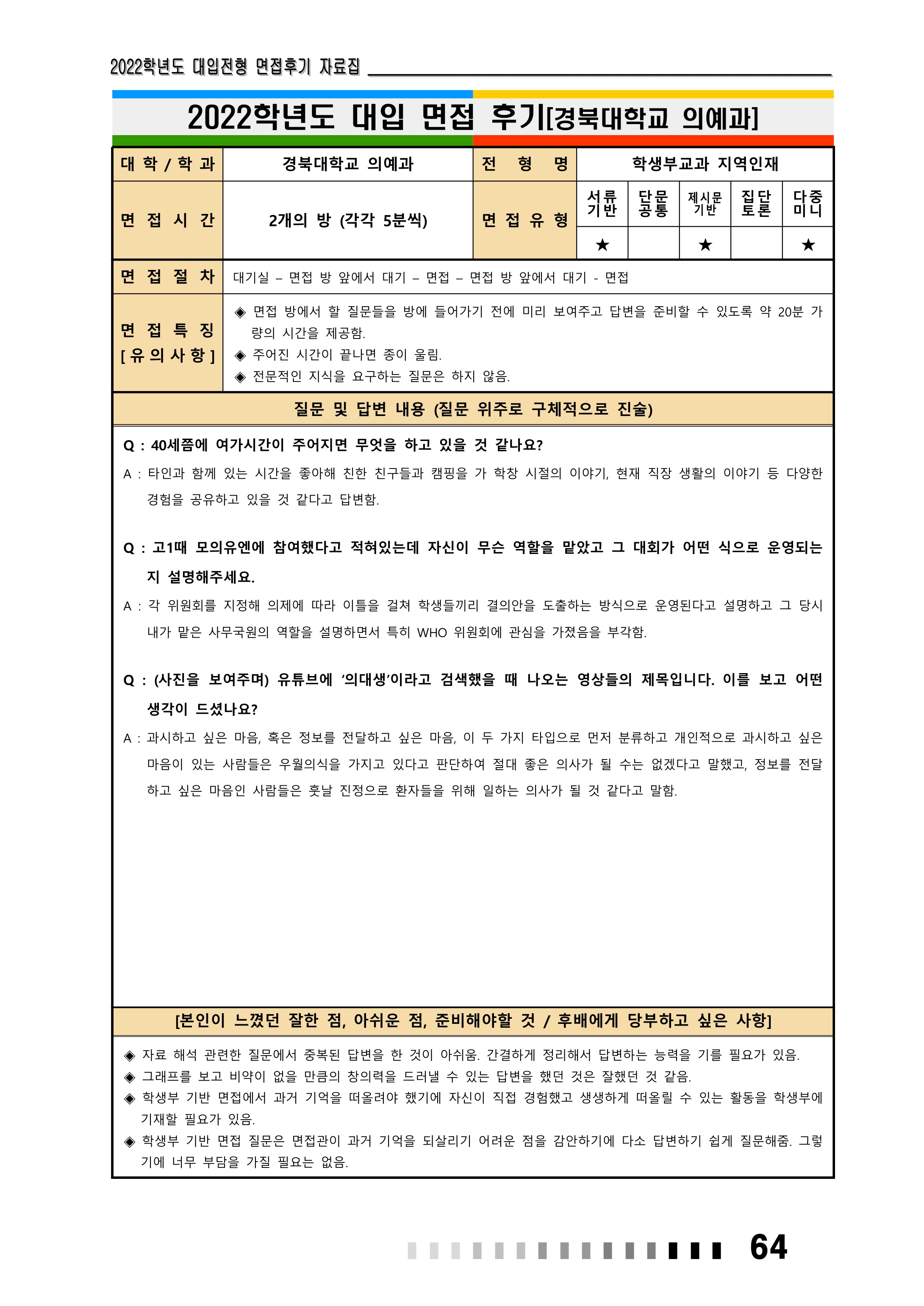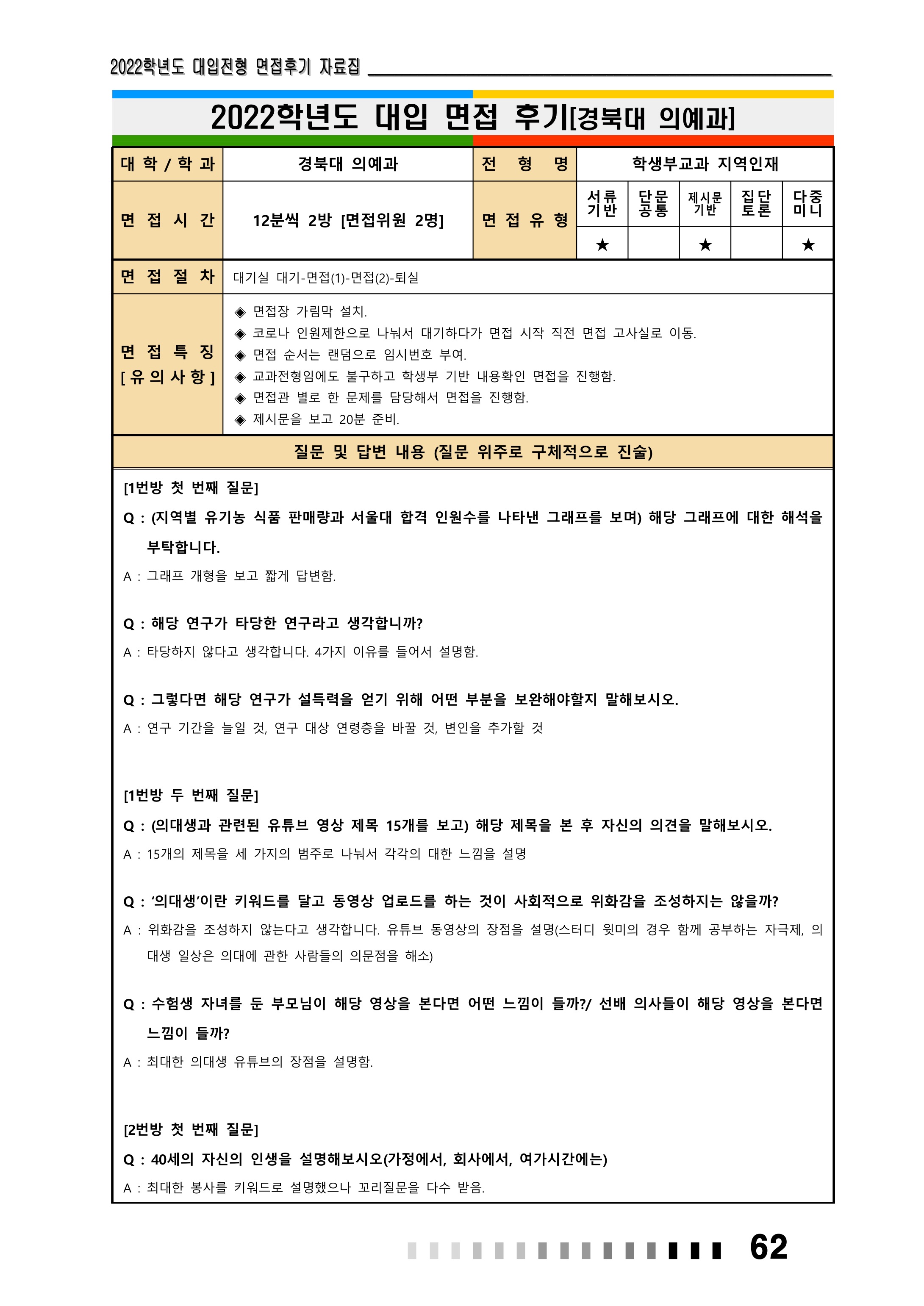 2022학년도 경북대학교 면접 후기33 - 의예과 2022학년도 경북대학교 면접 후기34 - 의예과