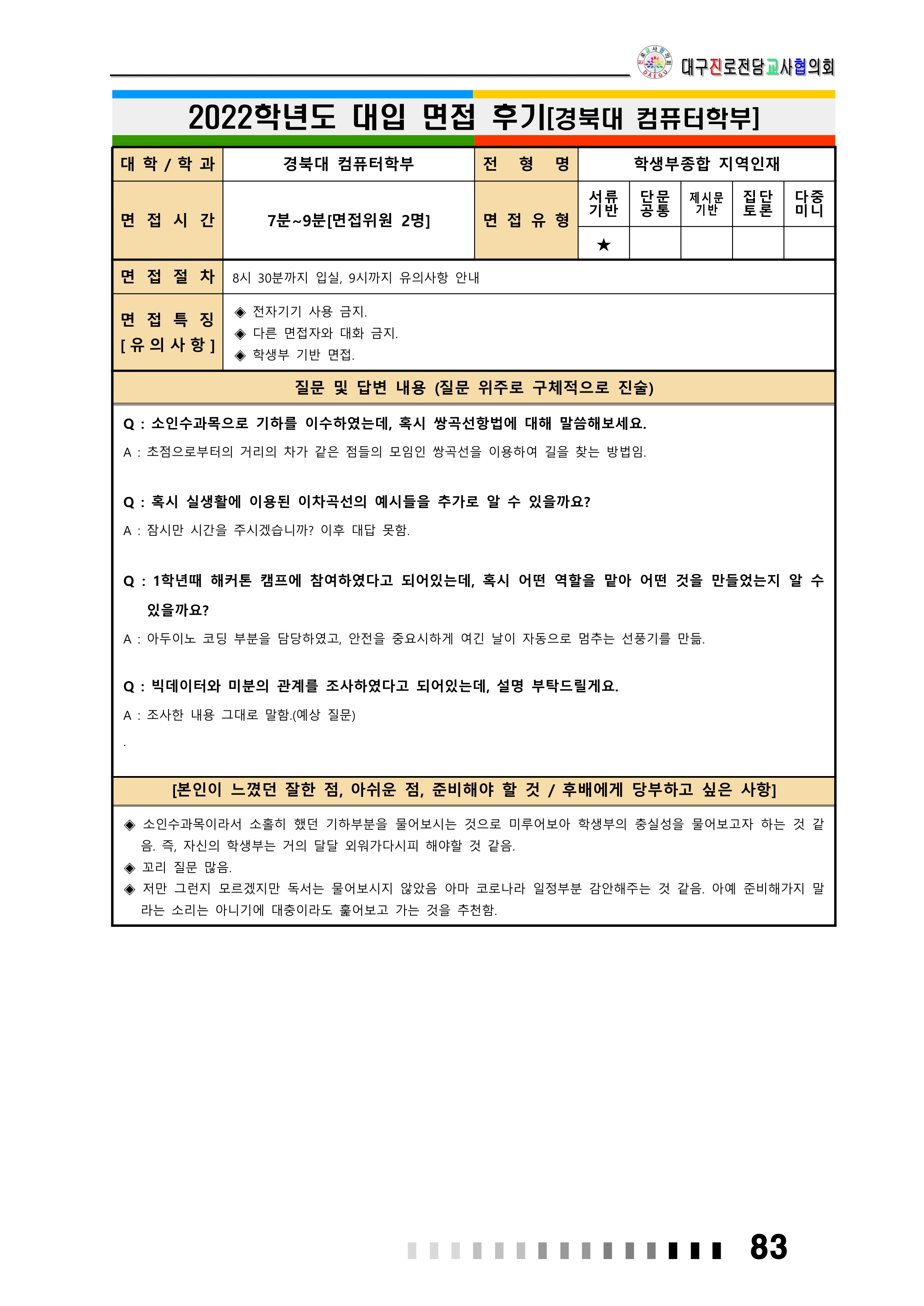 2022학년도 경북대학교 면접 후기46 - 컴퓨터학부 2022학년도 경북대학교 면접 후기47 - 컴퓨터학부