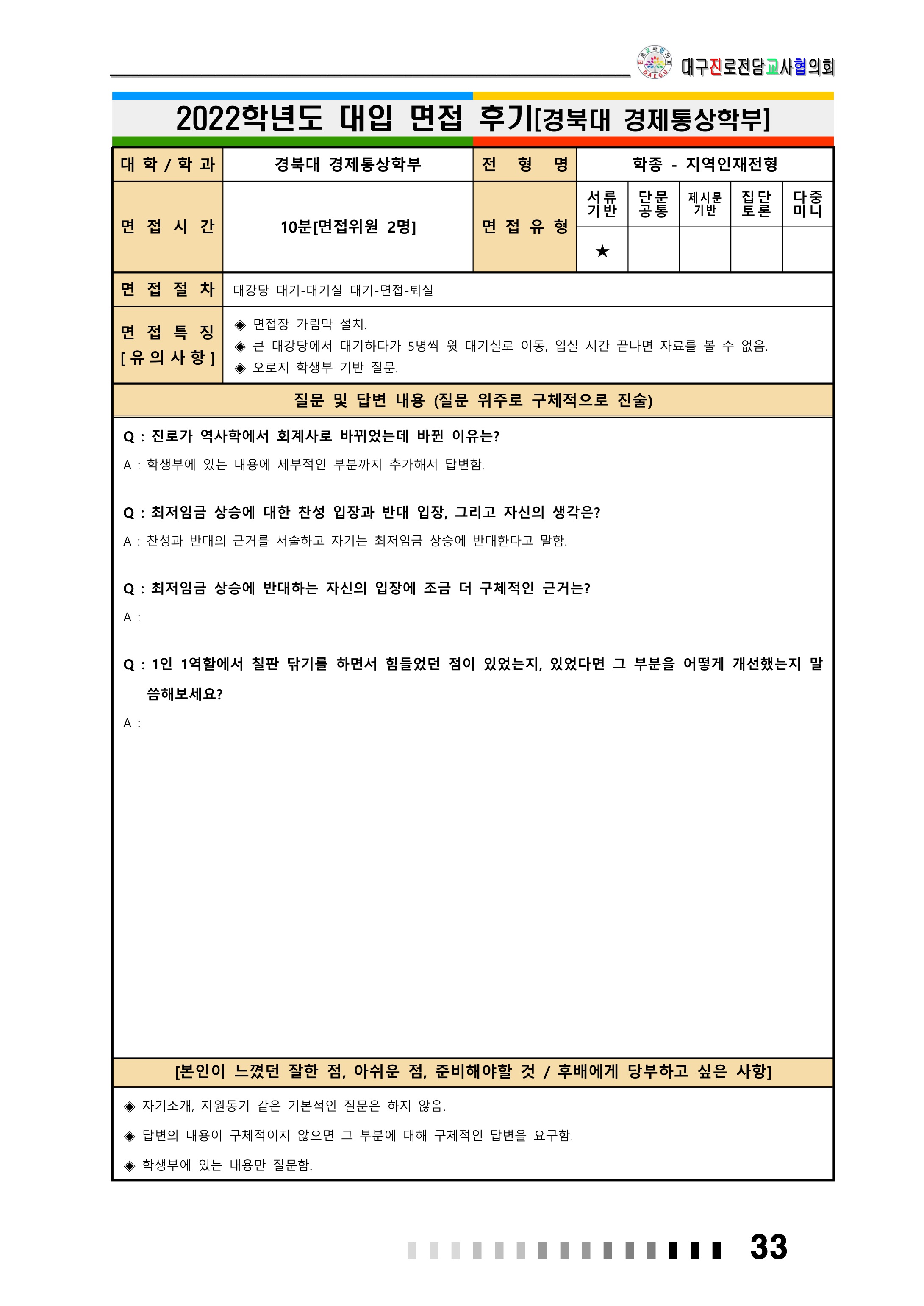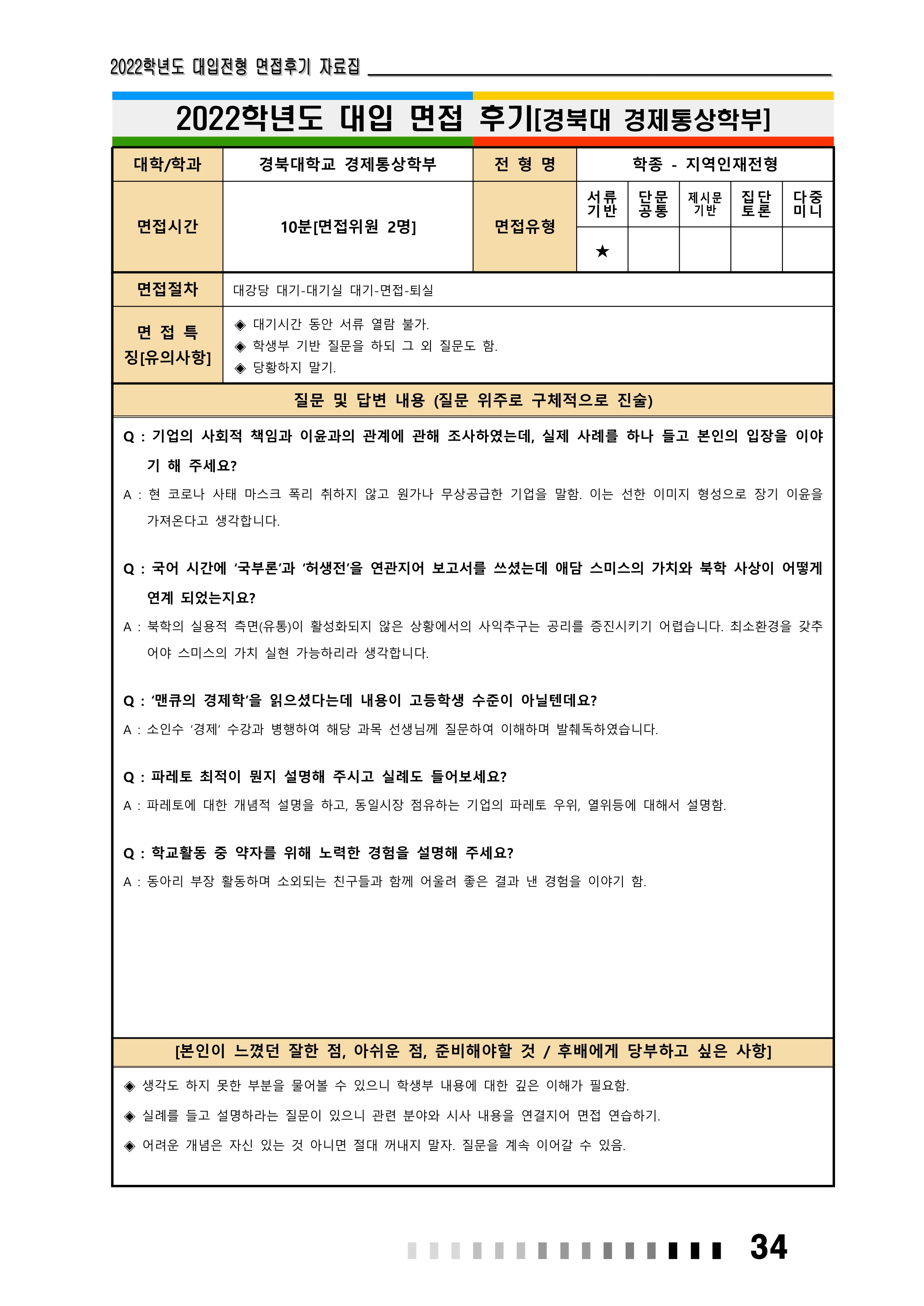 2022학년도 경북대학교 면접 후기5 - 경제통상학부 2022학년도 경북대학교 면접 후기6 - 경제통상학부