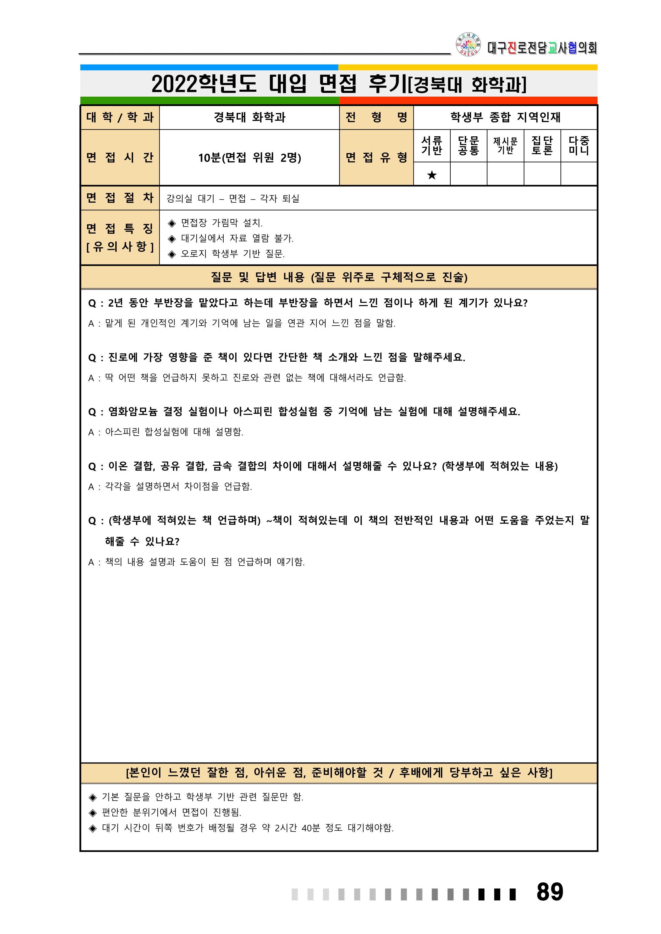 2022학년도 경북대학교 면접 후기27 - 응용화학과 2022학년도 경북대학교 면접 후기28 - 의예과