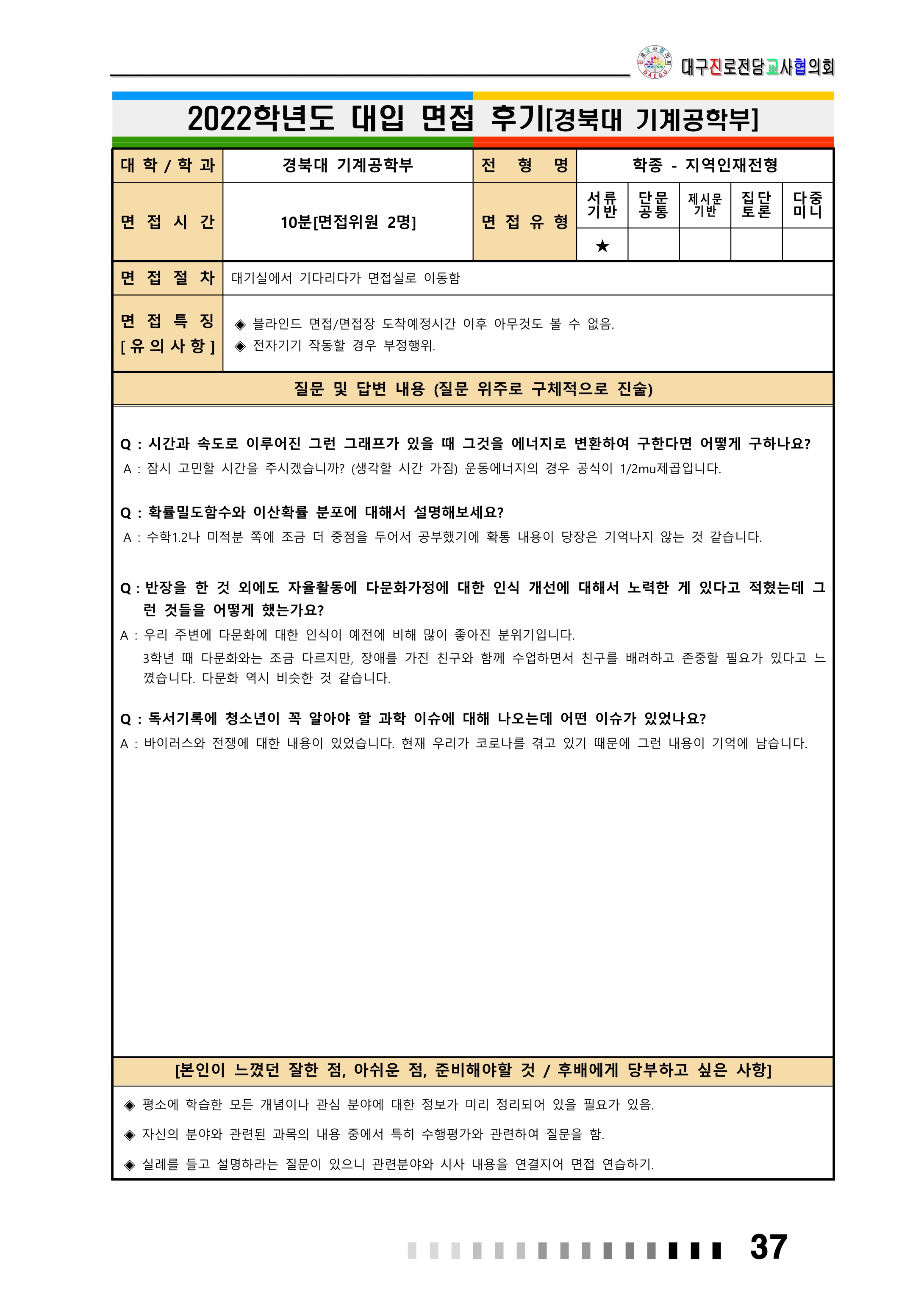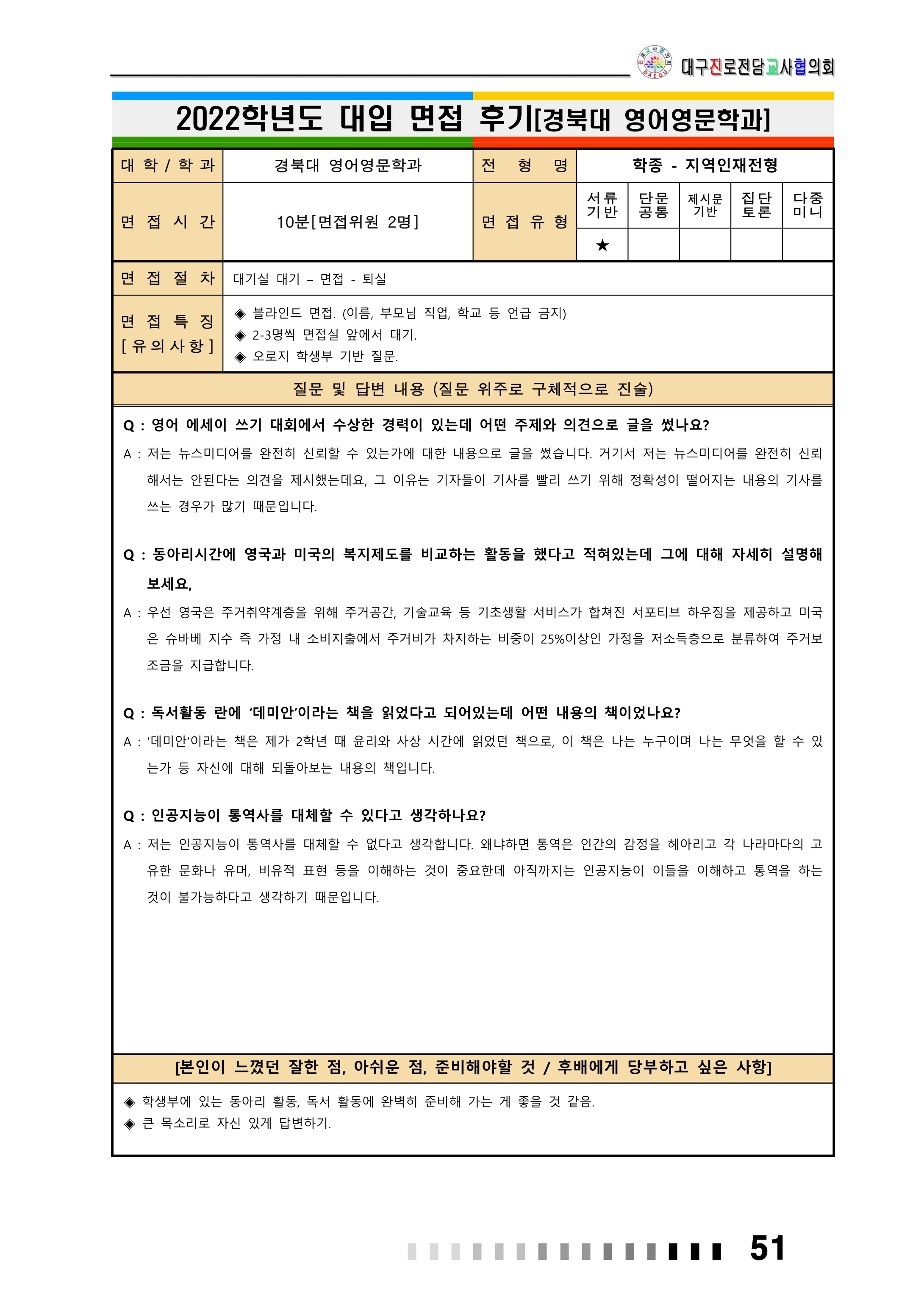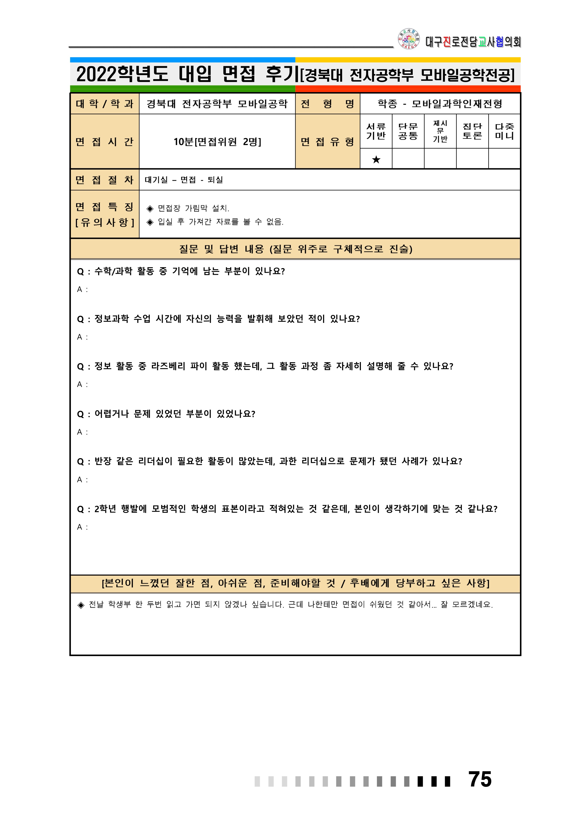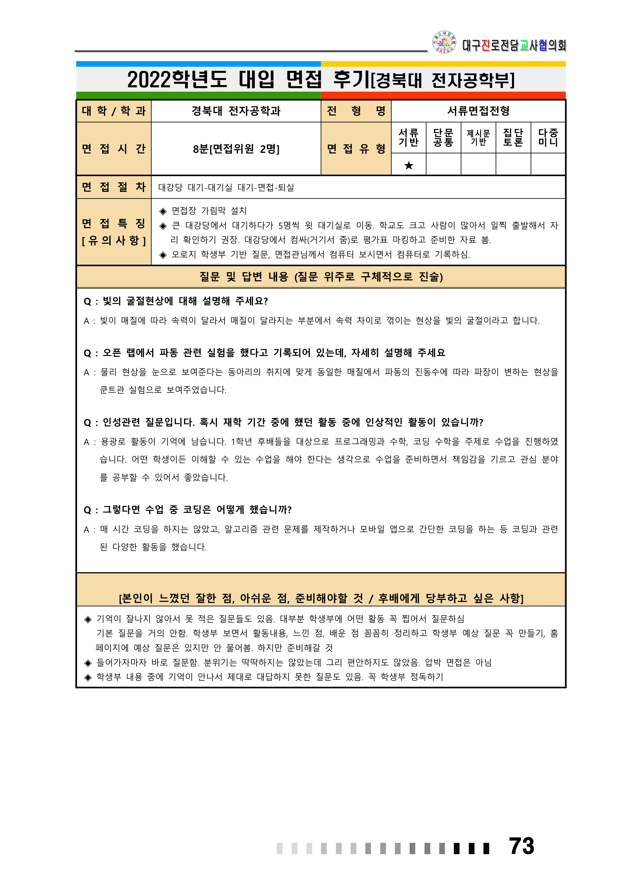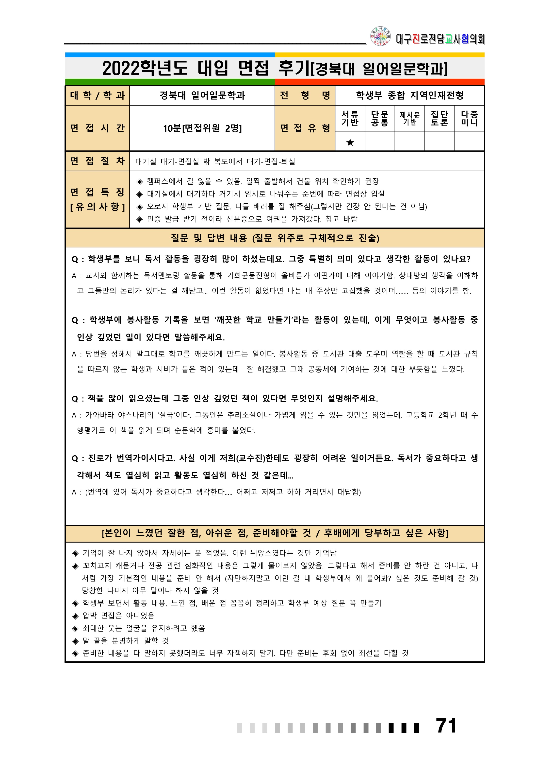 2022학년도 경북대학교 면접 후기36 - 일어일문학과 2022학년도 경북대학교 면접 후기37 - 전자공학부