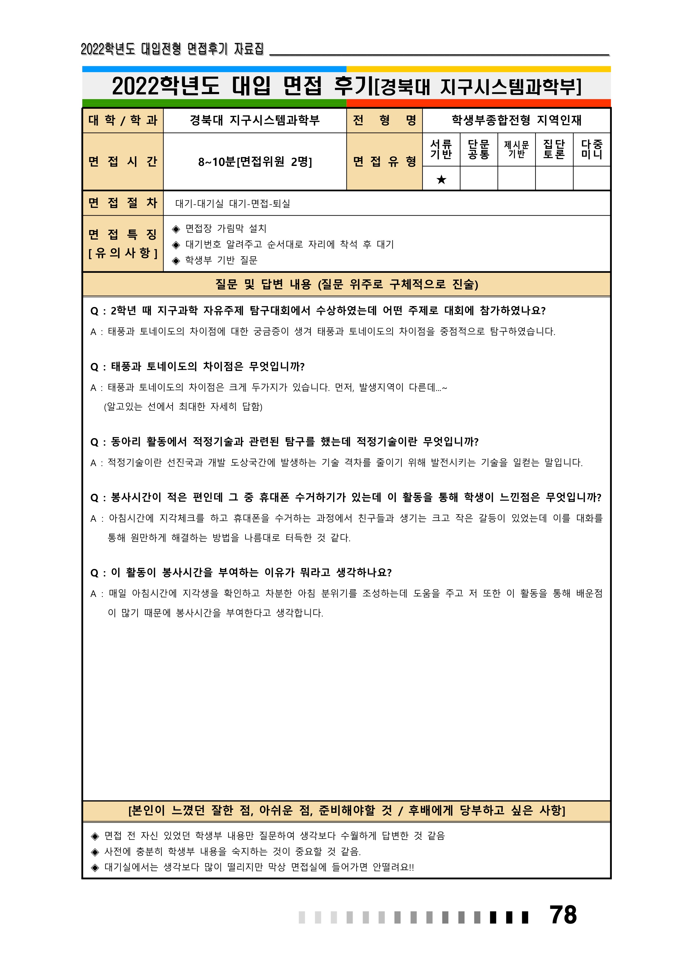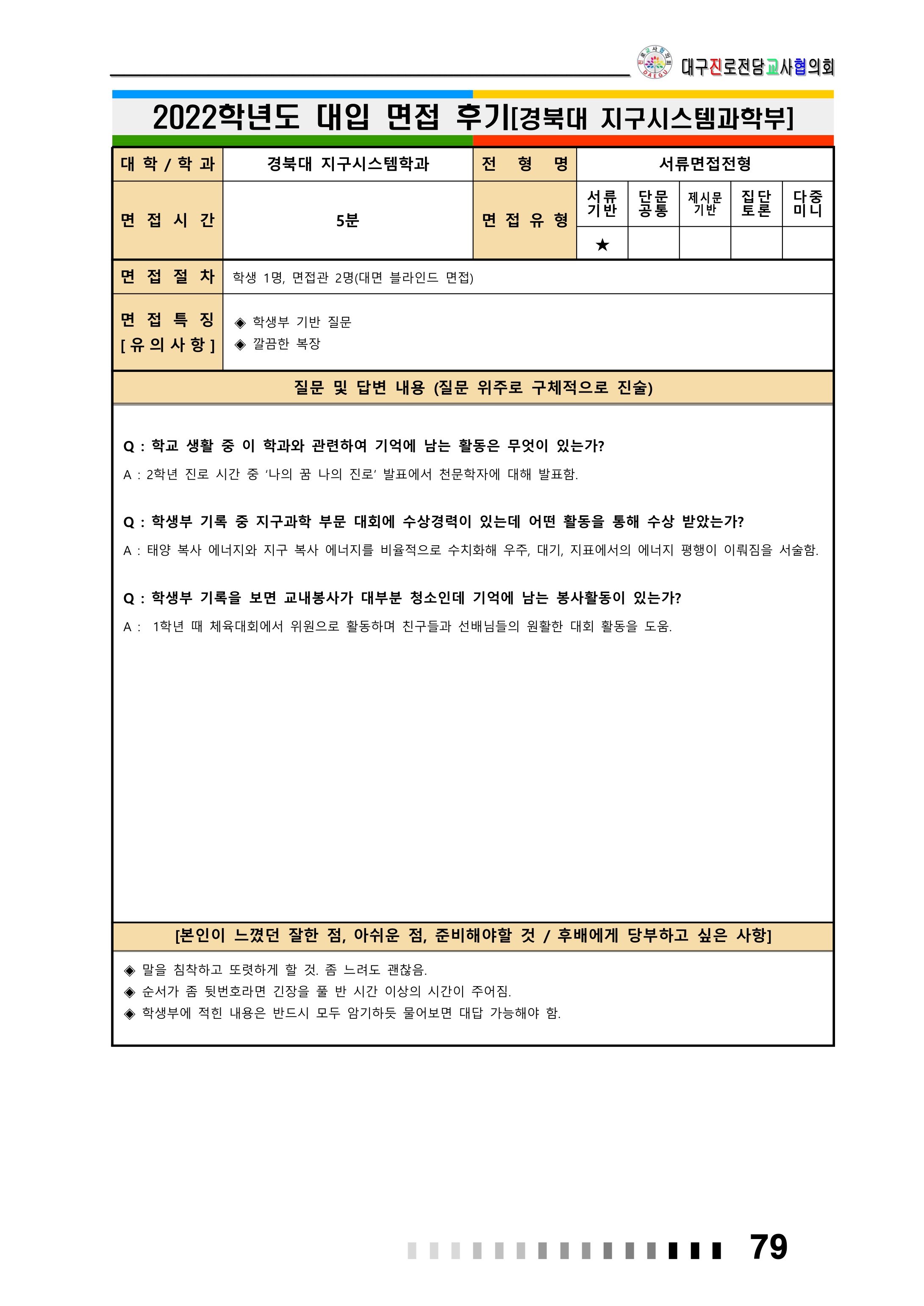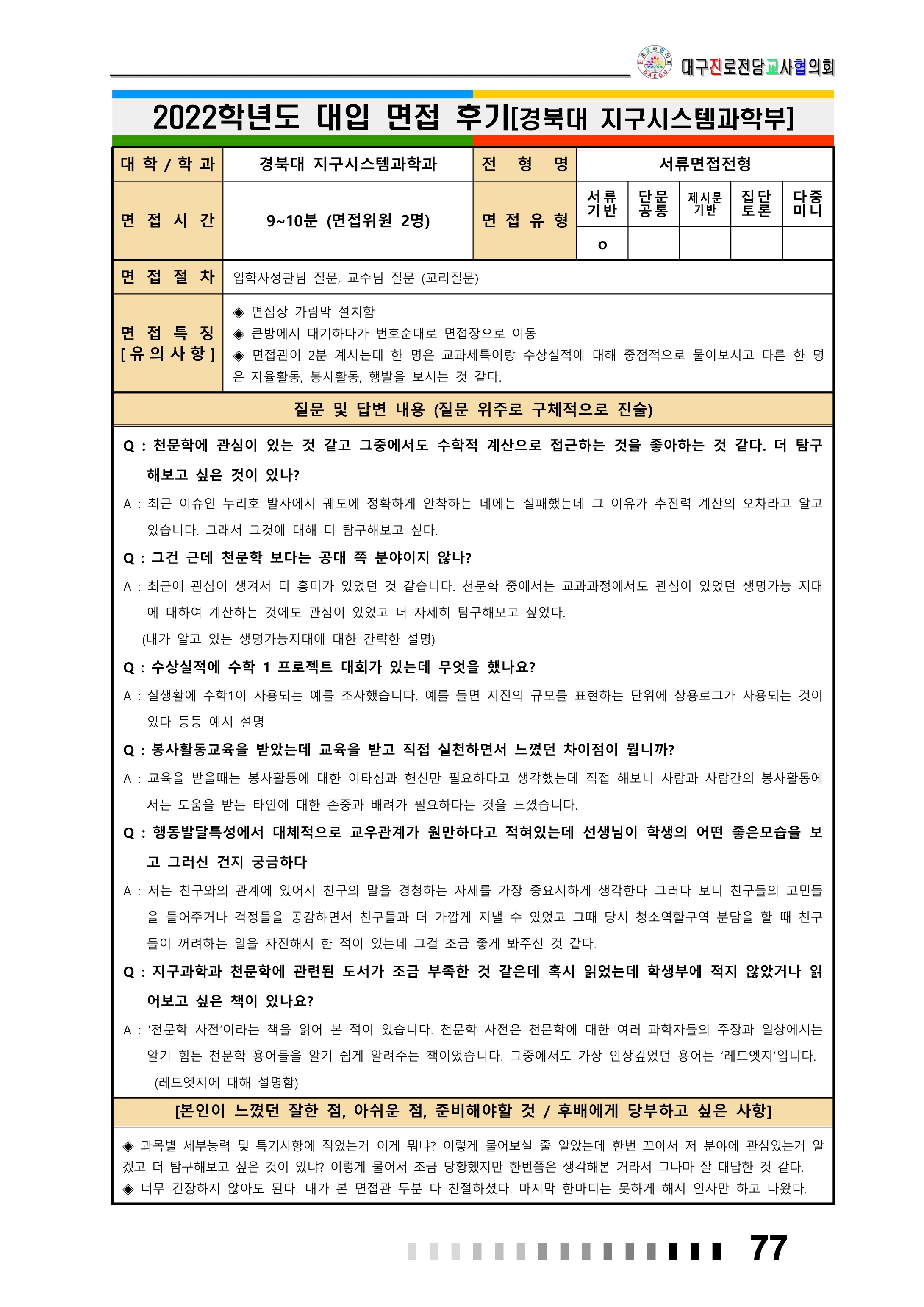 2022학년도 경북대학교 면접 후기41 - 지구시스템과학부 2022학년도 경북대학교 면접 후기42 - 지구시스템과학부