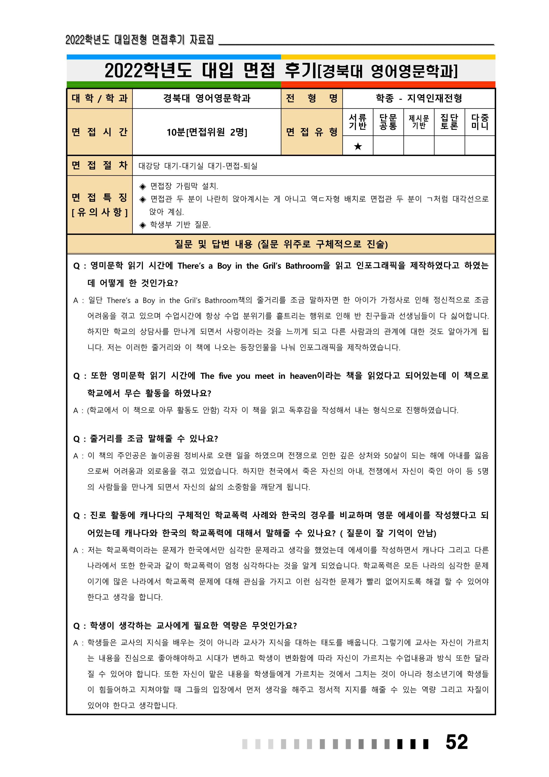 2022학년도 경북대학교 면접 후기23 - 영어영문학과 2022학년도 경북대학교 면접 후기24 - 응용생명과학부