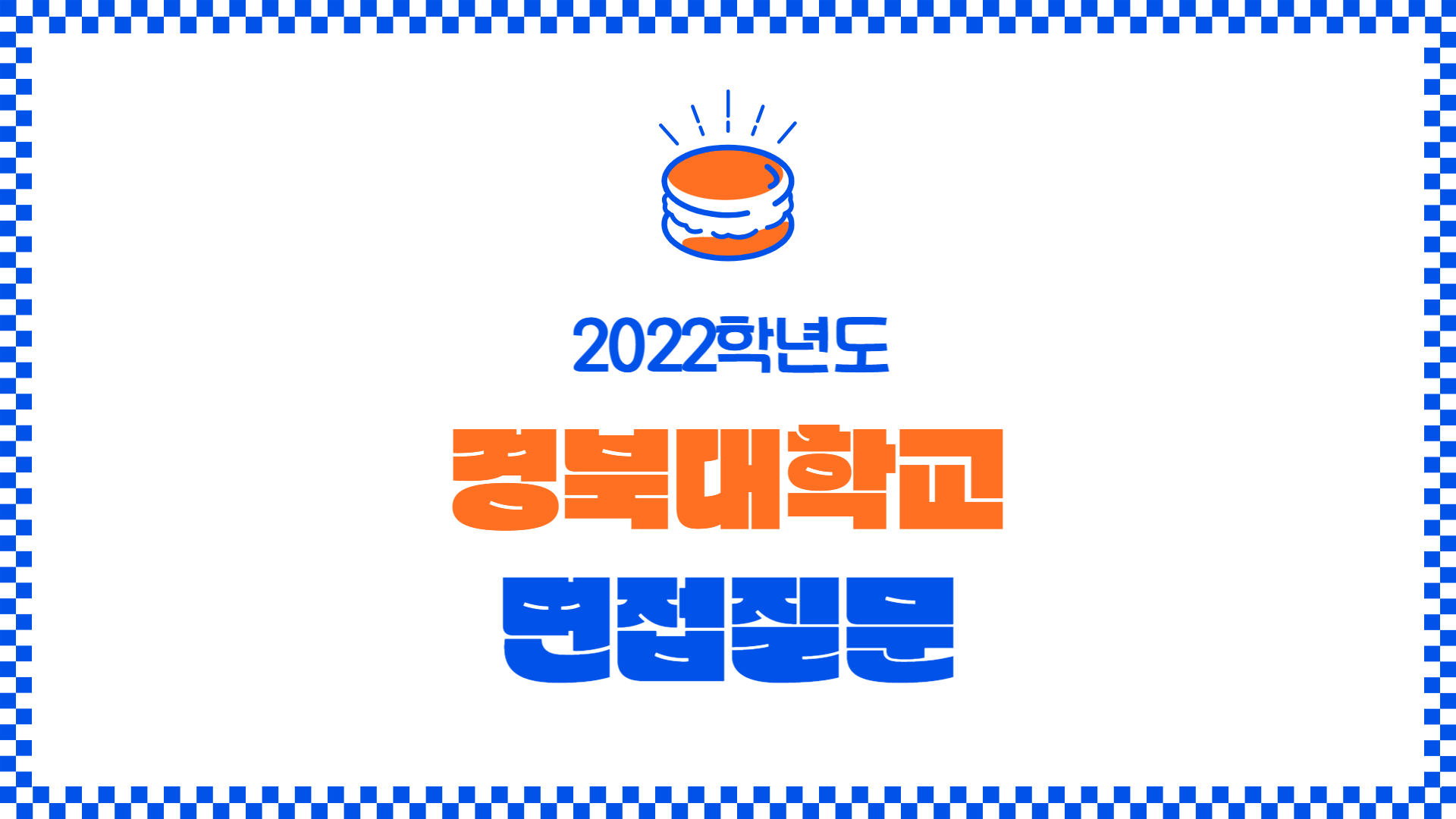 2022학년도 경북대학교 면접 질문 횐님들 안녕하세영~~ 오늘은 2022학년도 경북대학교 수시에서 출제된 면접 질문에 대해서 알아볼 거예영. 경북대학교 학생부종합(일반학생·지역인재·국가보훈대상자·사회배려자·고졸재직자·영농창업인재·SW특별·농어촌학생·기초생활수급자등대상자·특성화고졸업자·특성화고졸재직자·모바일과학인재·장애인등대상자)전형에 지원한 횐님들은 면접 평가를 봐야하는데영, 면접에서는 학업역량, 전공적합성, 발전가능성, 인성을 평가한다고 해영. 의예과는 인·적성 면접을 실시하니 아래 후기에서 자세히 살펴보시면 됩니다. 2023학년도와 2021학년도 면접 기출은 맨 아래에 링크돼 있어영.🌞