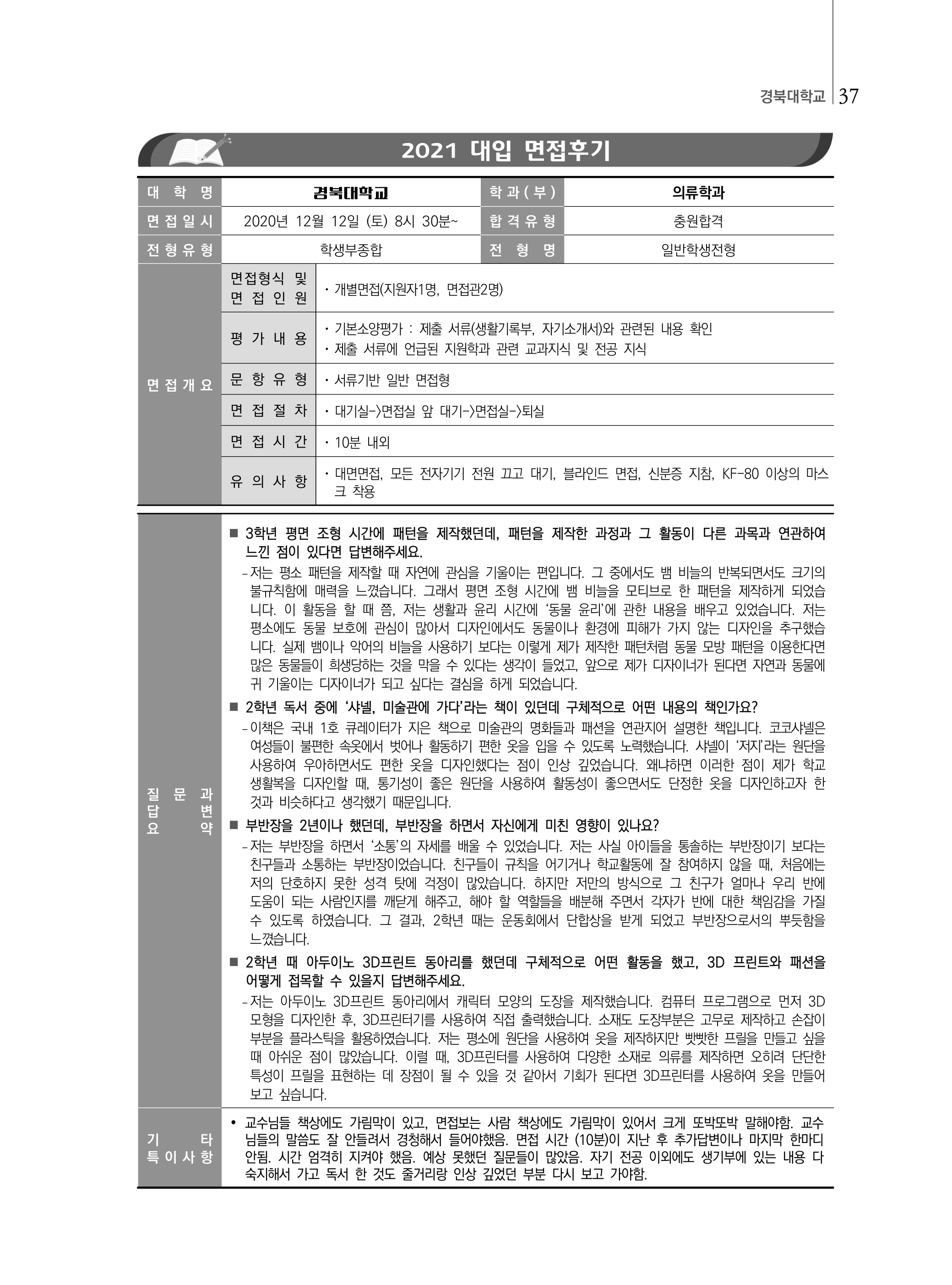 2021학년도 경북대학교 면접 후기87 - 의류학과 2021학년도 경북대학교 면접 후기88 - 의예과