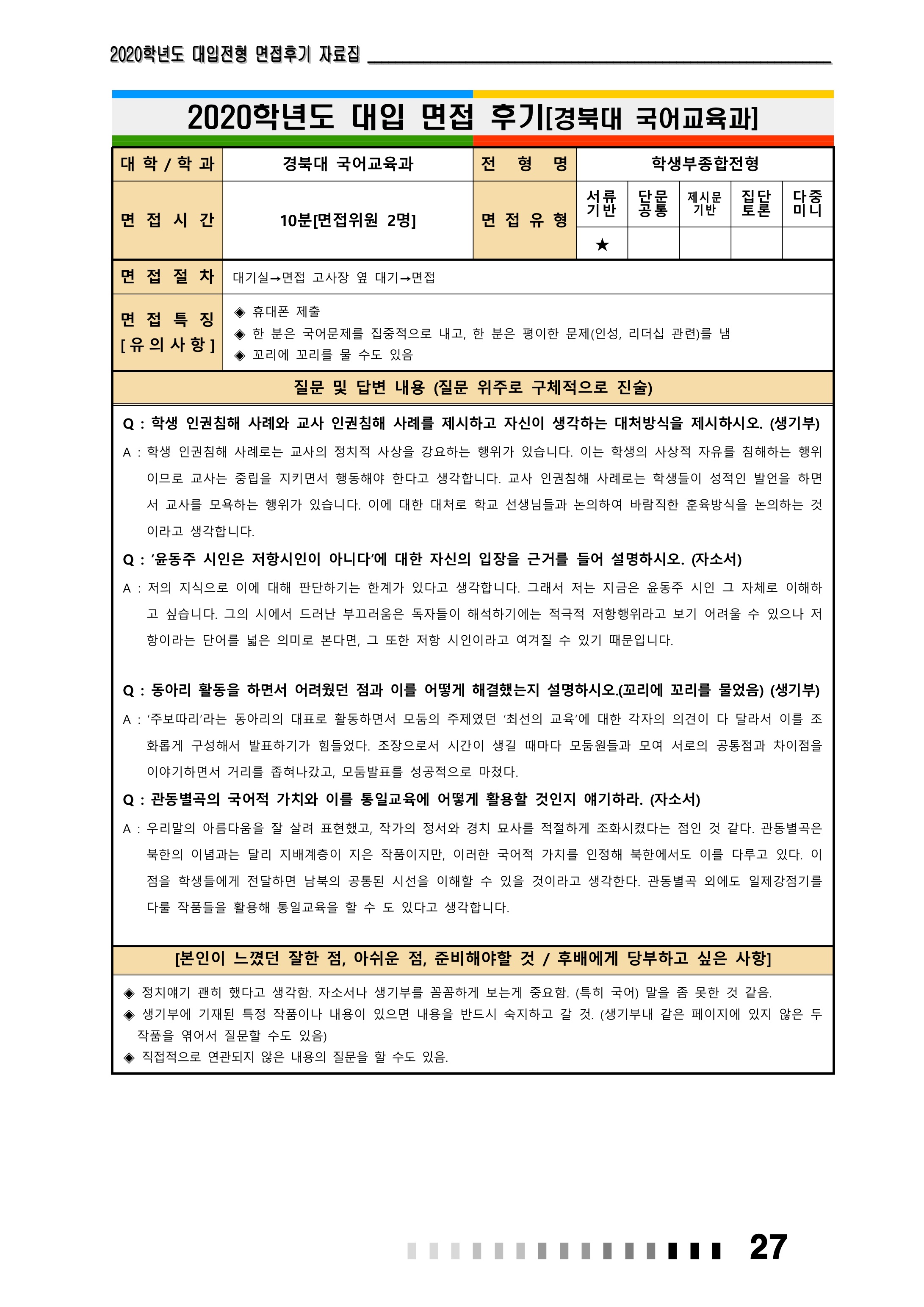 2021학년도 경북대학교 면접 후기66 - 역사교육학과 2021학년도 경북대학교 면접 후기67 - 영어영문학과