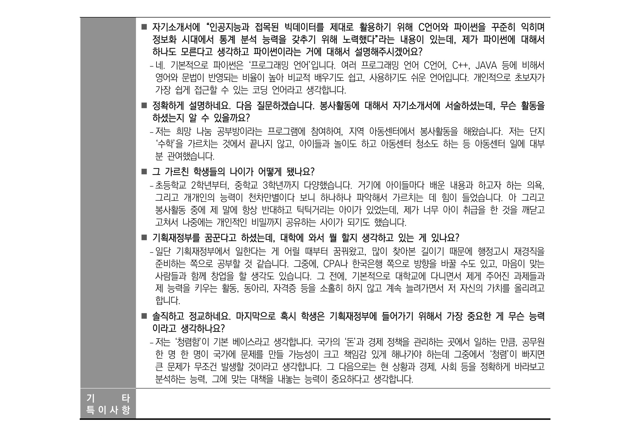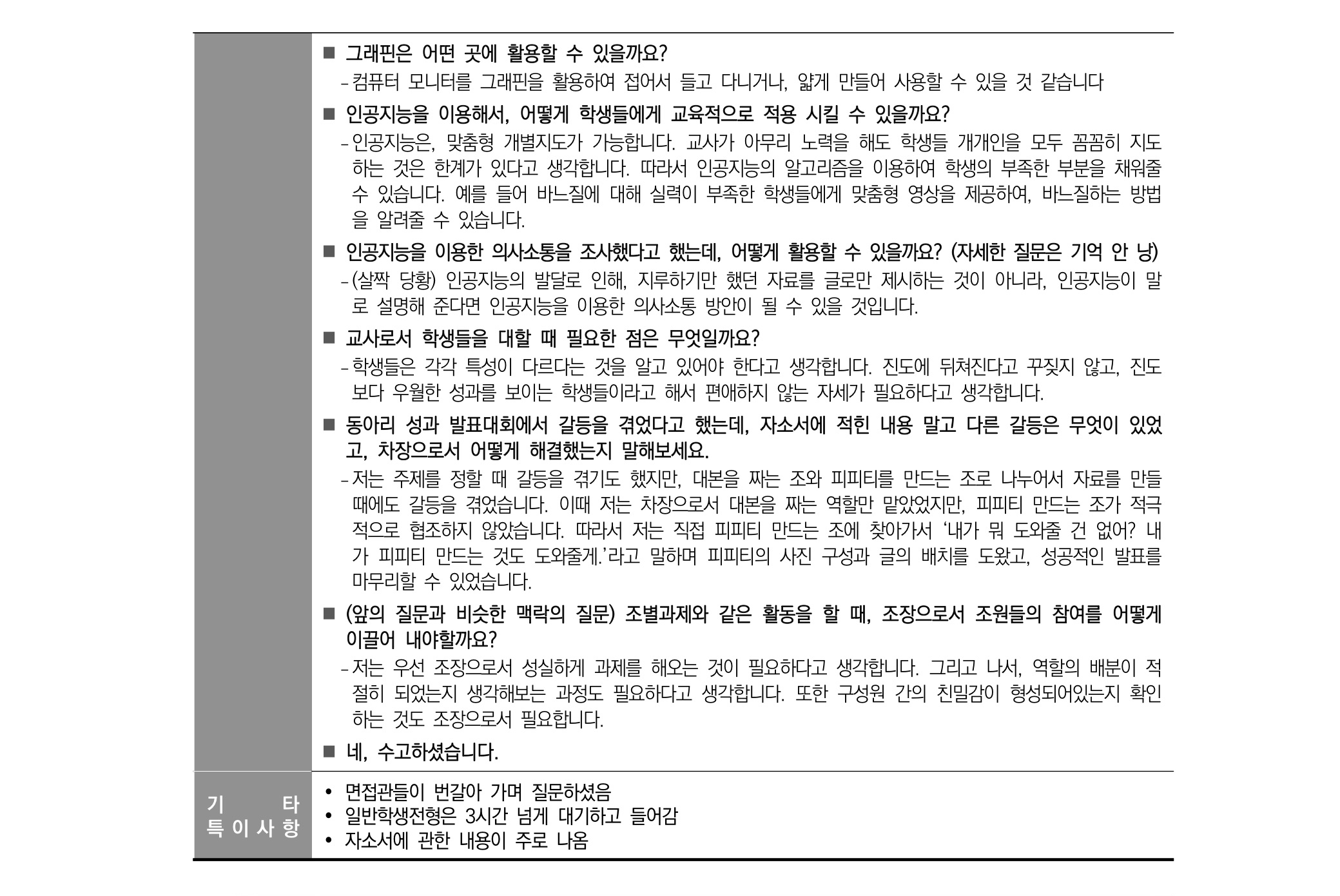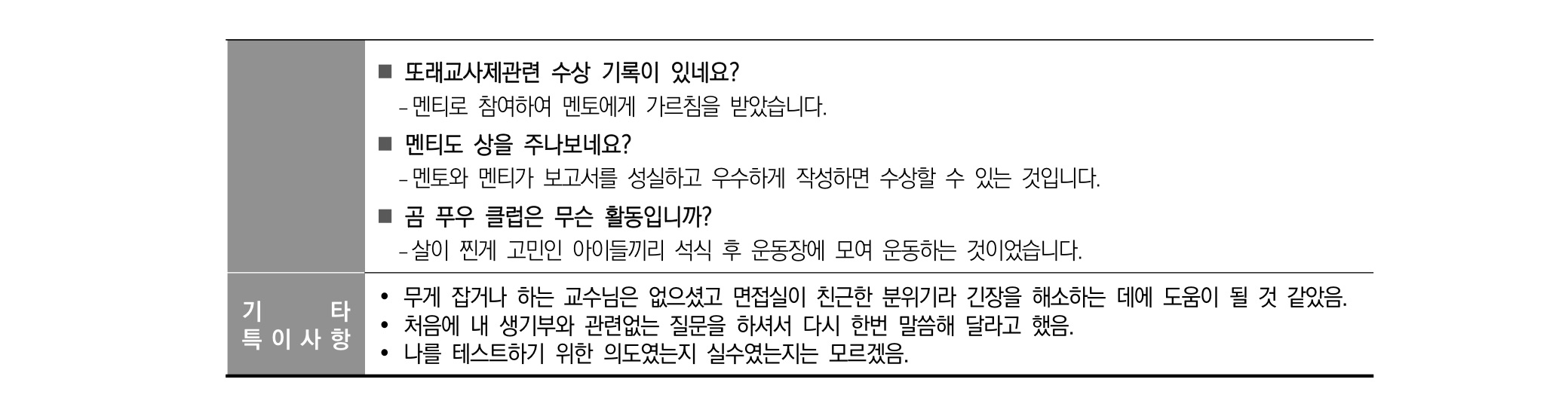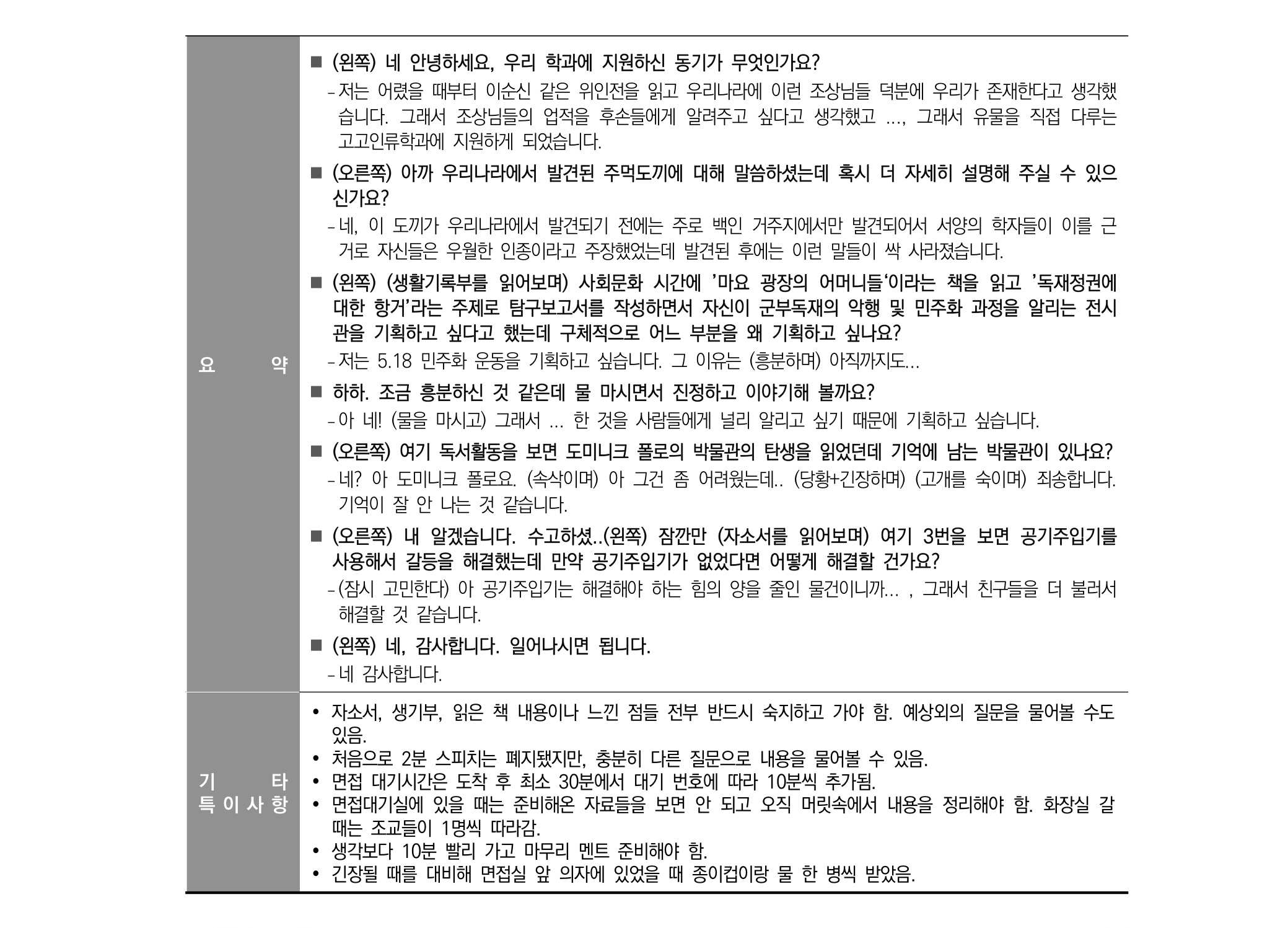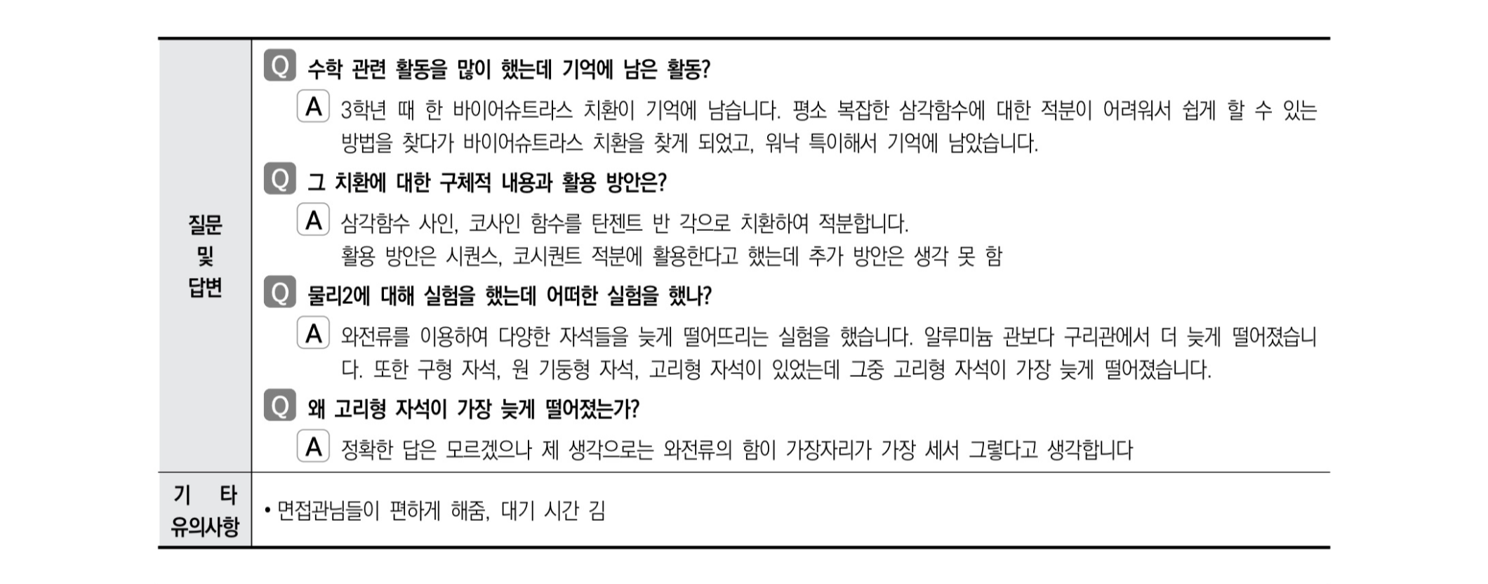특기자(체육)전형: 서류기반 블라인드 면접. 면접위원 3인 1조로 개별면접2021학년도 수시 면접 기출 사례