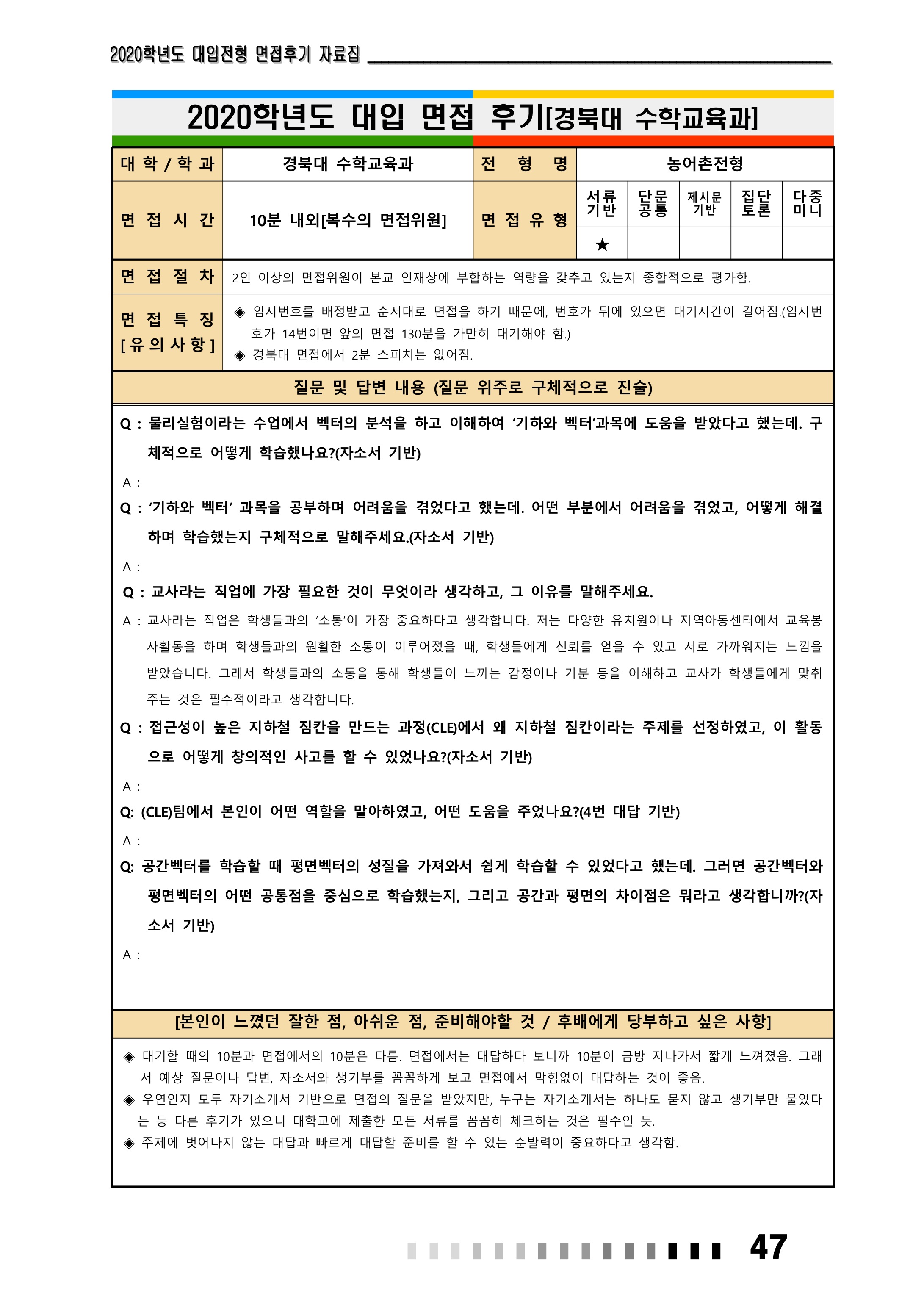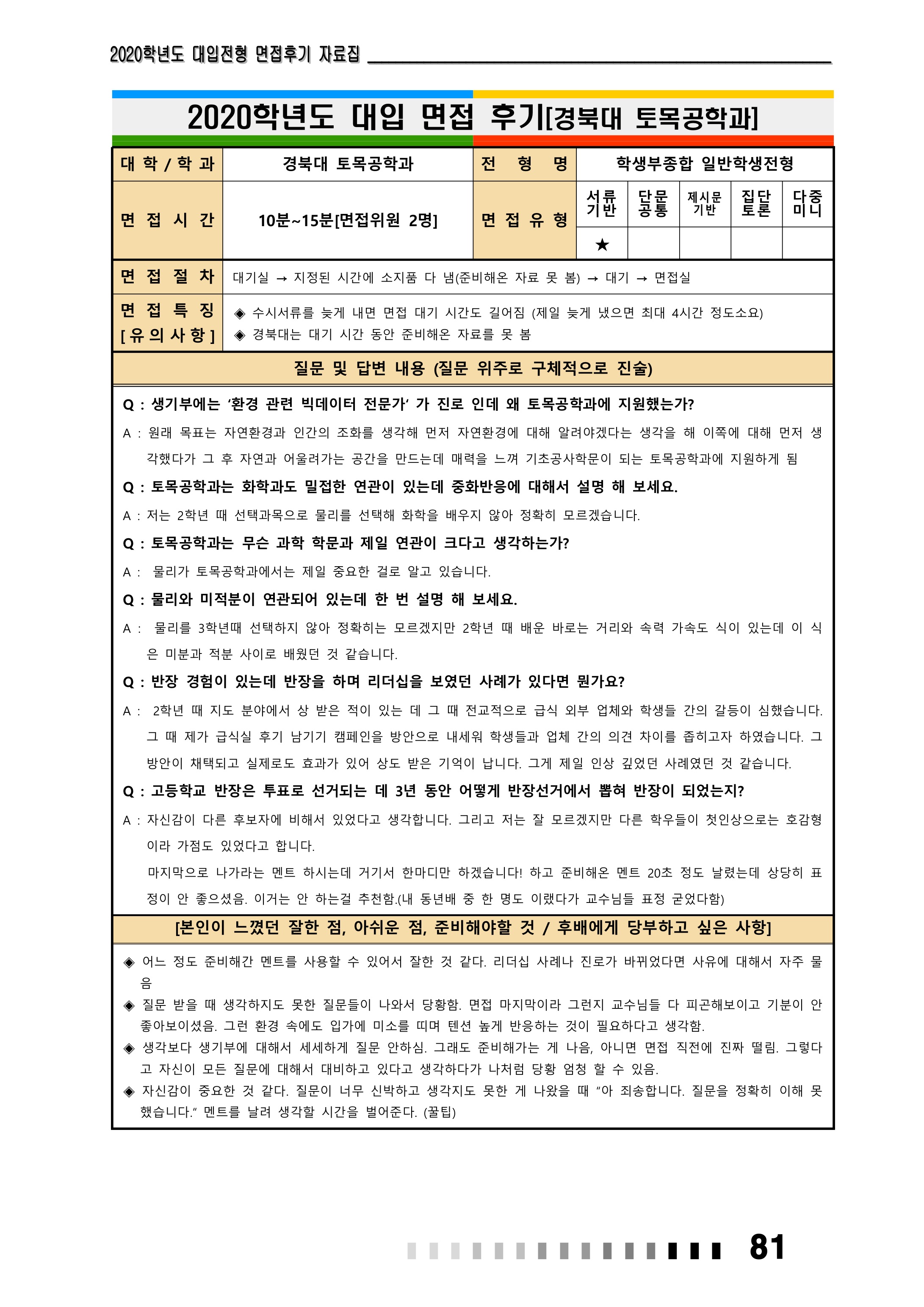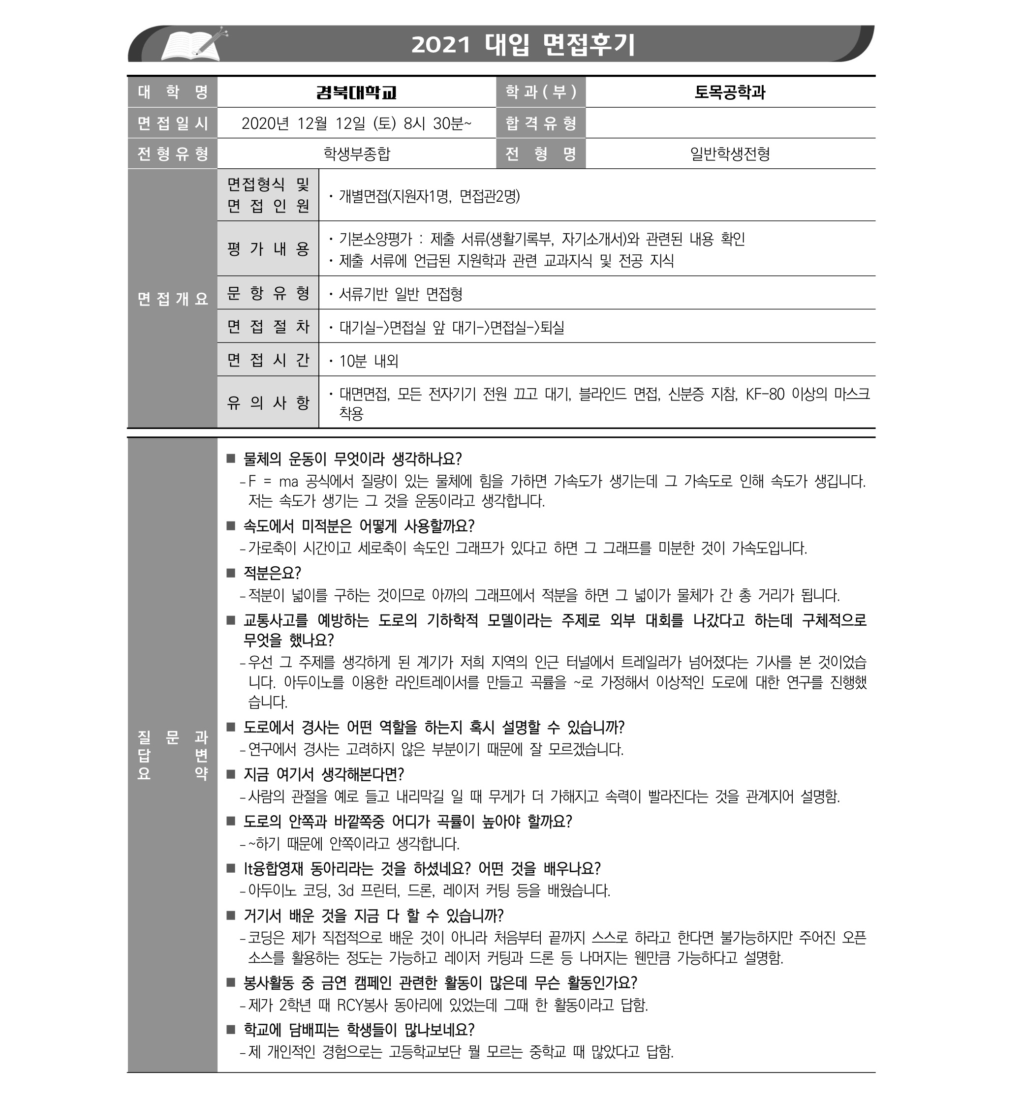 2021학년도 경북대학교 면접 후기121 - 토목공학과