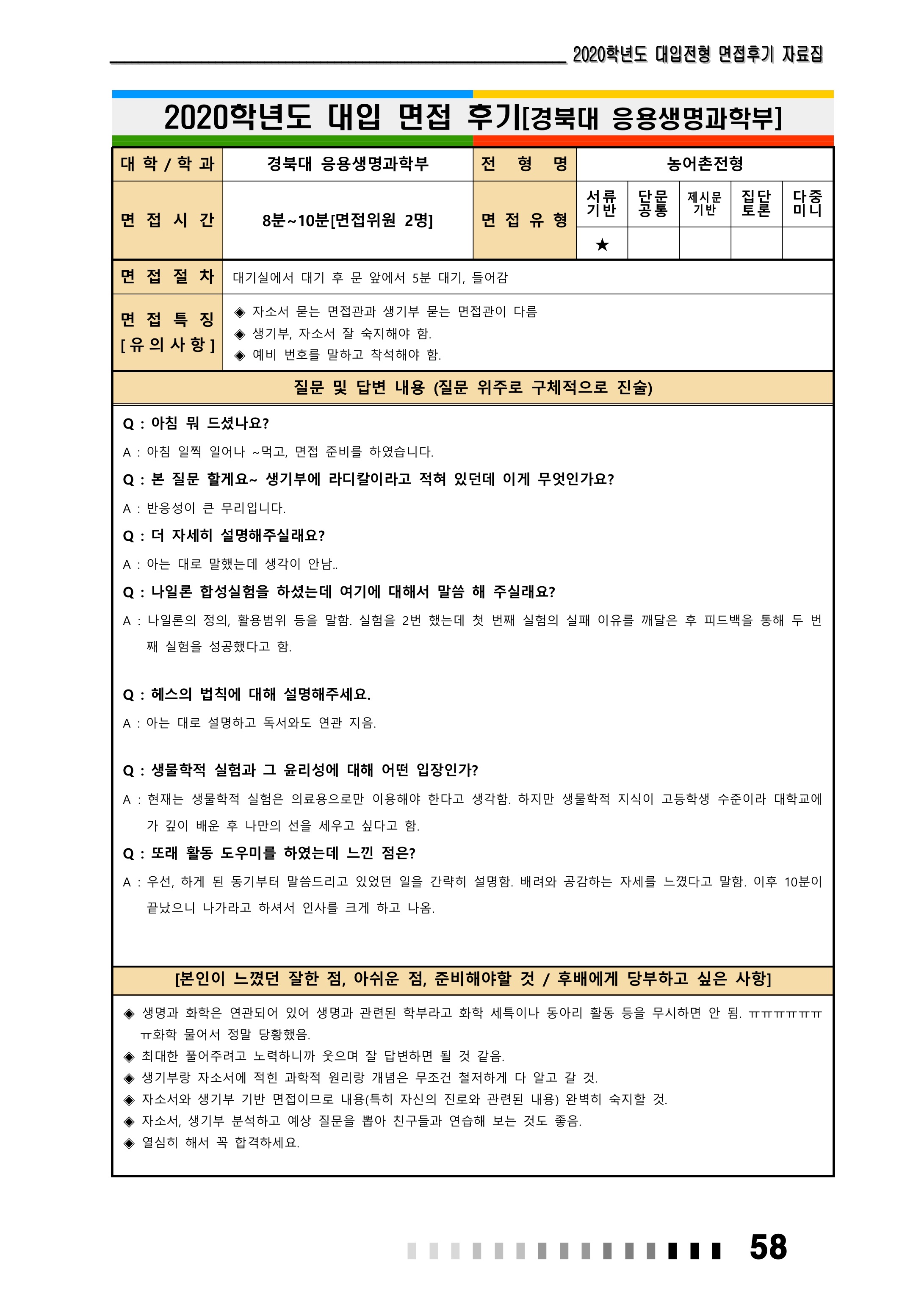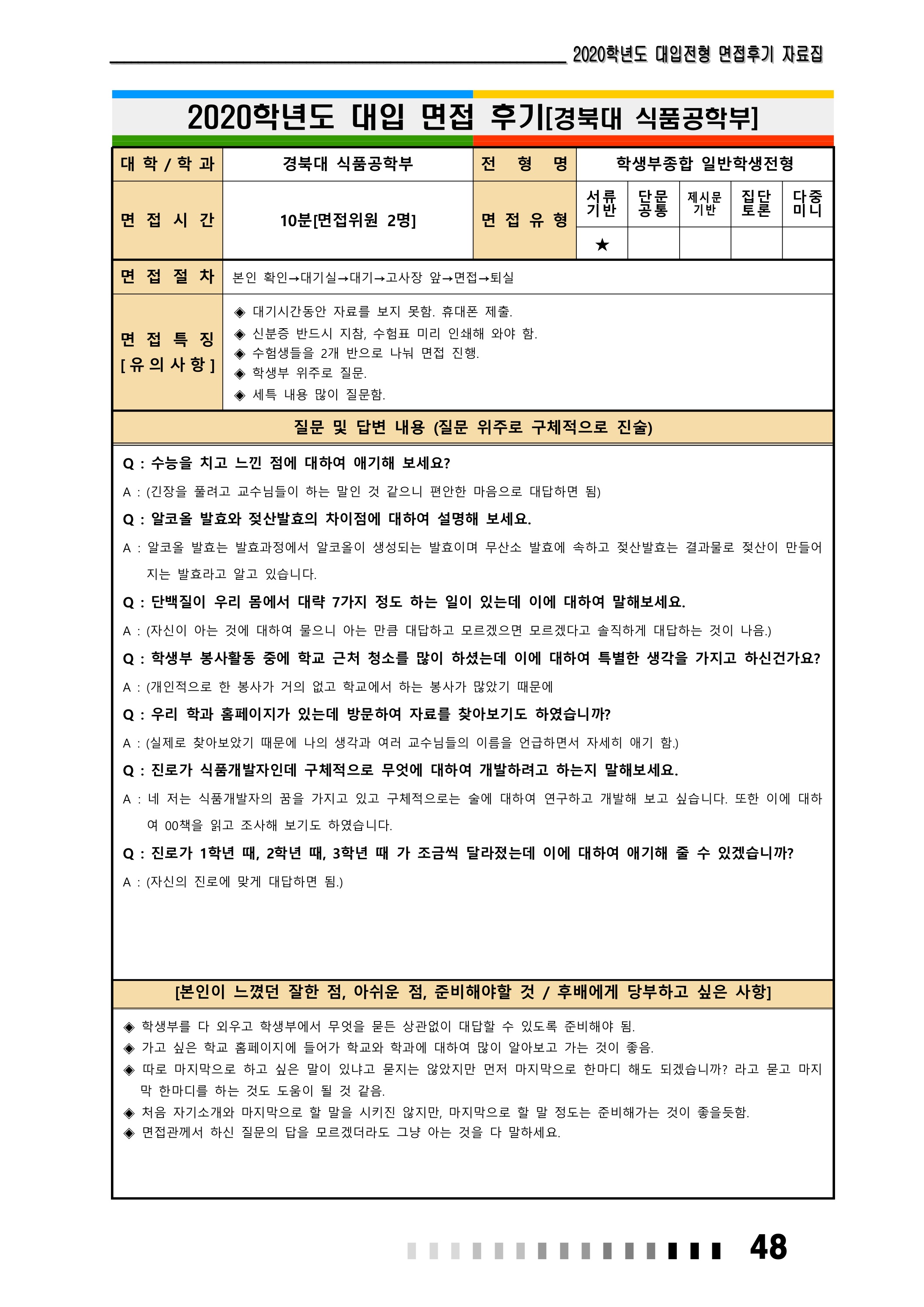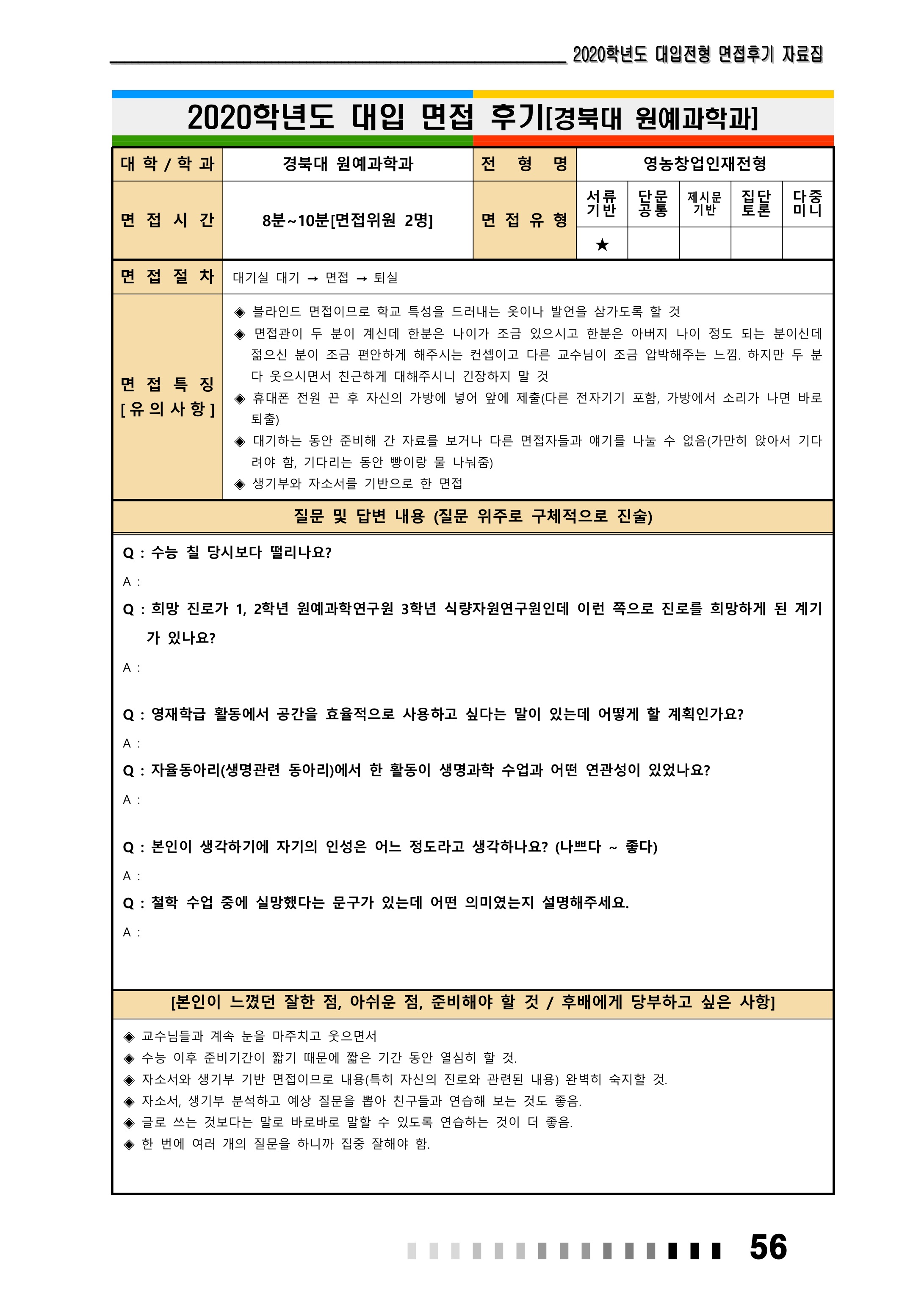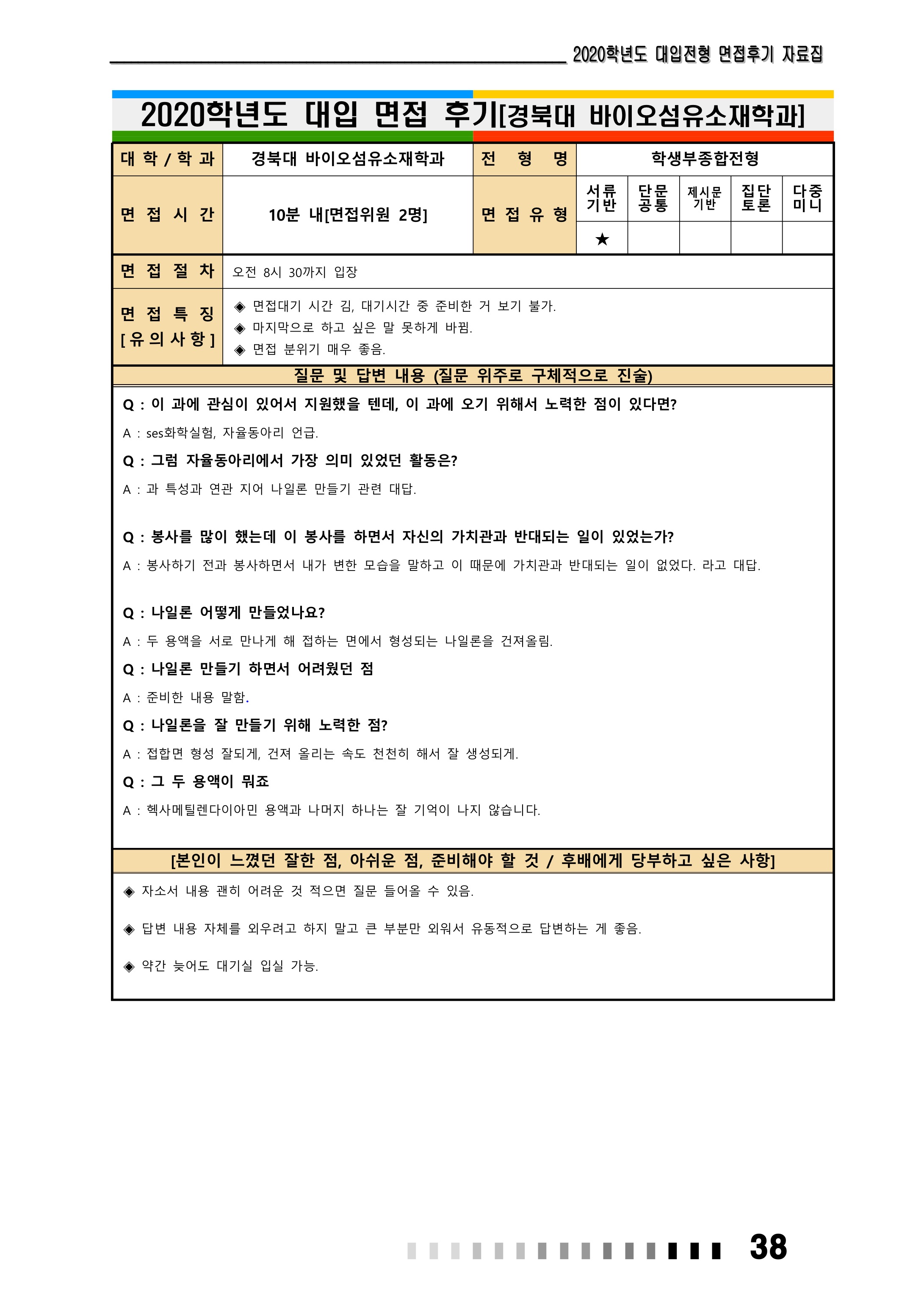 2021학년도 경북대학교 면접 후기80 - 응용생명과학부 2021학년도 경북대학교 면접 후기81 - 응용화학공학부