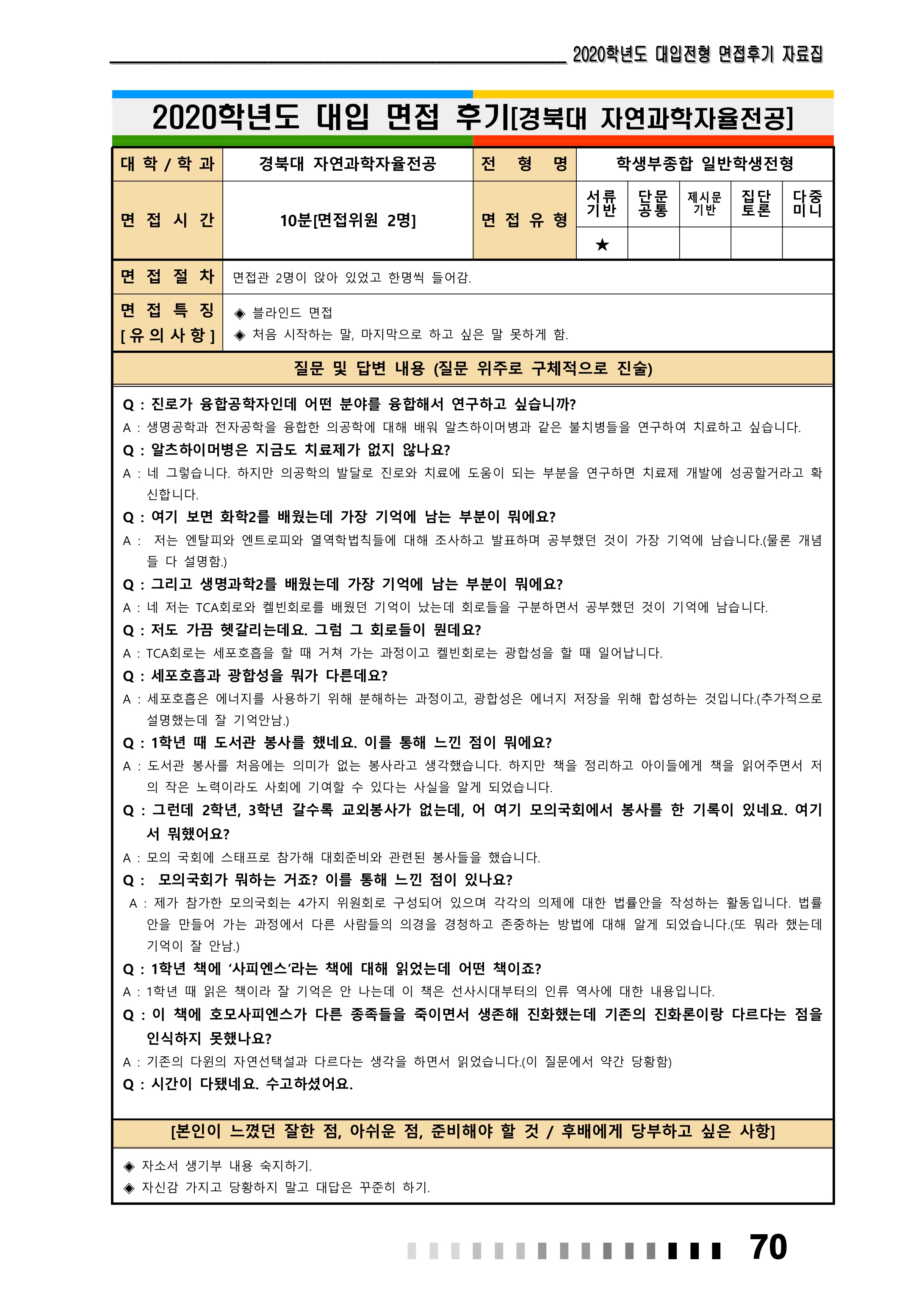 2021학년도 경북대학교 면접 후기95 - 자연과학자율전공 2021학년도 경북대학교 면접 후기96 - 자연과학자율전공