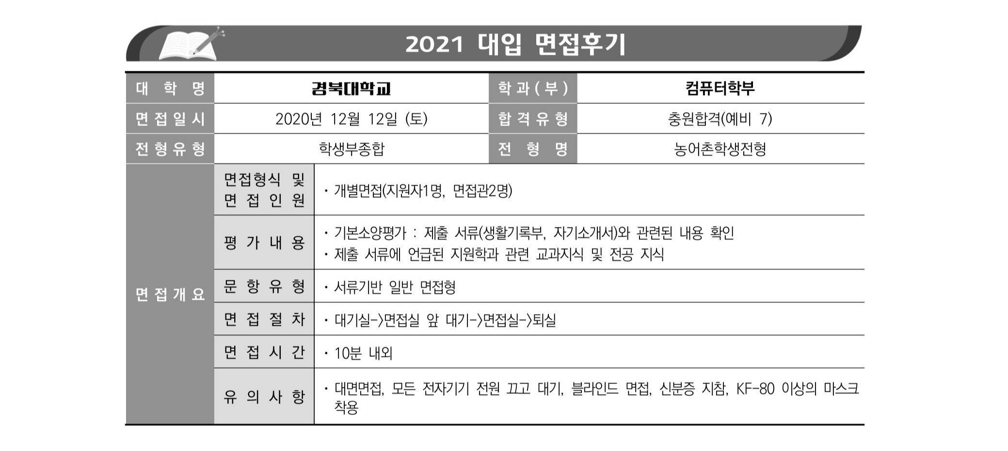 2021학년도 경북대학교 면접 후기115 - 컴퓨터학부 2021학년도 경북대학교 면접 후기116 - 컴퓨터학부