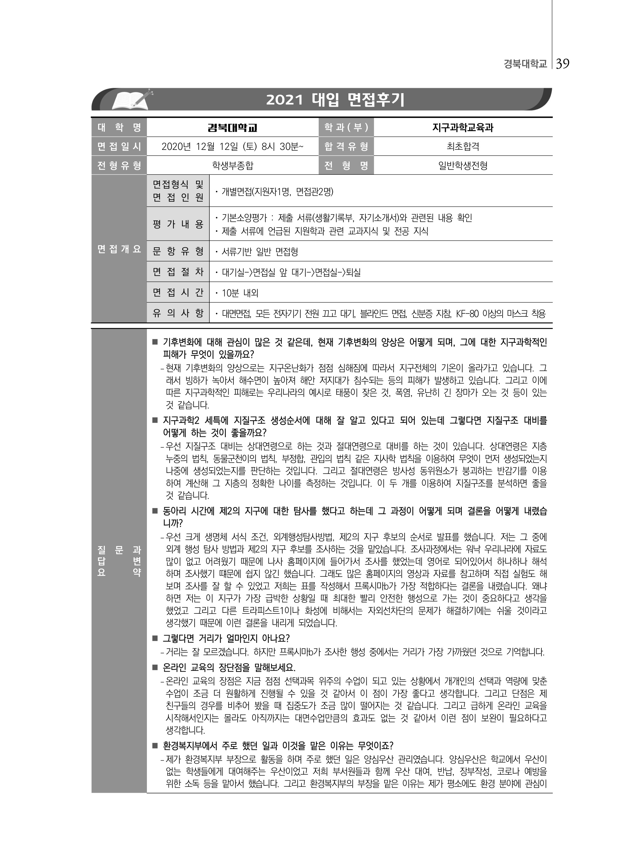 2021학년도 경북대학교 면접 후기107 - 지구시스템과학부 2021학년도 경북대학교 면접 후기108 - 지구시스템과학부