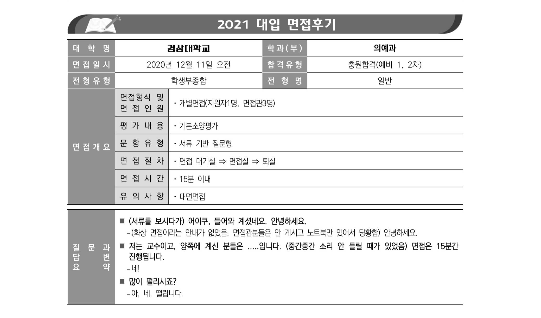 2021학년도 경상국립대학교 면접 후기23 - 의예과