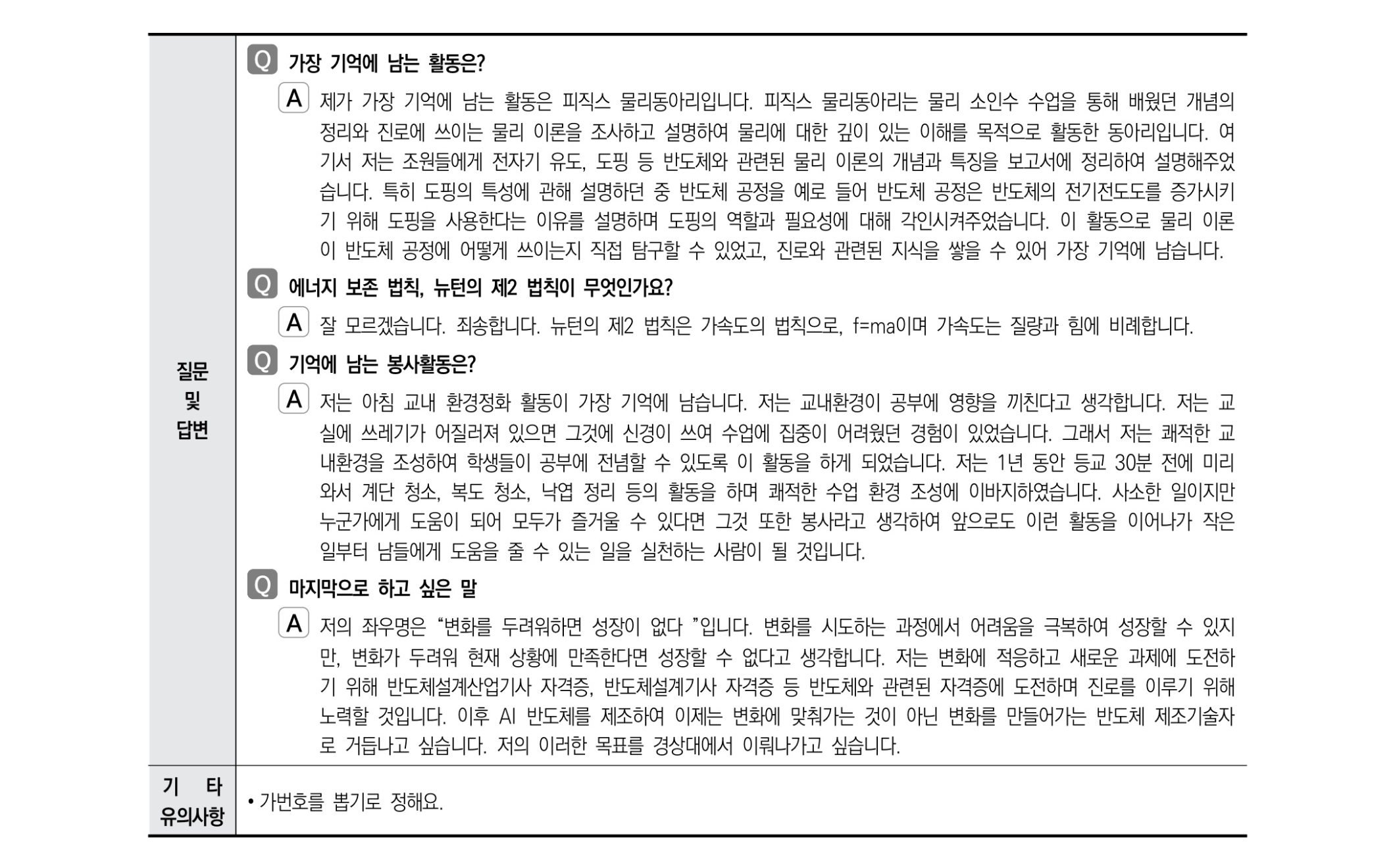 - 고등학교 재학 기간 중 인상 깊었던 점은 무엇인가요?