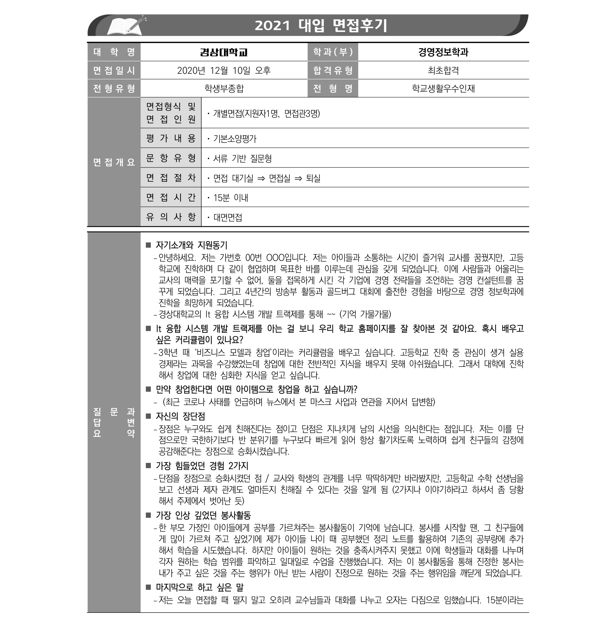 2021학년도 경상국립대학교 면접 후기3 - 경영정보학과