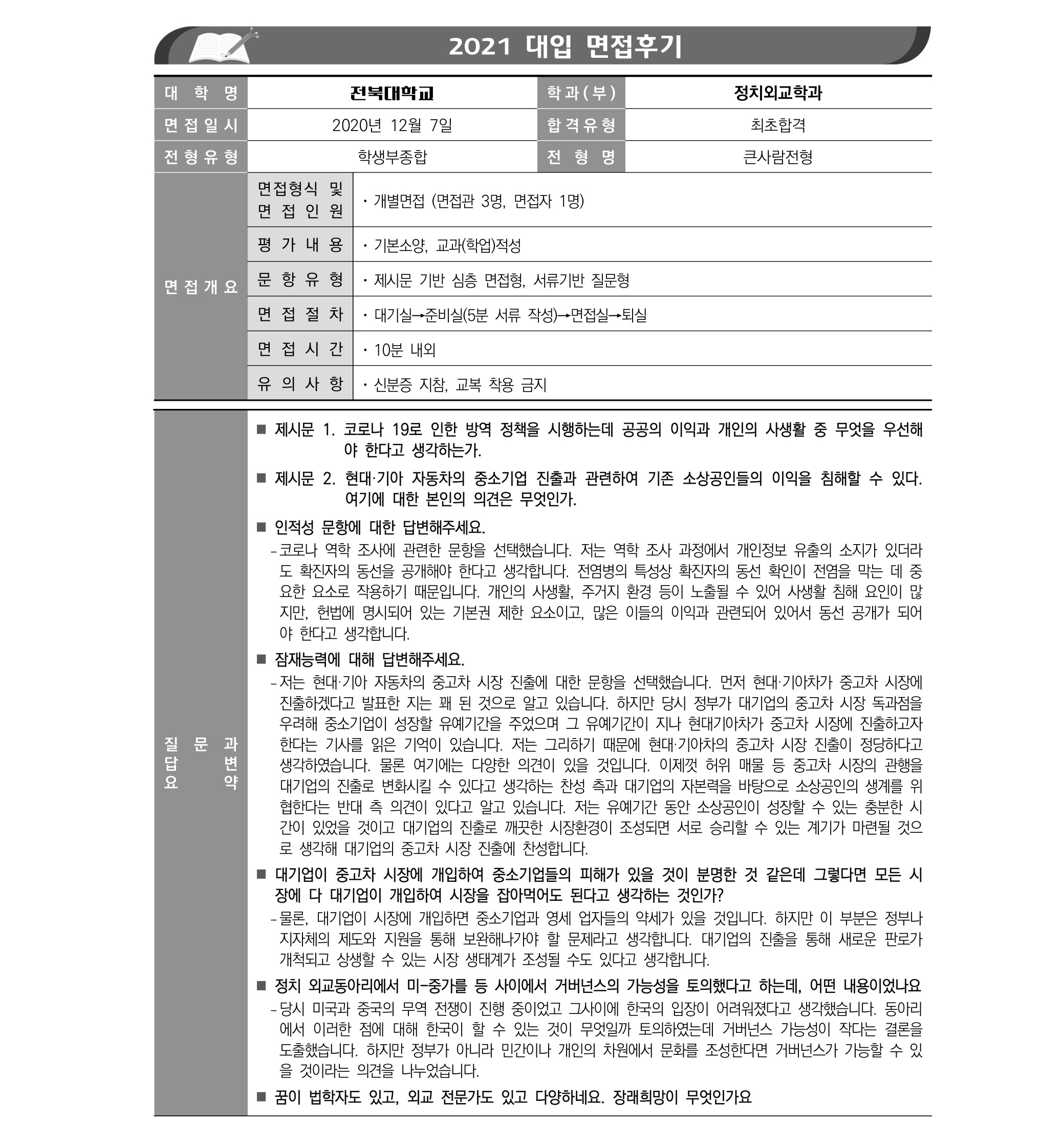 2021학년도 전남대학교 면접 후기15 - 정치외교학과