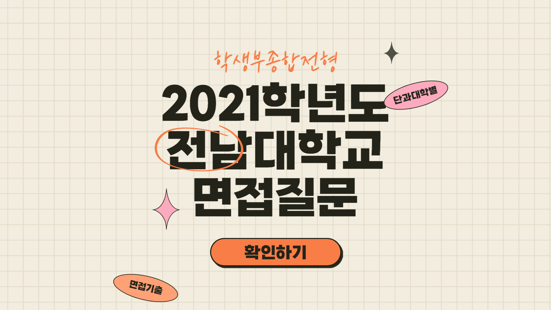 횐님들 안녕하세영! 오늘은 2022학년도 전남대학교 수시전형에서 출제된 면접 질문에 대해서 알아볼 거예영. 전남대 학생부교과 만학도전형, 특성화고졸재직자전형, 특수교육대상자전형과 학생