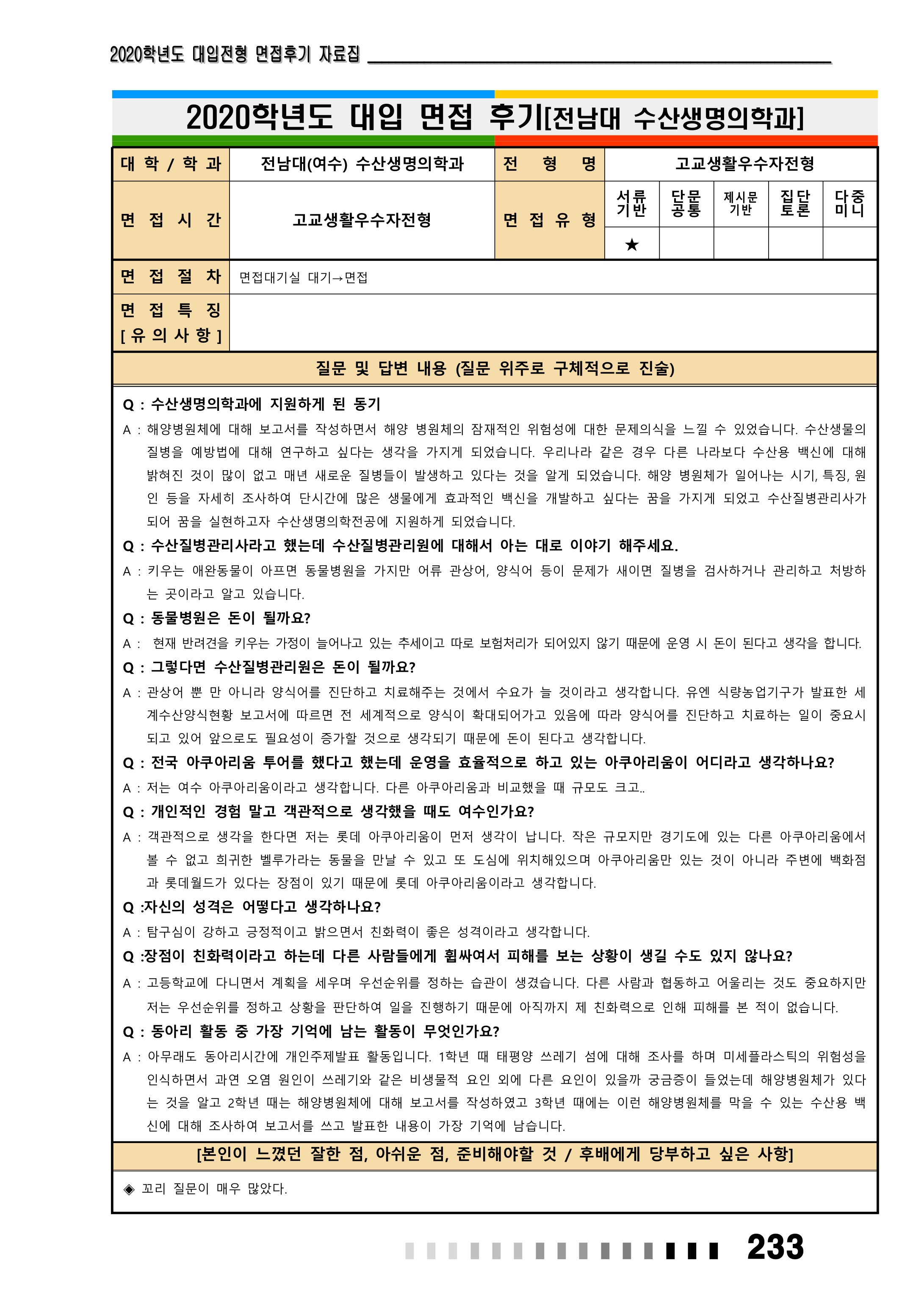 2021학년도 전남대학교 면접 후기5 - 수산생명의학과 2021학년도 전남대학교 면접 후기6 - 수의예과