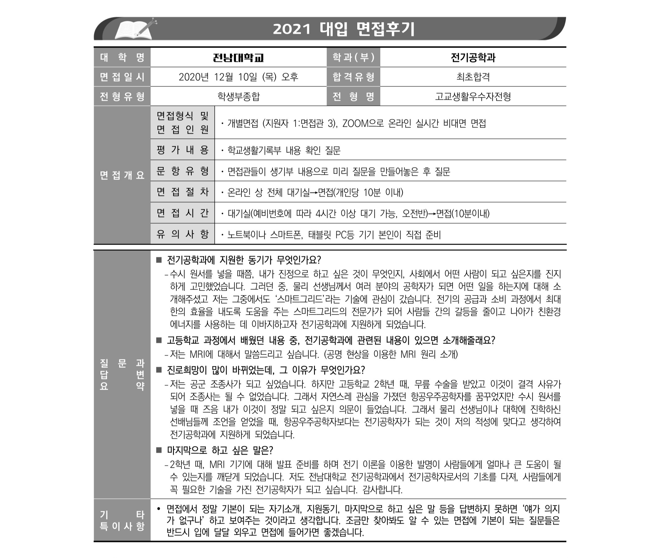 2021학년도 전남대학교 면접 후기12 - 일어일문학과 2021학년도 전남대학교 면접 후기13 - 전기공학과
